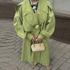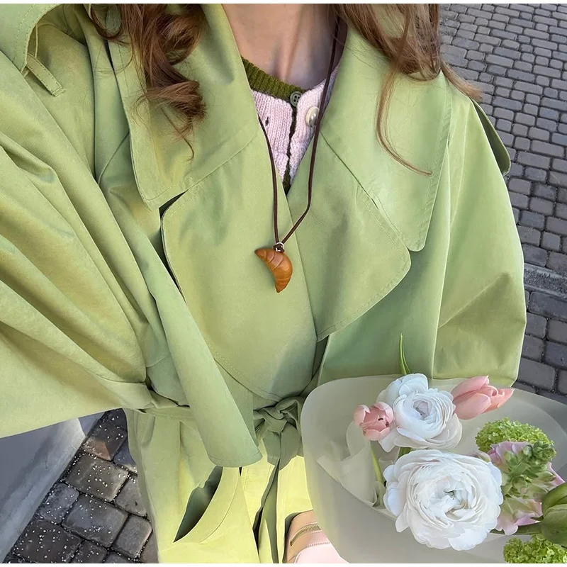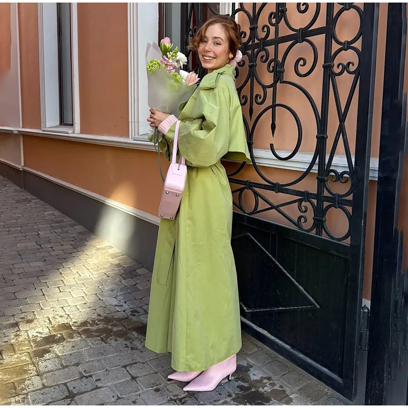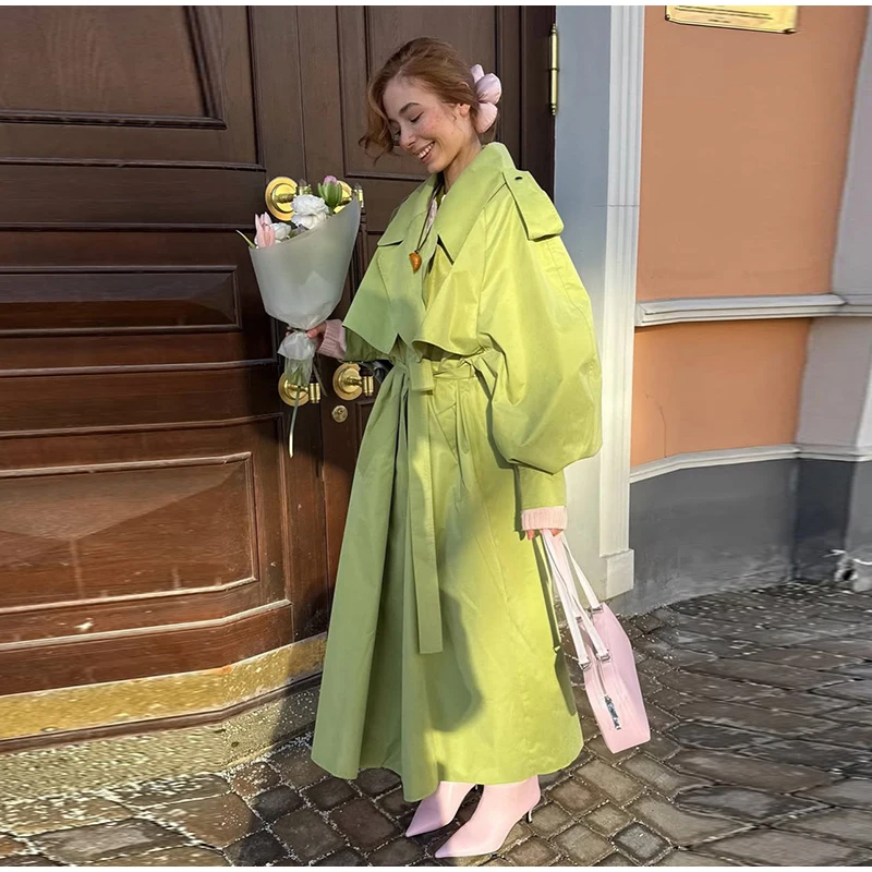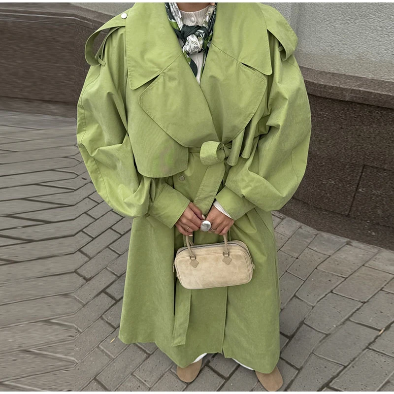 Elegant Green Trench Long Coats Women Loose Lapel Lace Up Buttons Full Sleeves Jackets Female 2025 Autumn Vibrant Lady Outwears