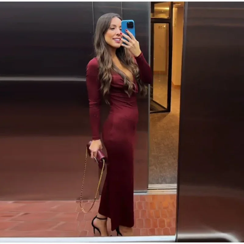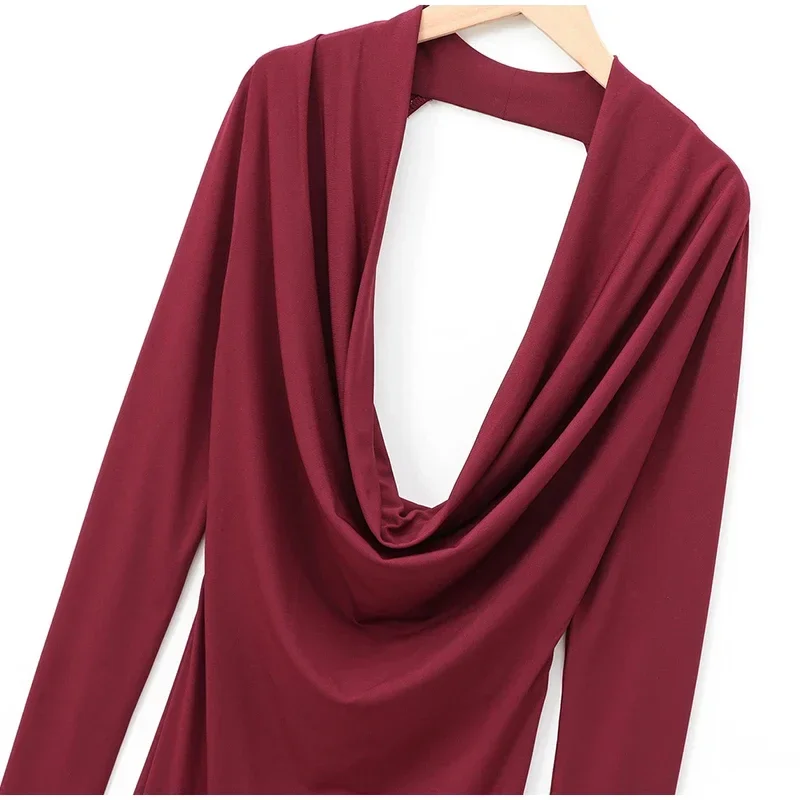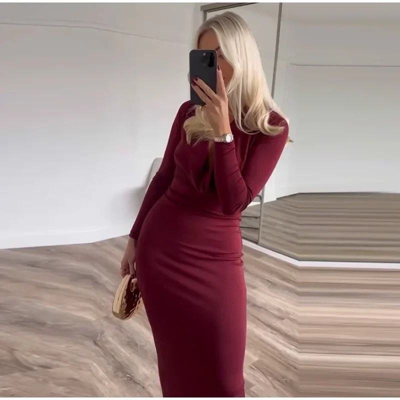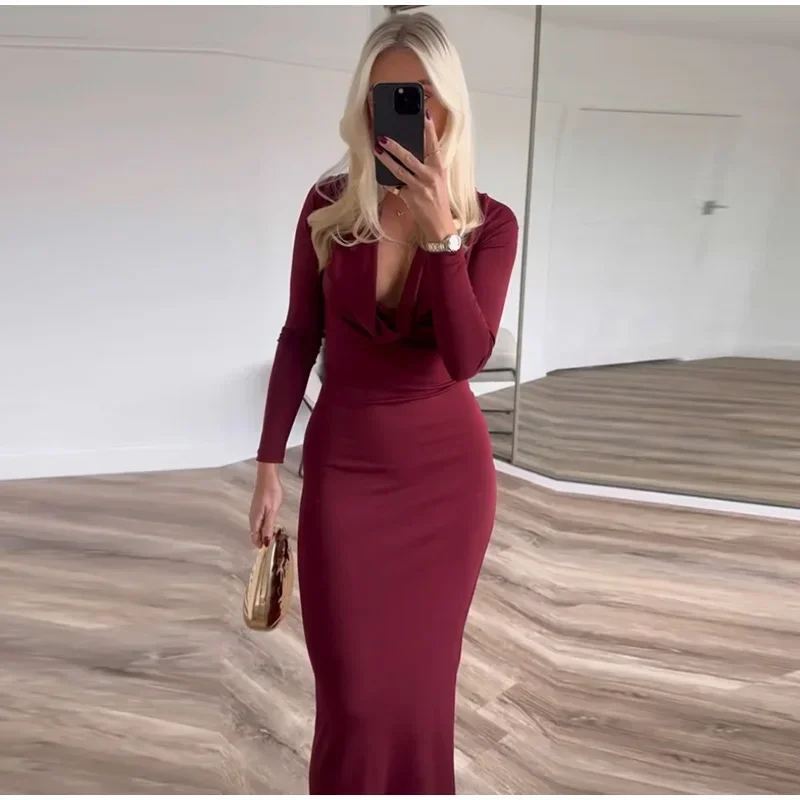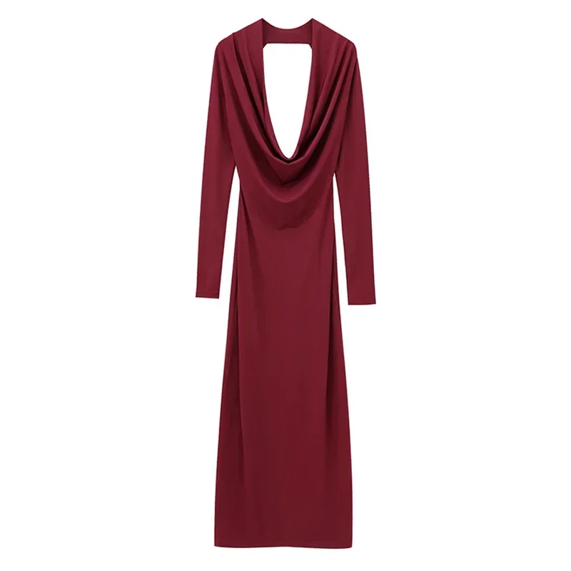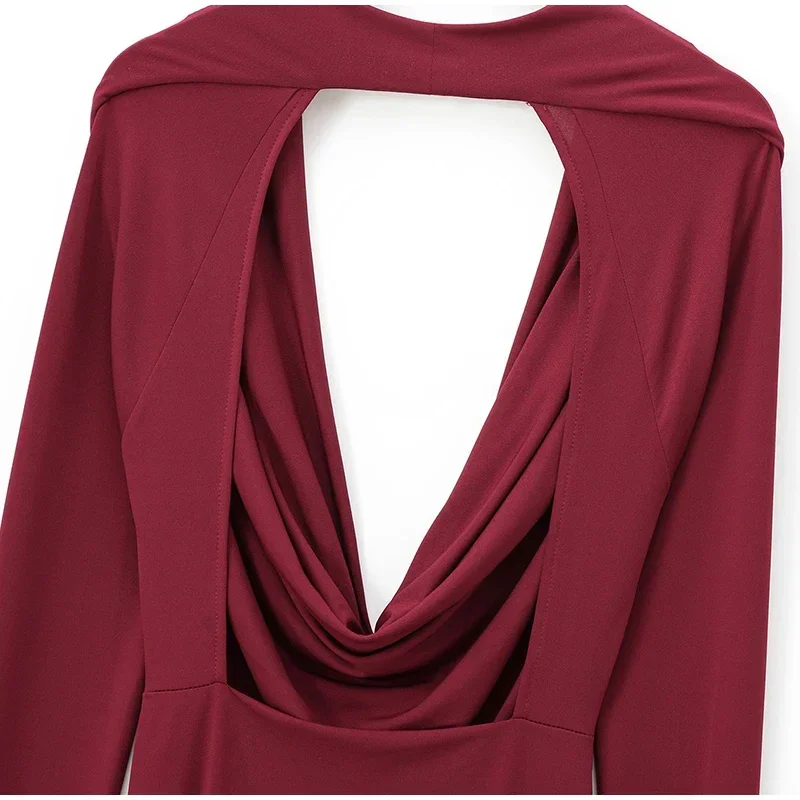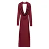 Elegant Hang Neck Burgundy Long Party Dress Women Halter Full Sleeve Maxi Dresses 2024 Autumn Lady Slim Hip Package Gowns New