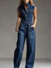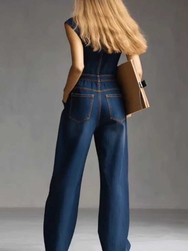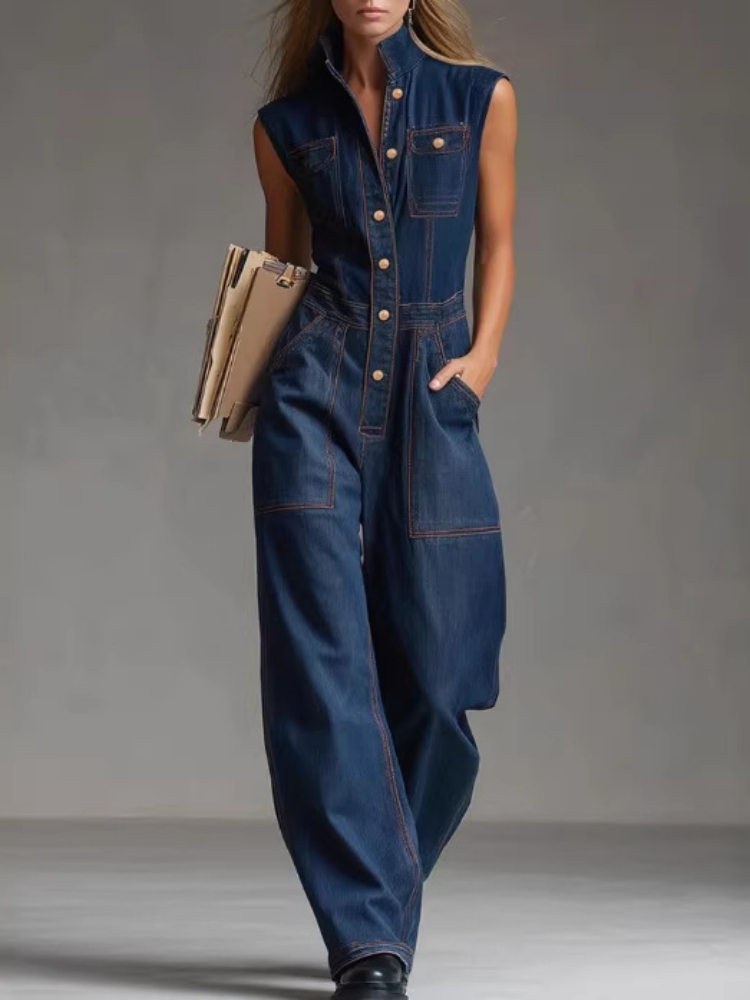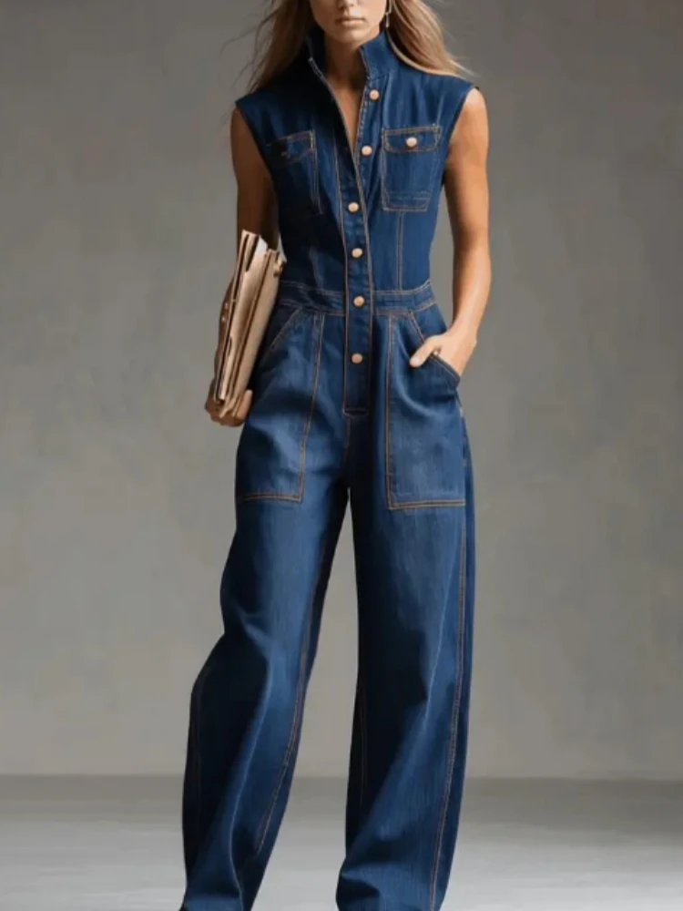 Elegant High Street Denim Jumpsuit Casual Sleeveless Stand Collar Pockets Loose Party Playsuits Fashion Single-breasted Romper