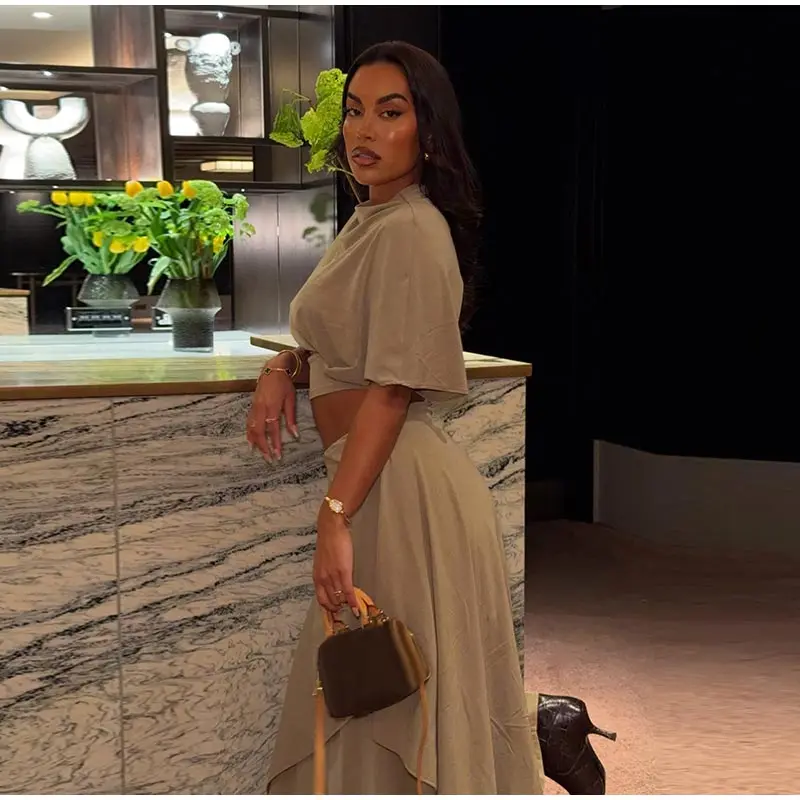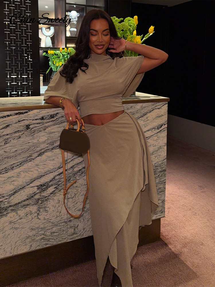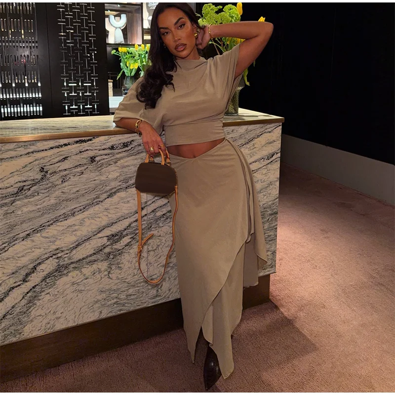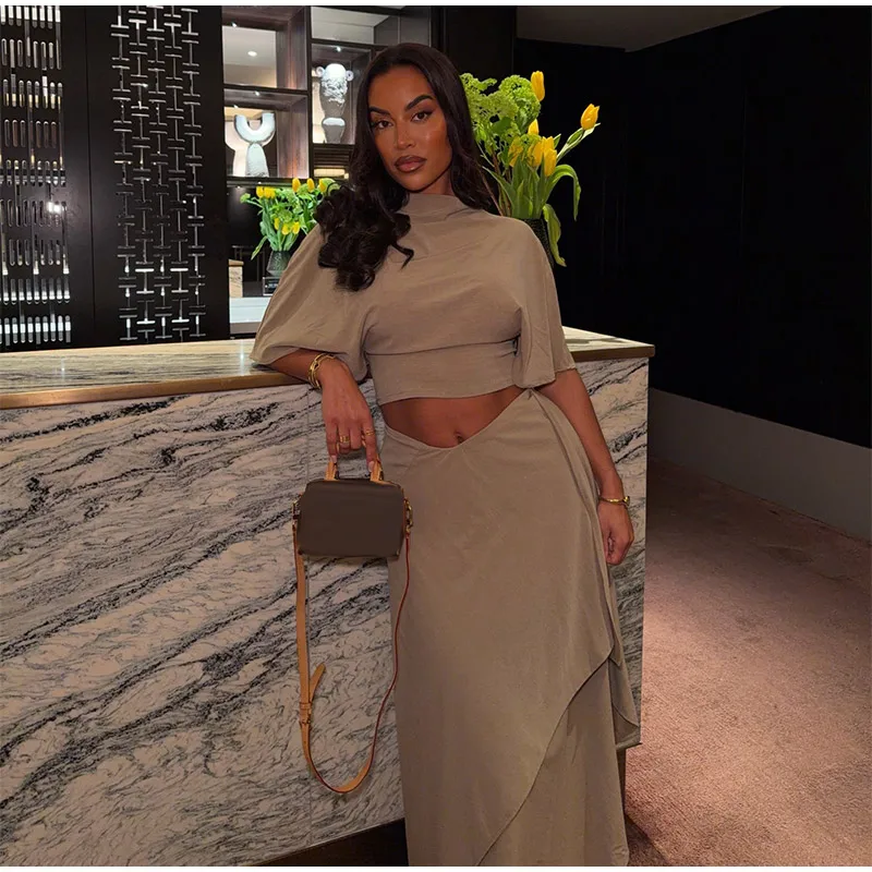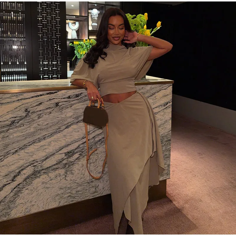 Elegant Irregular Hem Skirt Suit Women Short Sleeve Waist Cinching Cropped Top 2 Pieces Sets Lady New Casual Fashion Outfit 2026