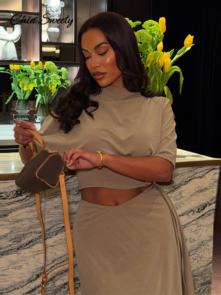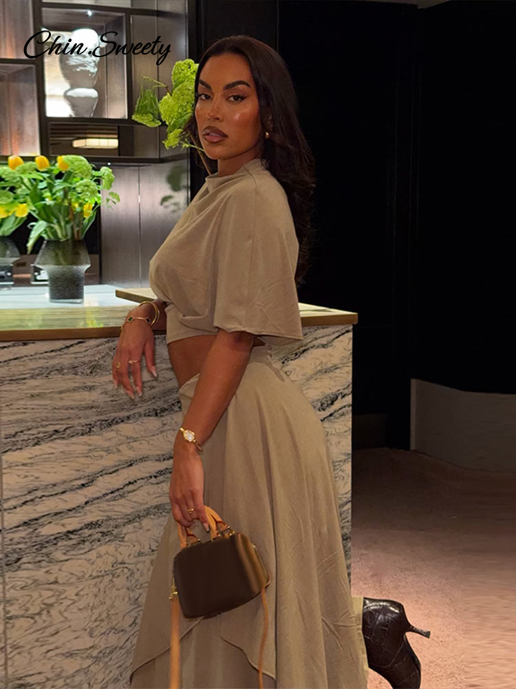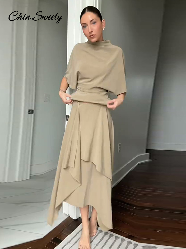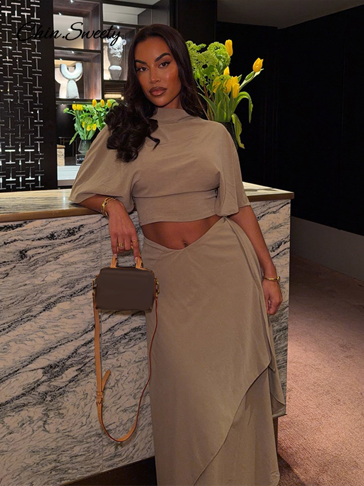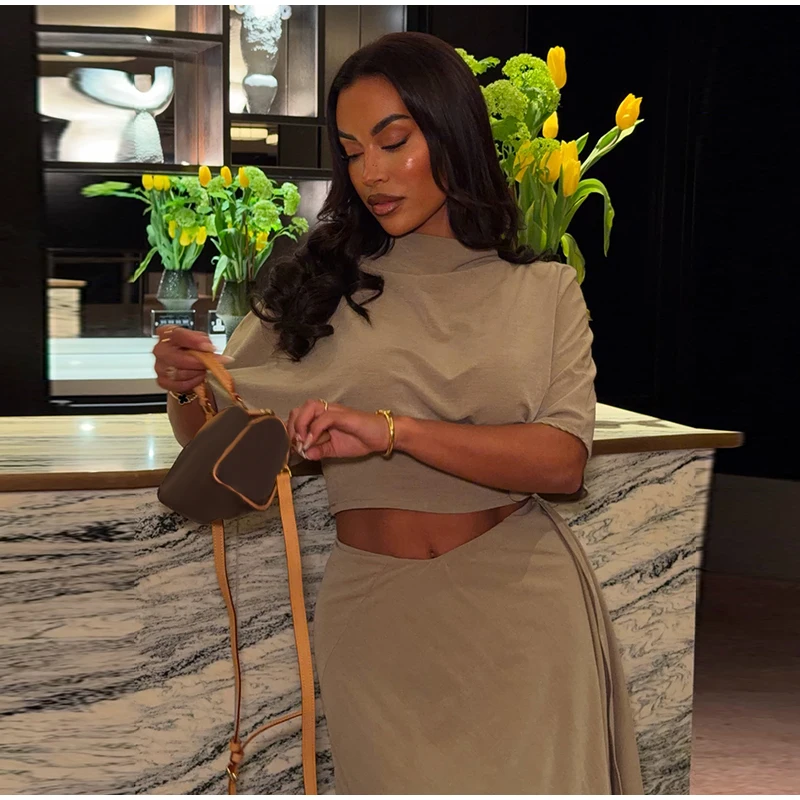 Elegant Irregular Hem Skirt Suit Women Short Sleeve Waist Cinching Cropped Top 2 Pieces Sets Lady New Casual Fashion Outfit 2026