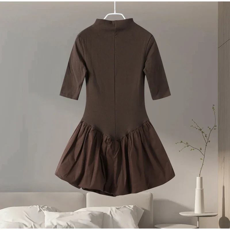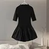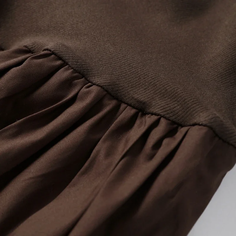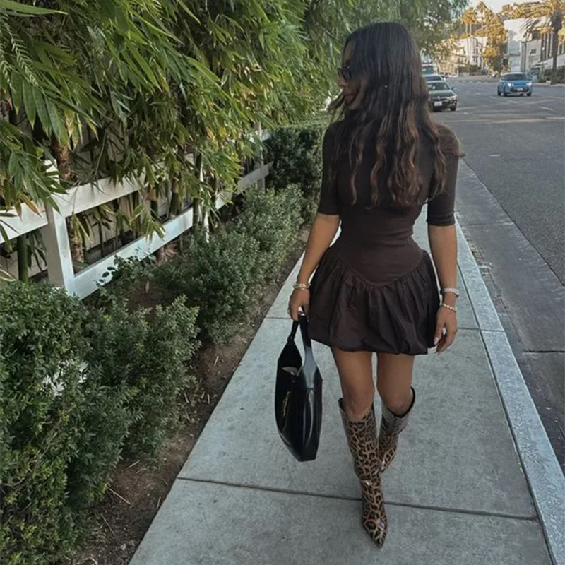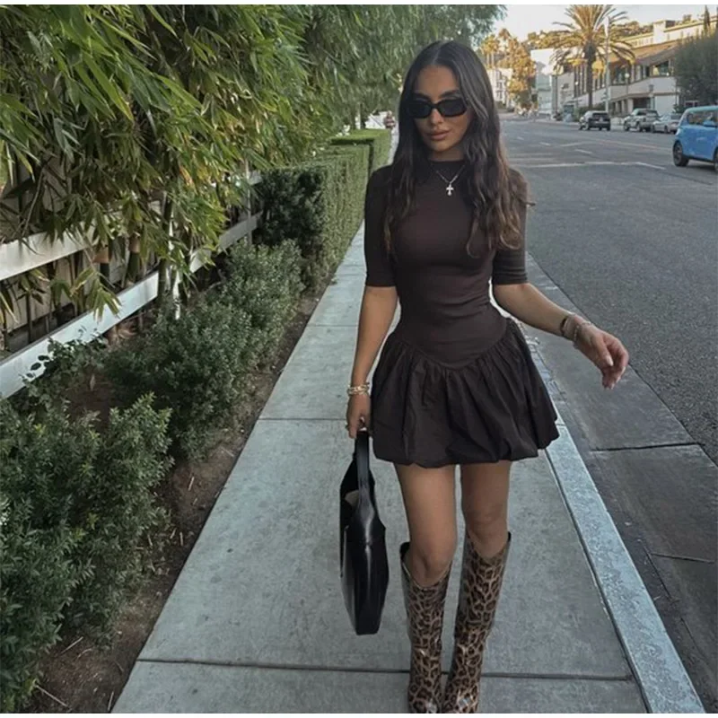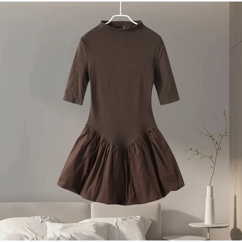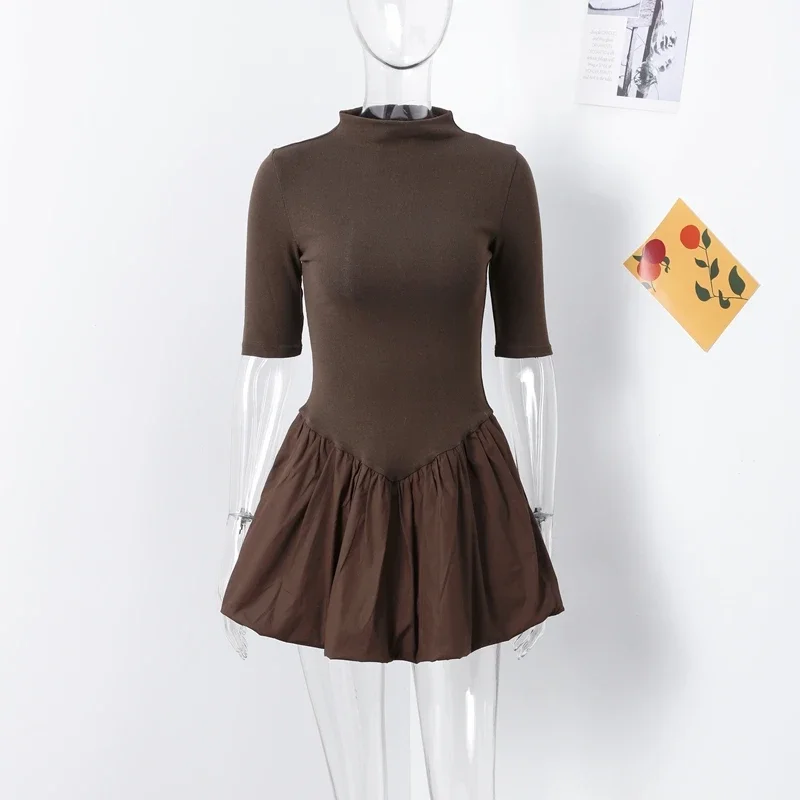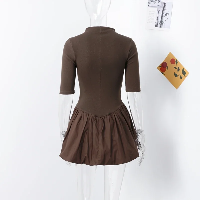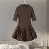 Elegant Knitted Patchwork Brown A-line Dress Women O-neck Short Sleeves Pleated Ruffles Mini Dresses 2025 Lady Solid Vestidos