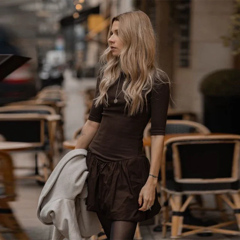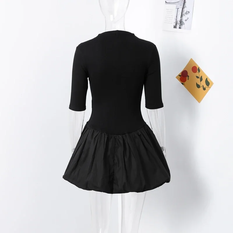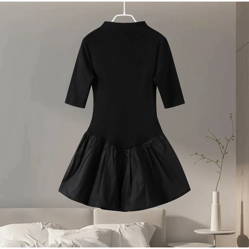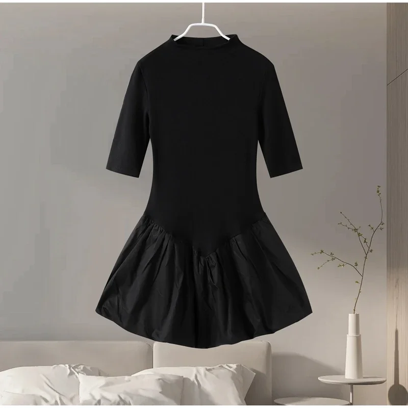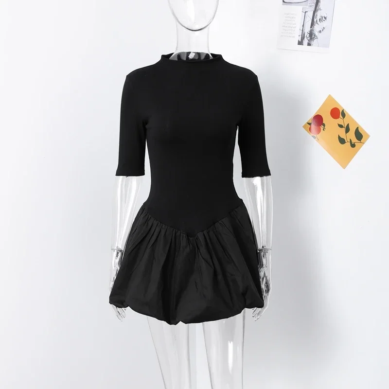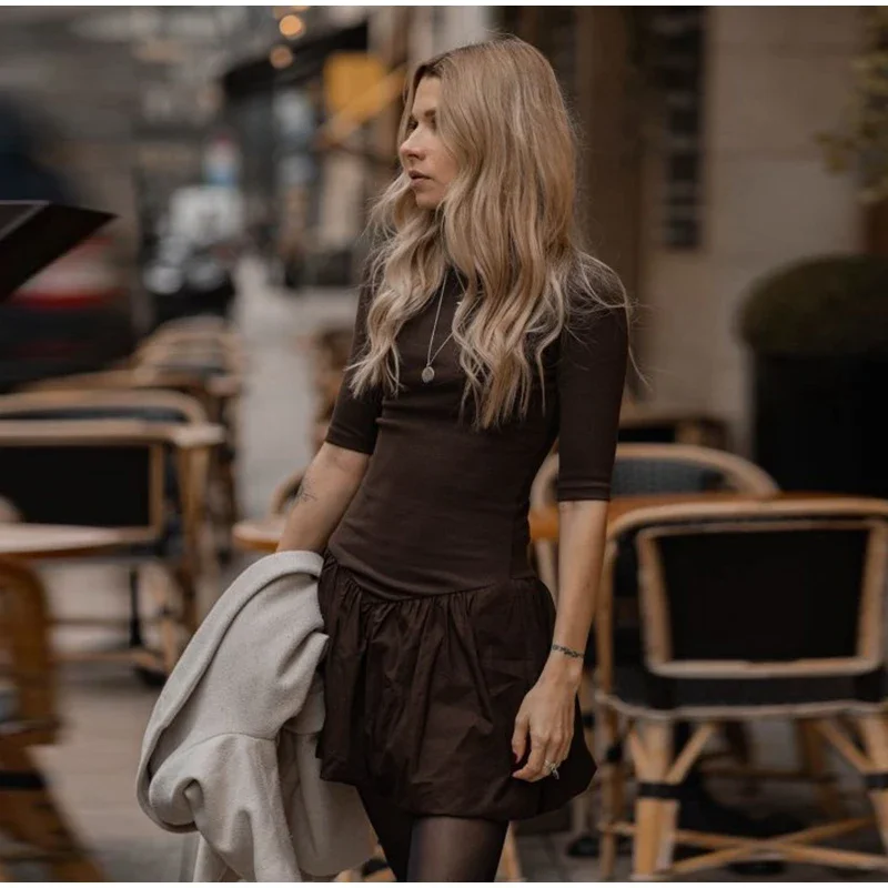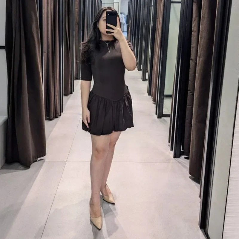 Elegant Knitted Patchwork Brown A-line Dress Women O-neck Short Sleeves Pleated Ruffles Mini Dresses 2025 Lady Solid Vestidos