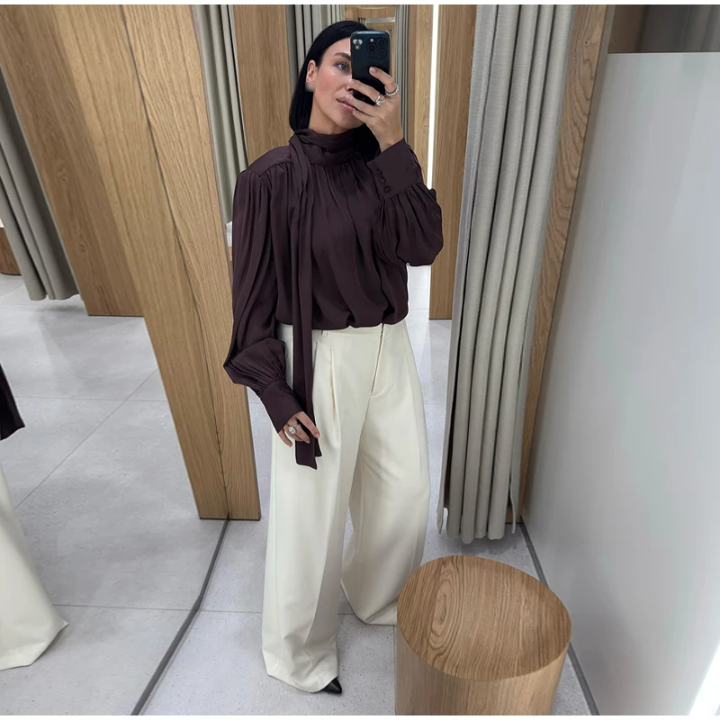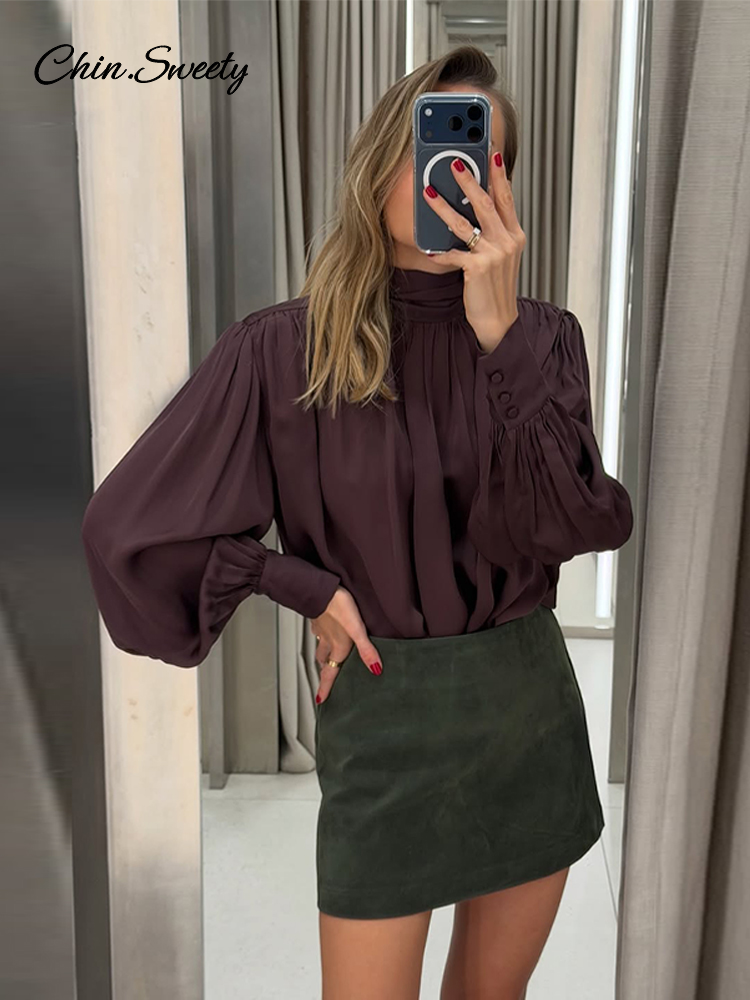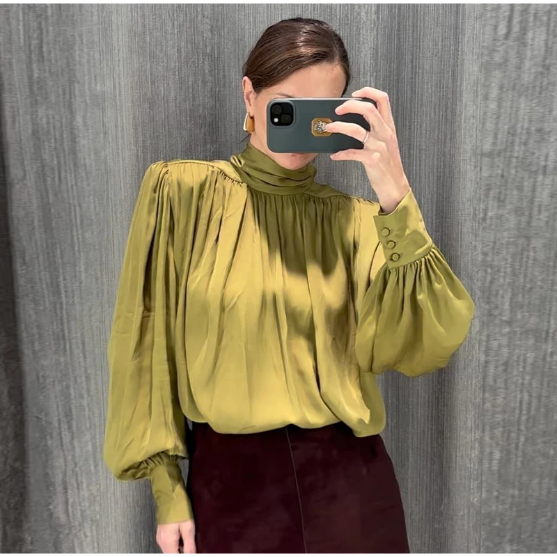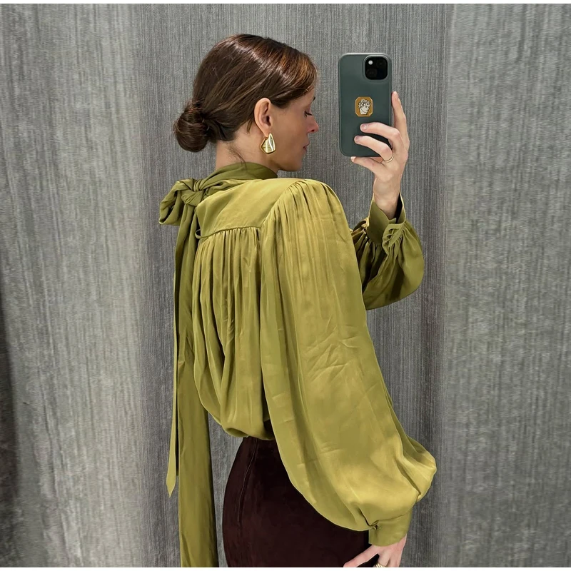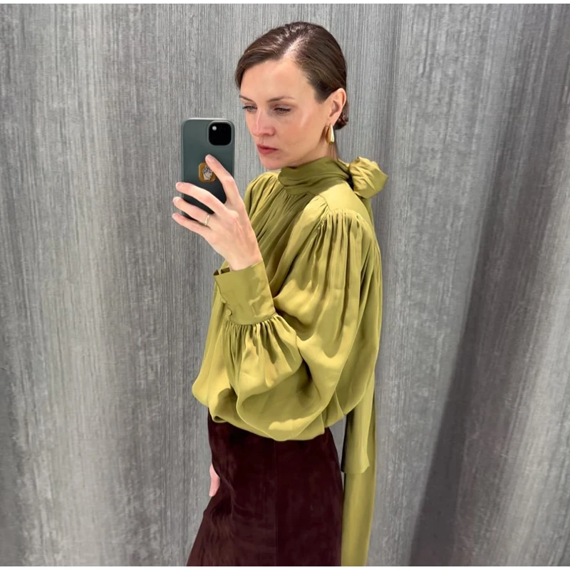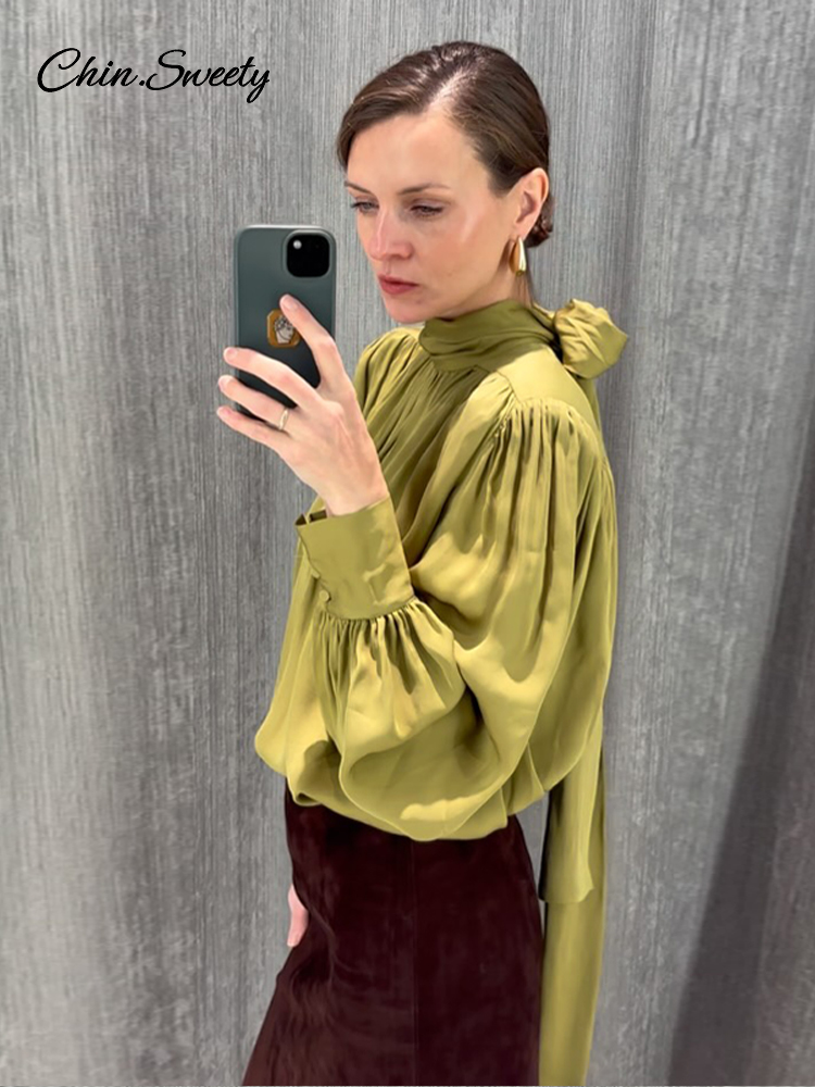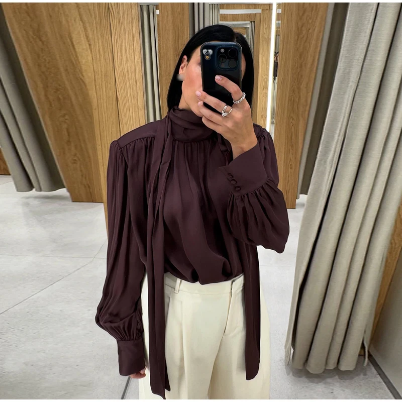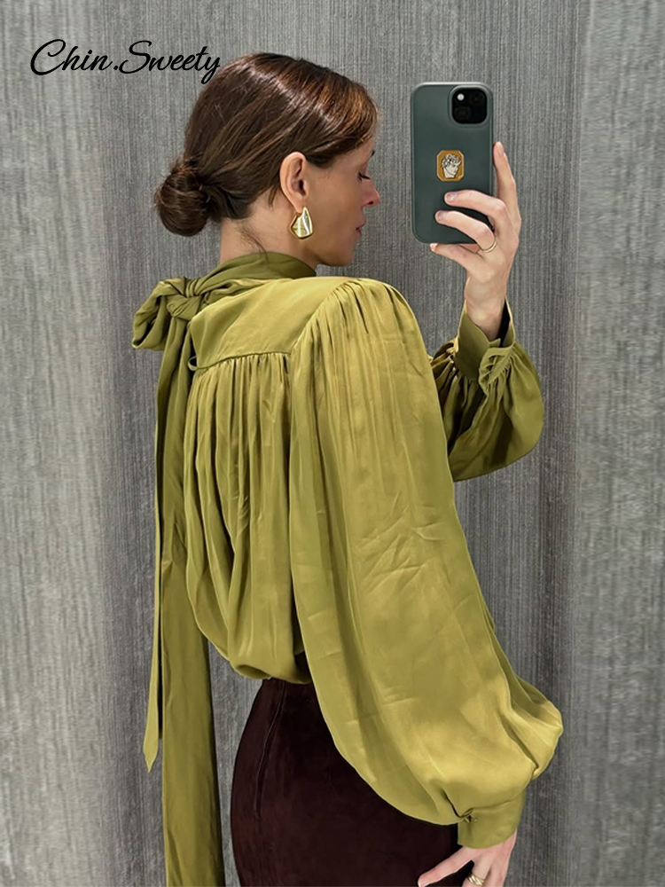 Elegant Lace Up Pleated Blouse Women Solid Shoulder Pad Lantern Sleeve Blouses Lady New Fashion Commute Spring Clothing 2026