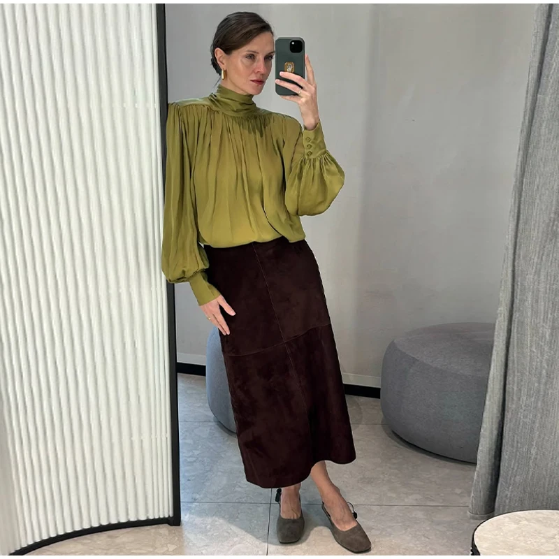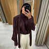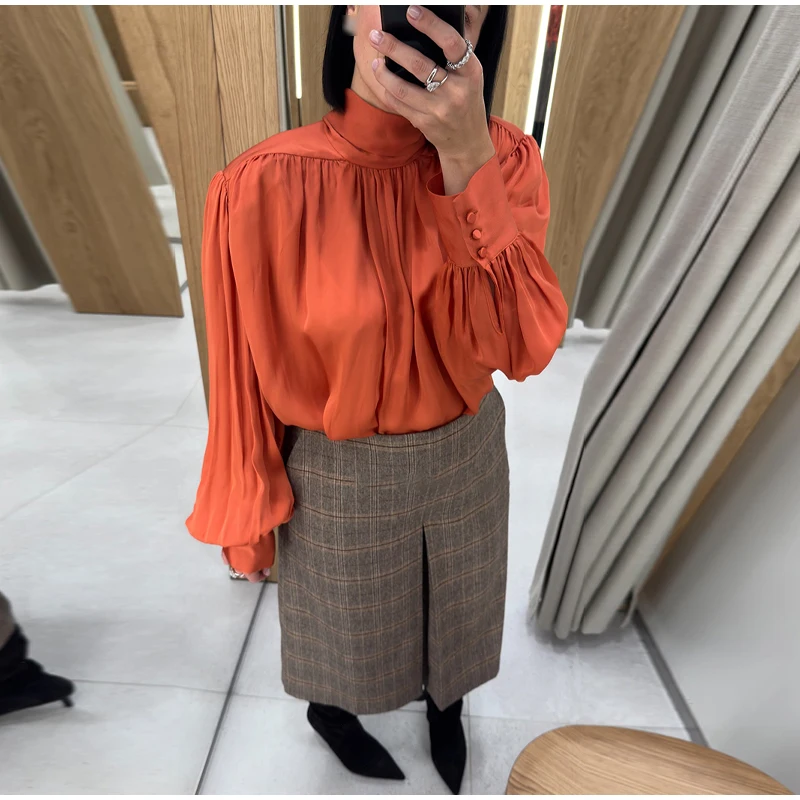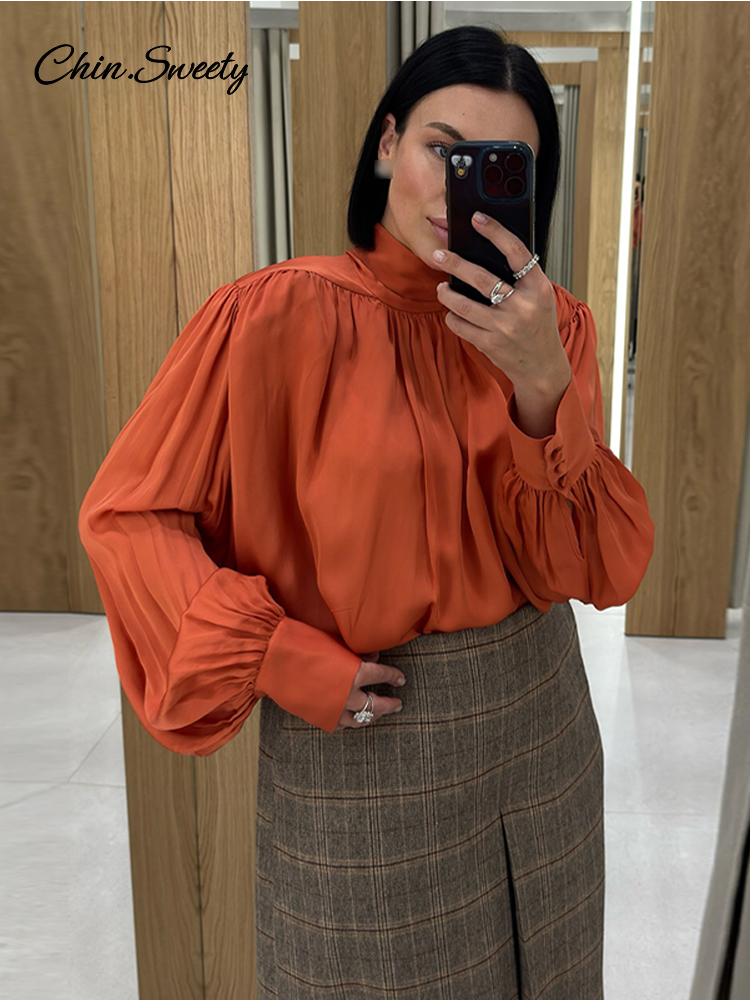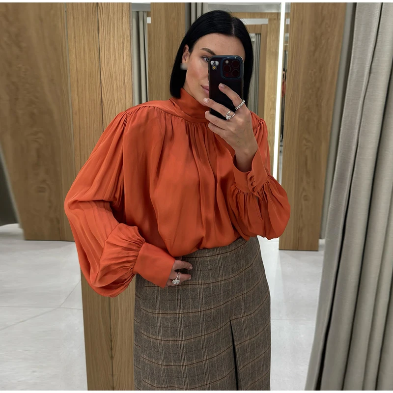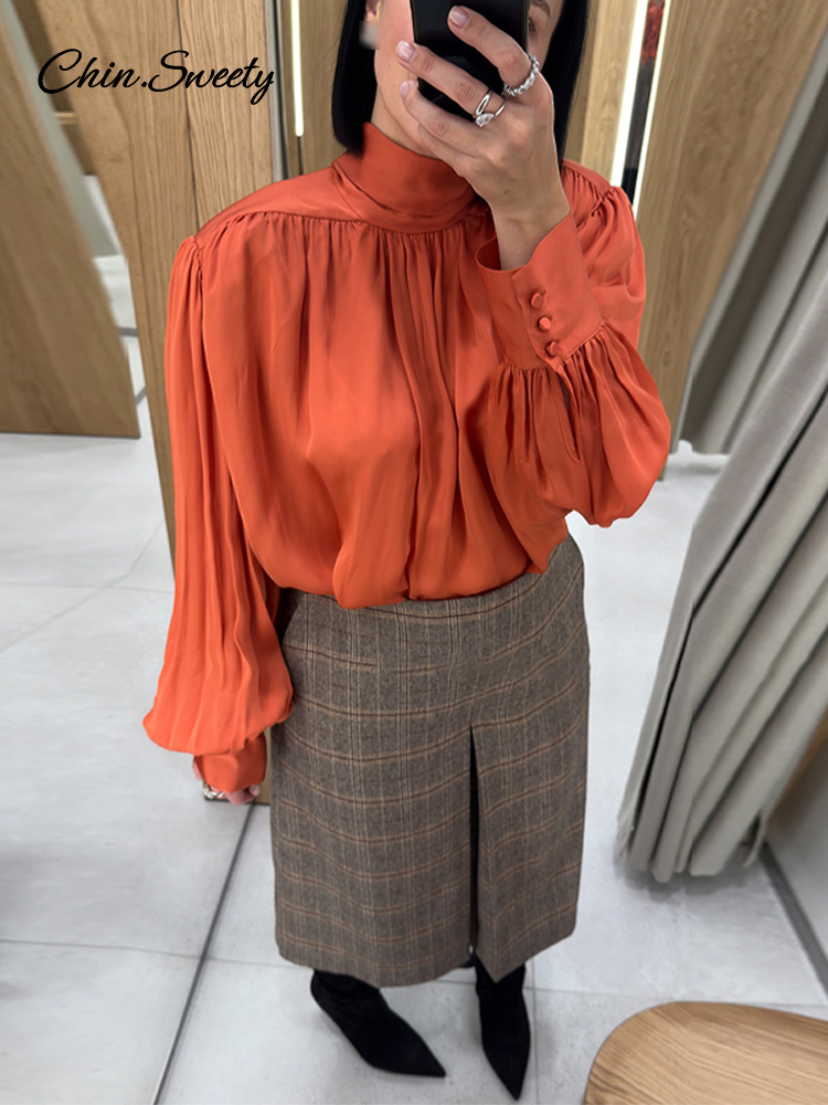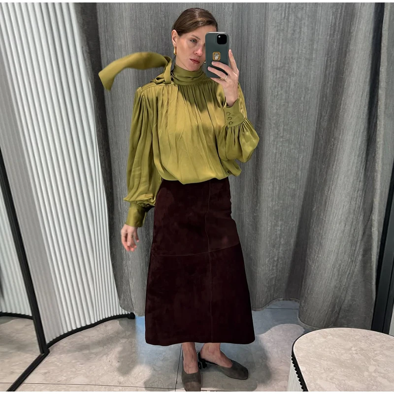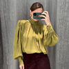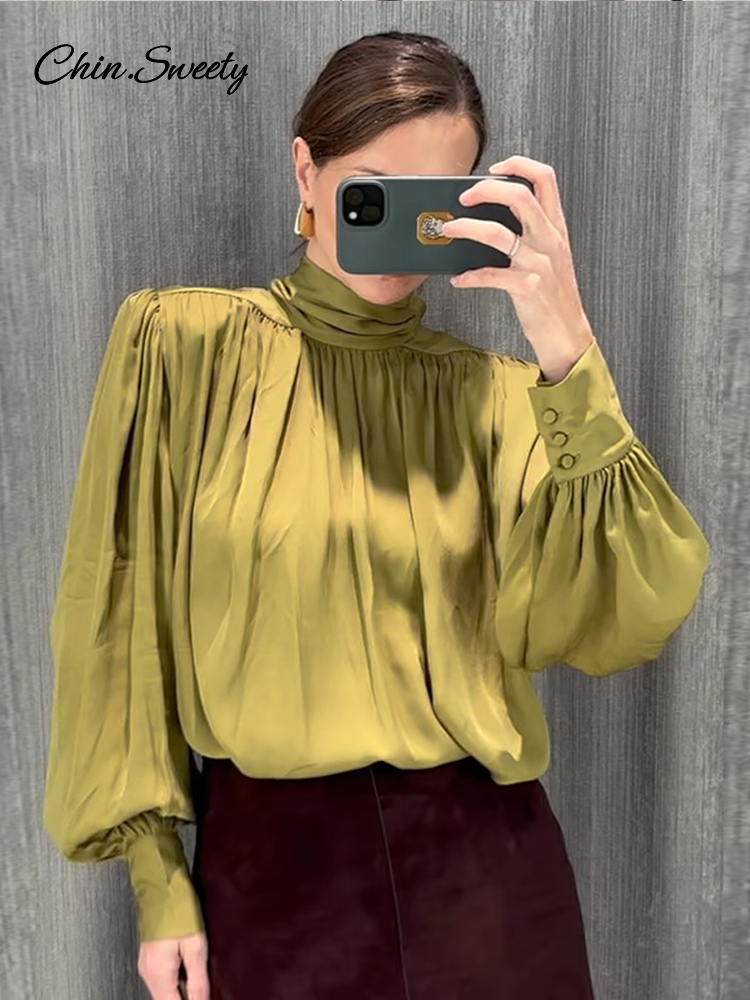 Elegant Lace Up Pleated Blouse Women Solid Shoulder Pad Lantern Sleeve Blouses Lady New Fashion Commute Spring Clothing 2026