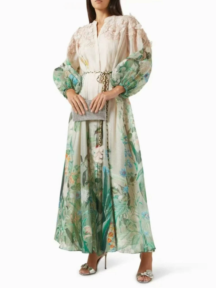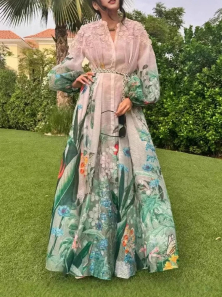 Elegant Maxi Dress for Women V Neck Lantern Sleeve High Waist Spliced Lace Up Colorblock Printed Single-breasted Dresses Female