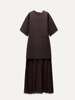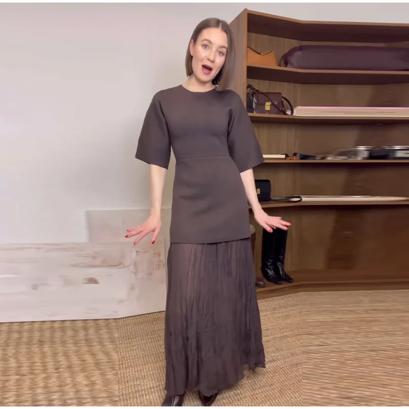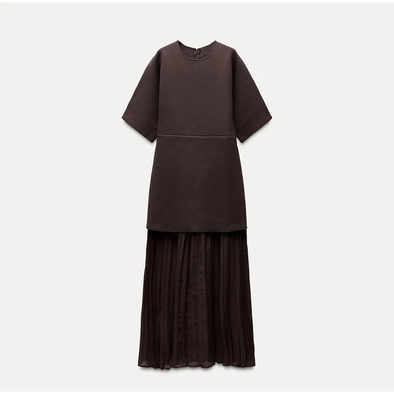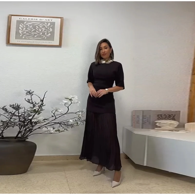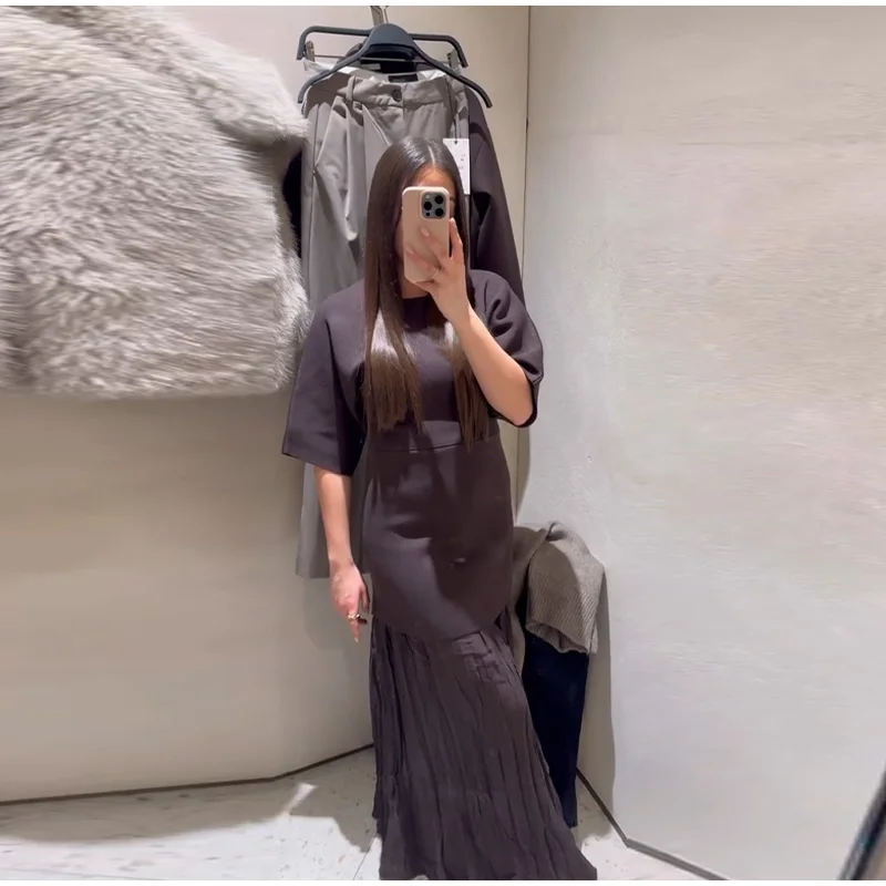 Elegant Patchwork Long Dress Women Brown Knitted O-neck Half Sleeve Slim Pleat Dresses 2025 Spring Summer Lady High Street Robes