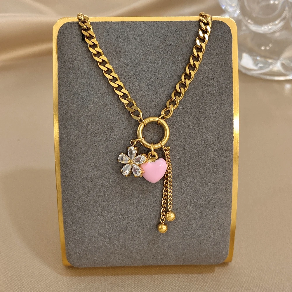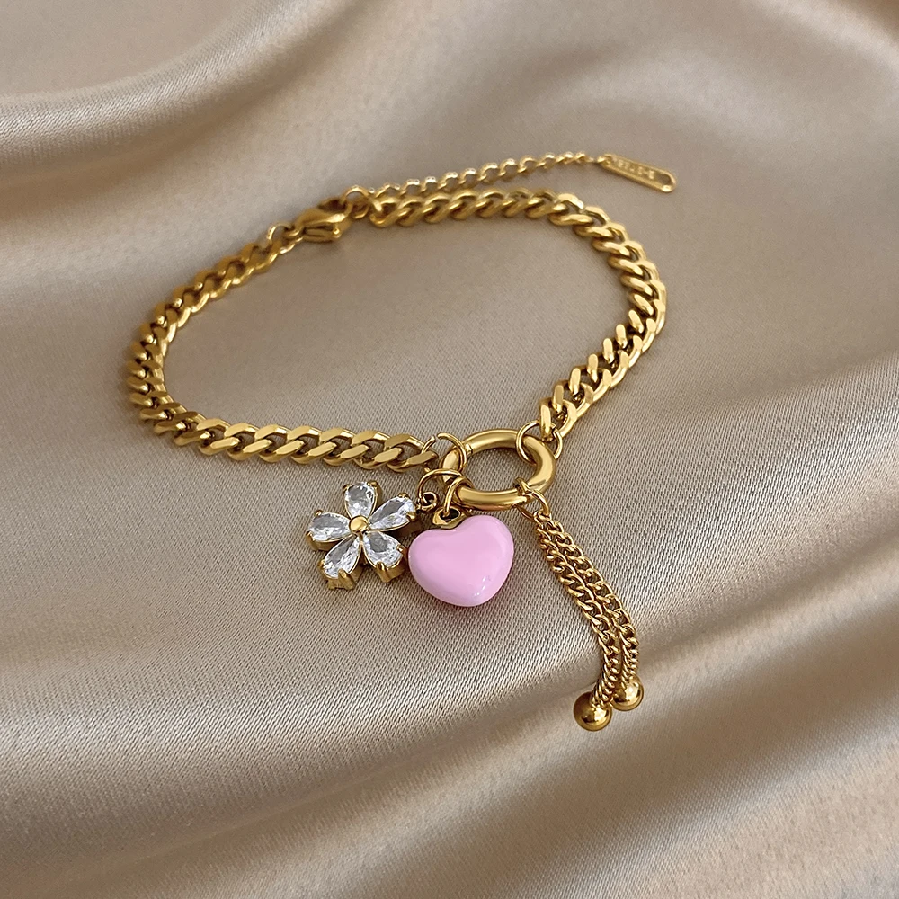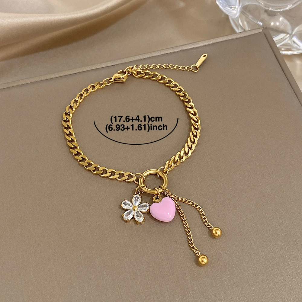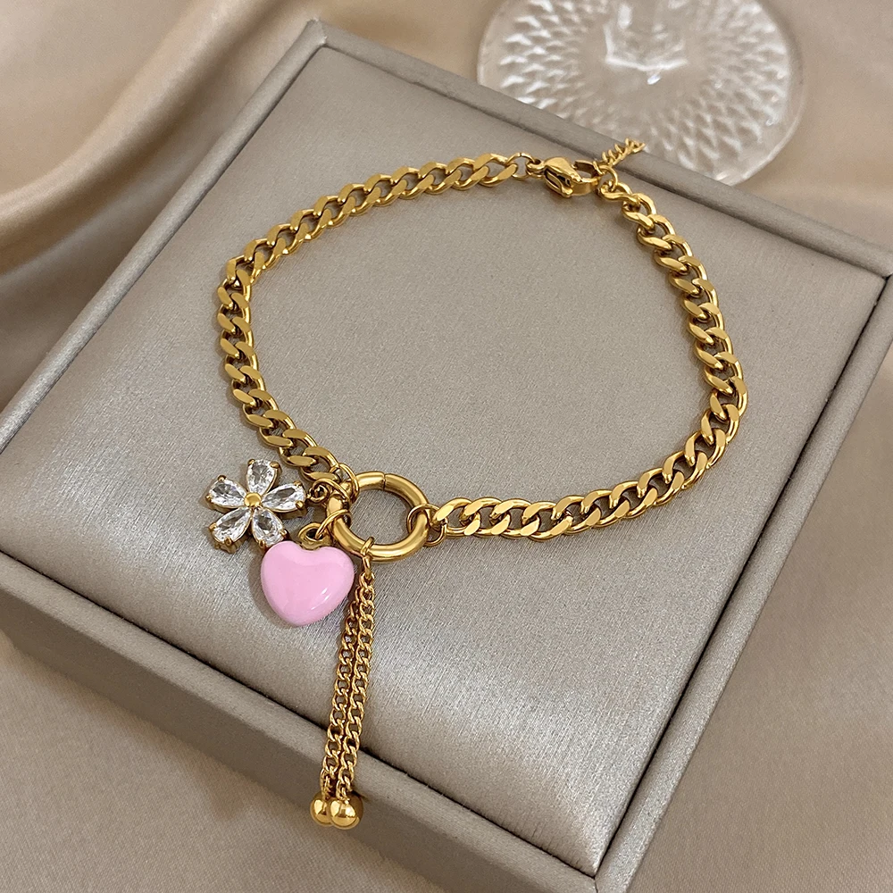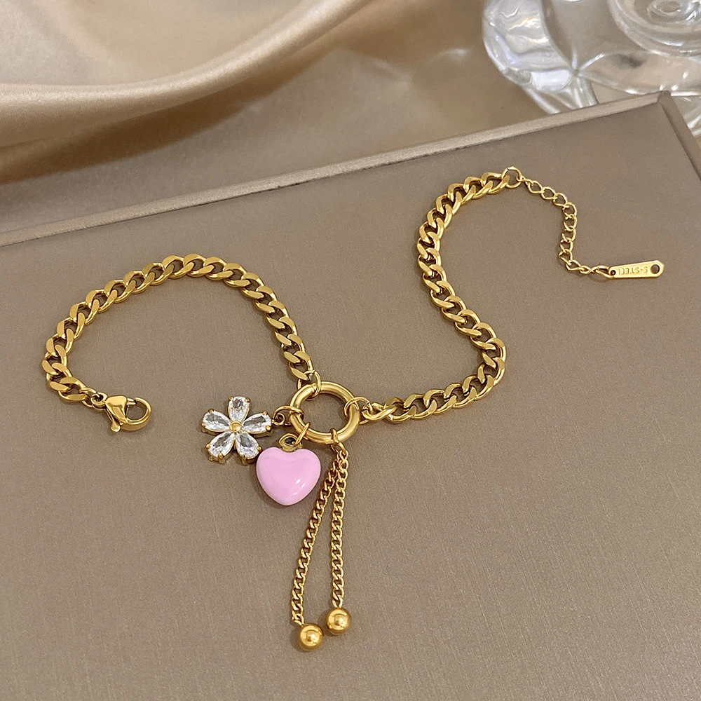 Elegant Pink Heart Zircon Flower Charms Bracelet Chic Gold Plated Stainless Steel Thick Chain Bracelets Valentine’s Day Jewelry
