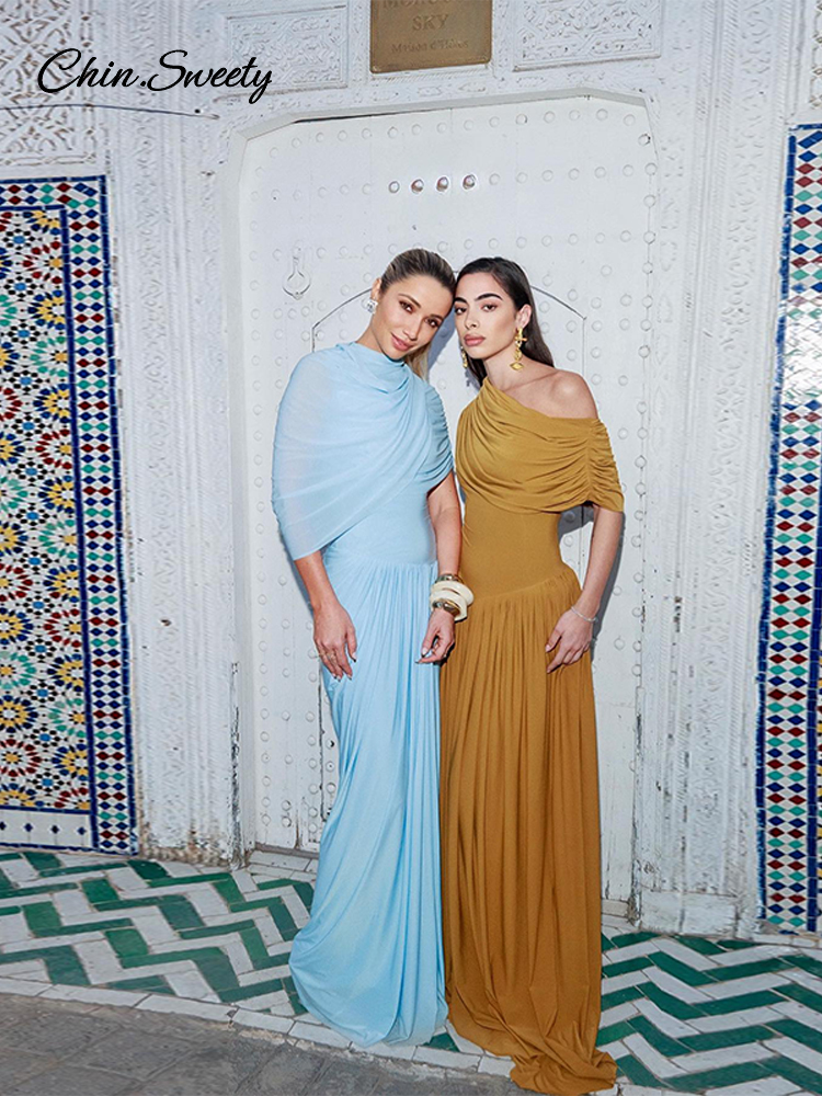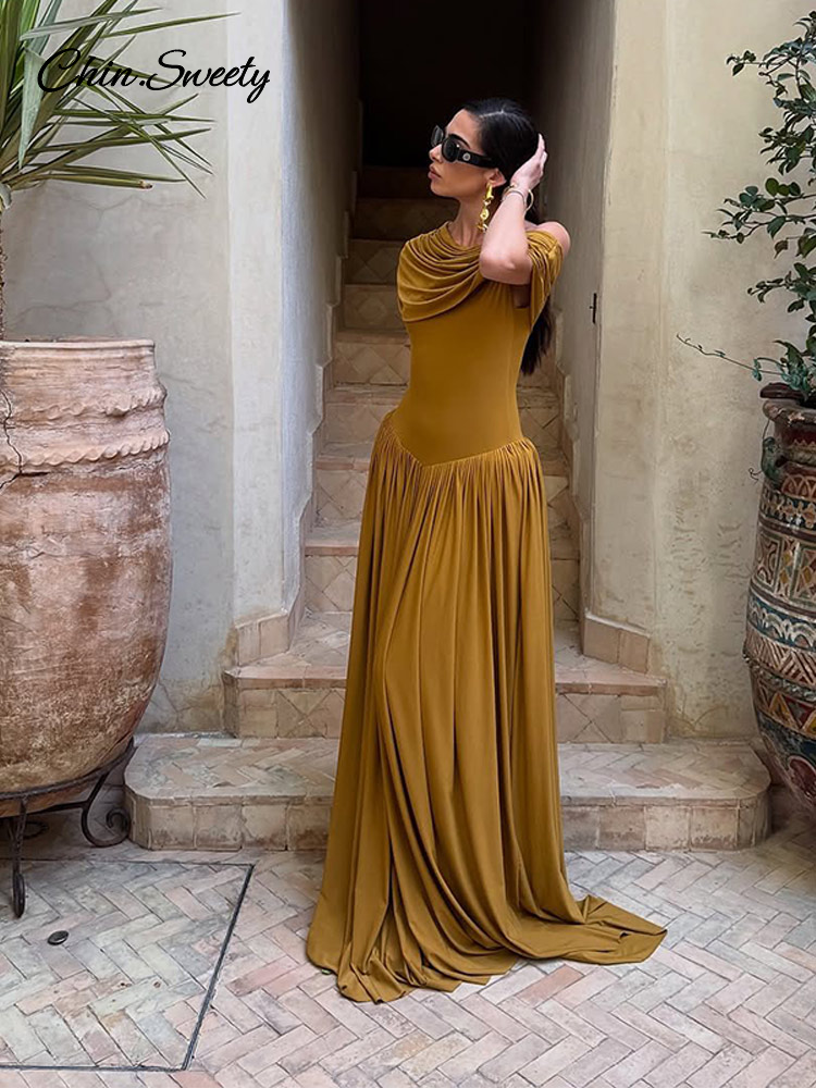 Elegant Pleat One Shoulder Long Dress Women Solid Backless Slash Neck Slim Dresses 2025 Summer Lady Beach Party Vacation Robes