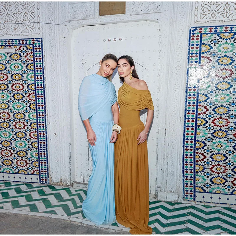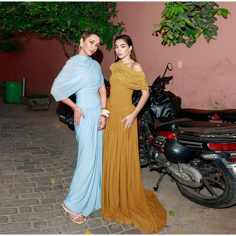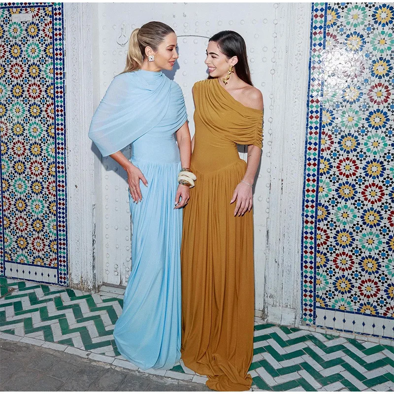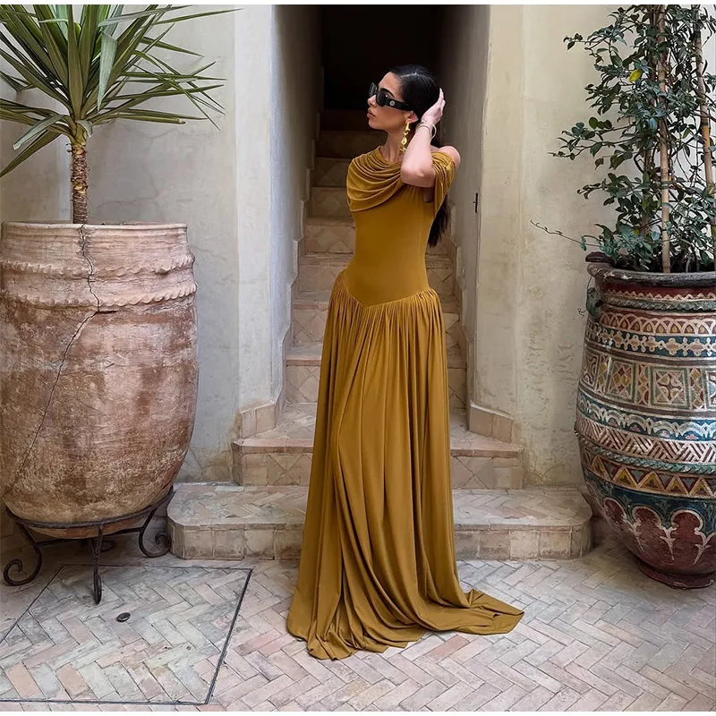Elegant Pleat One Shoulder Long Dress Women Solid Backless Slash Neck Slim Dresses 2025 Summer Lady Beach Party Vacation Robes