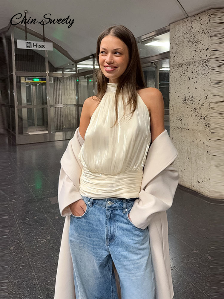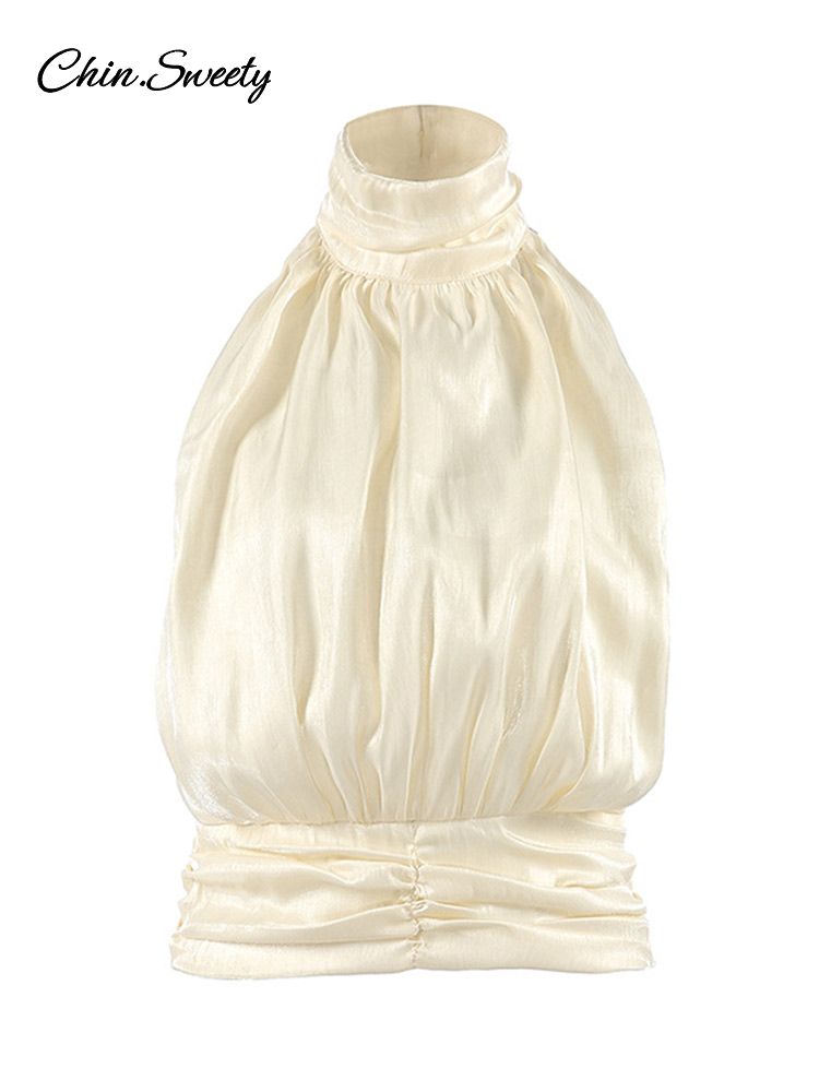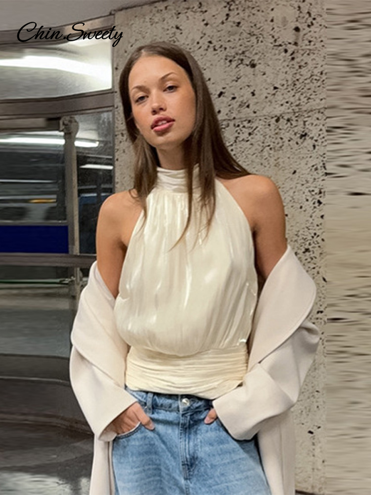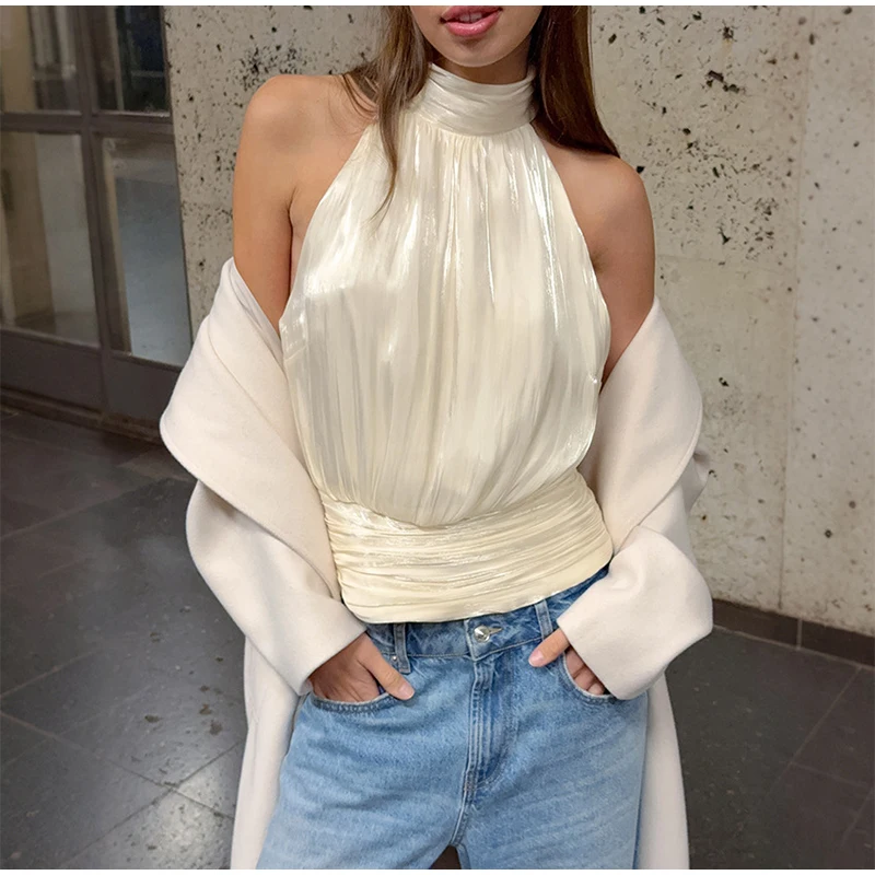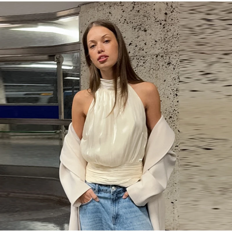 Elegant Pleated Halter Top Women Solid Sleeveless High Neck Backless Cropped Vests Lady New Fashion Holiday Summer Clothing 2026