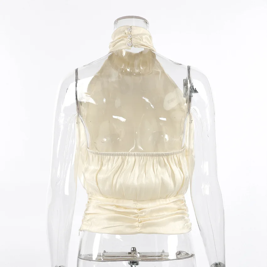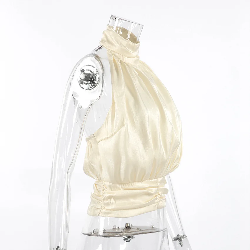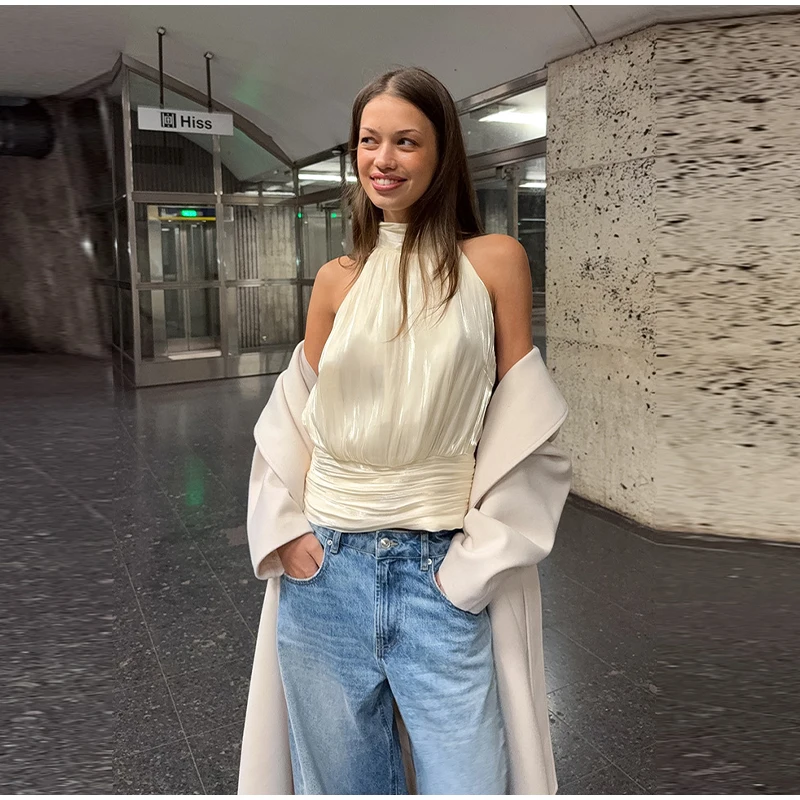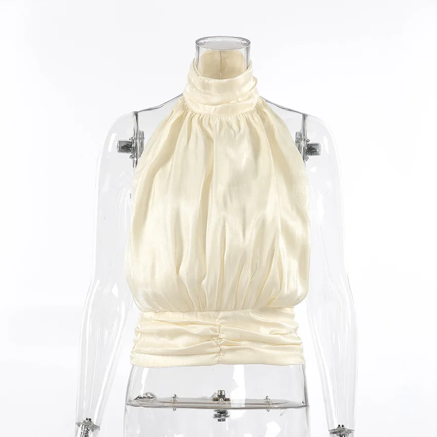 Elegant Pleated Halter Top Women Solid Sleeveless High Neck Backless Cropped Vests Lady New Fashion Holiday Summer Clothing 2026
