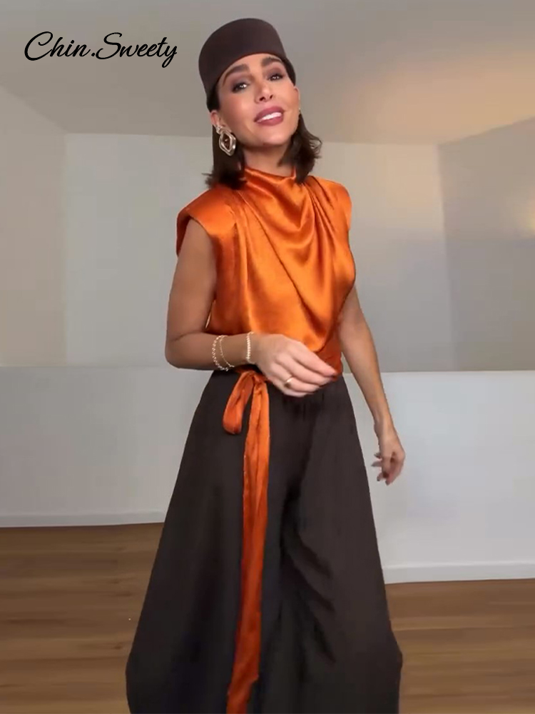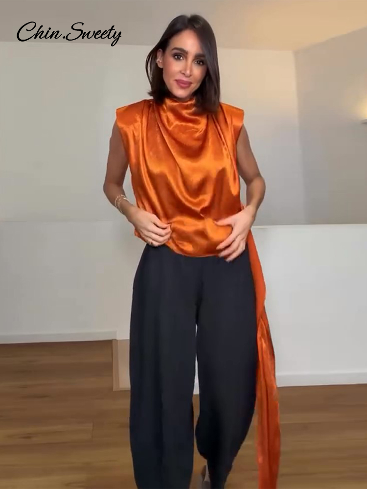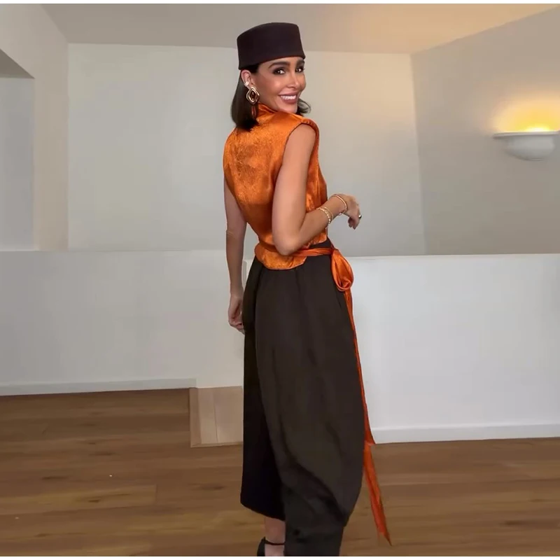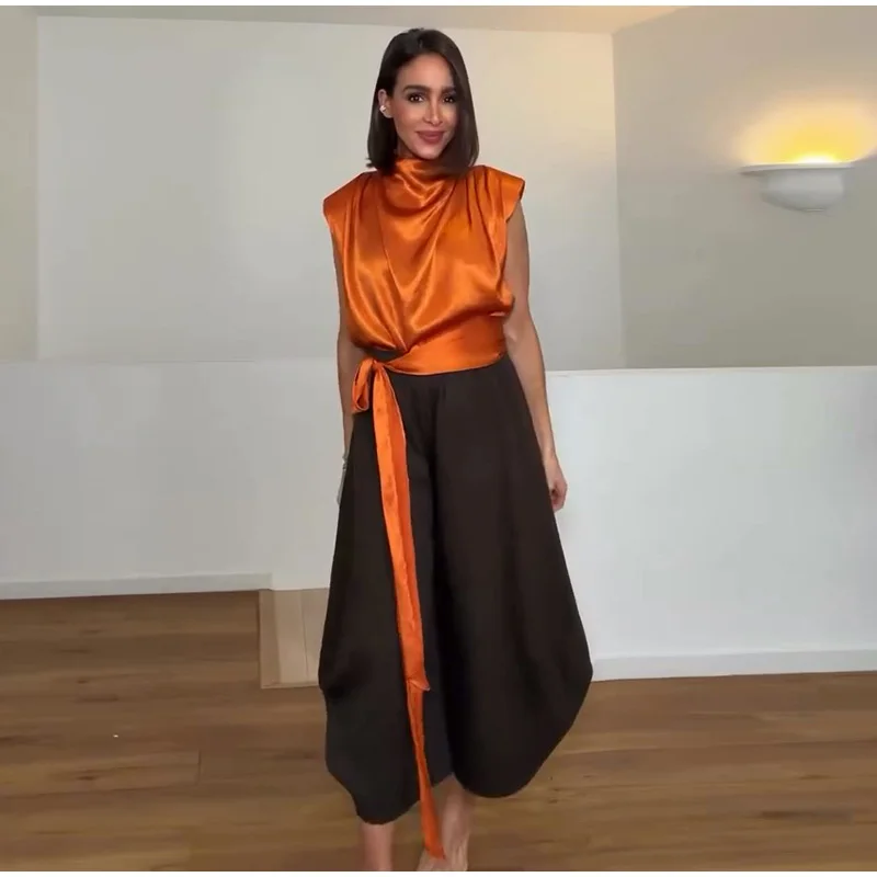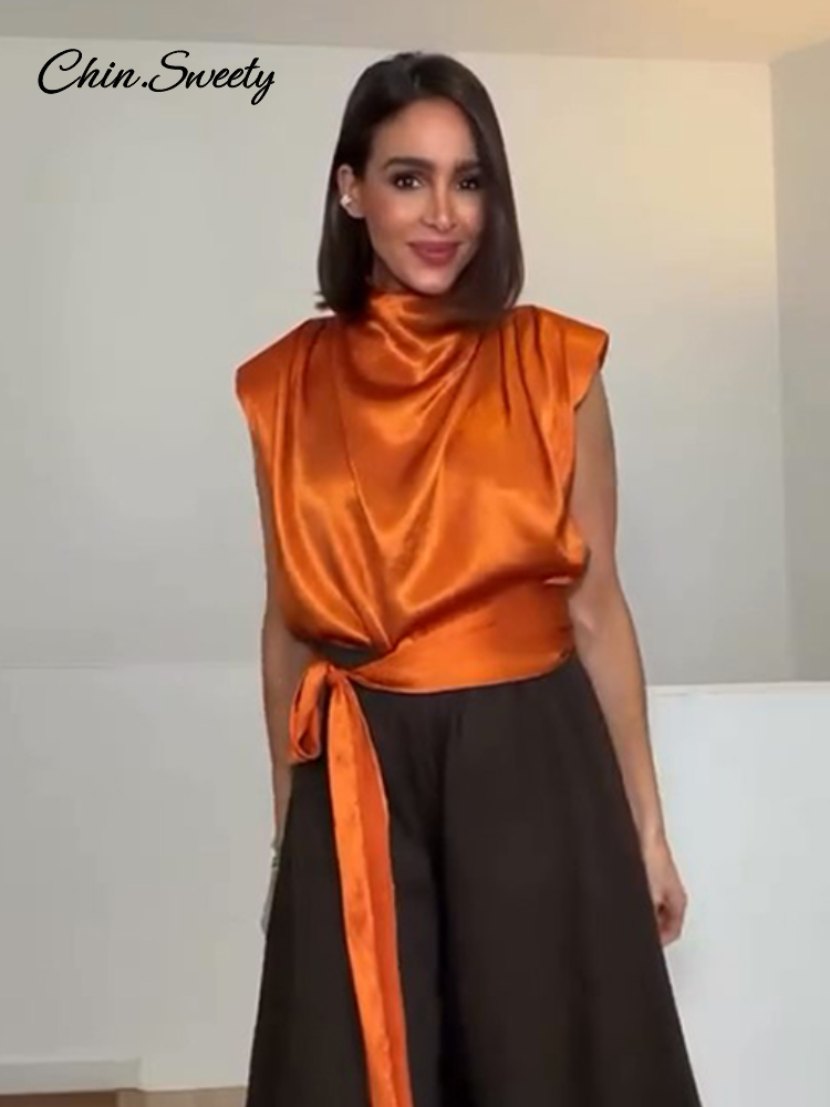 Elegant Satin Lace Up Top Women Vintage Orange Sleeveless Loose Bow Tops Lady New Fashion Daily Casual Summer Clothing 2026