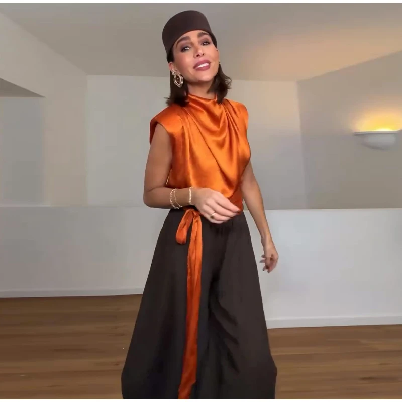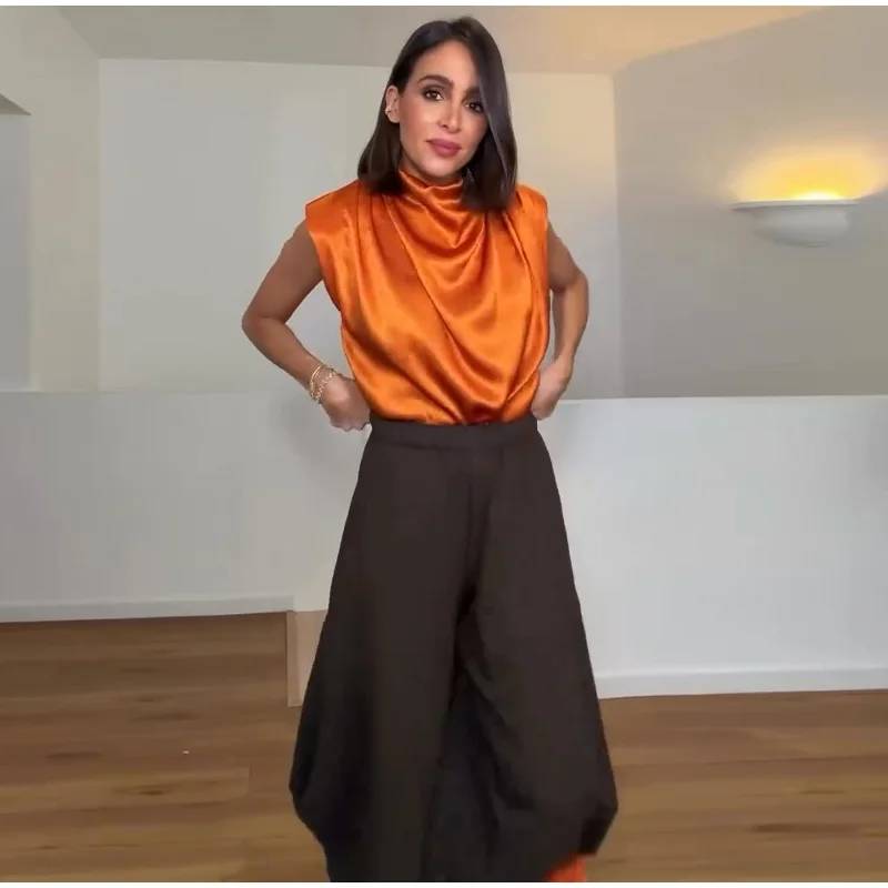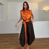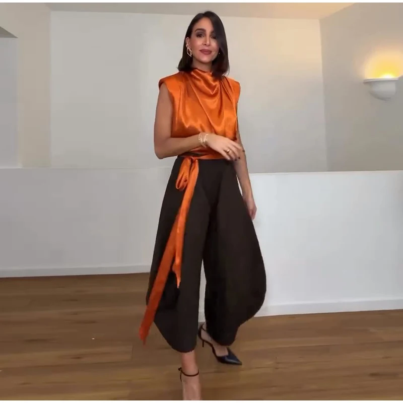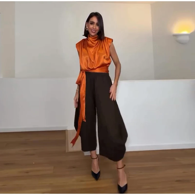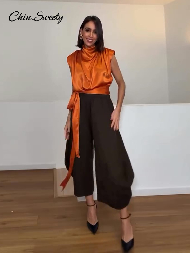 Elegant Satin Lace Up Top Women Vintage Orange Sleeveless Loose Bow Tops Lady New Fashion Daily Casual Summer Clothing 2026