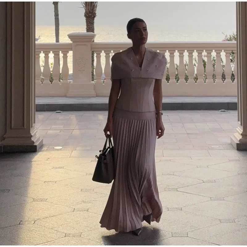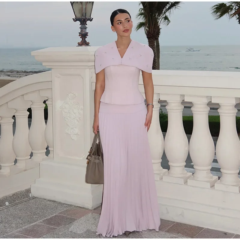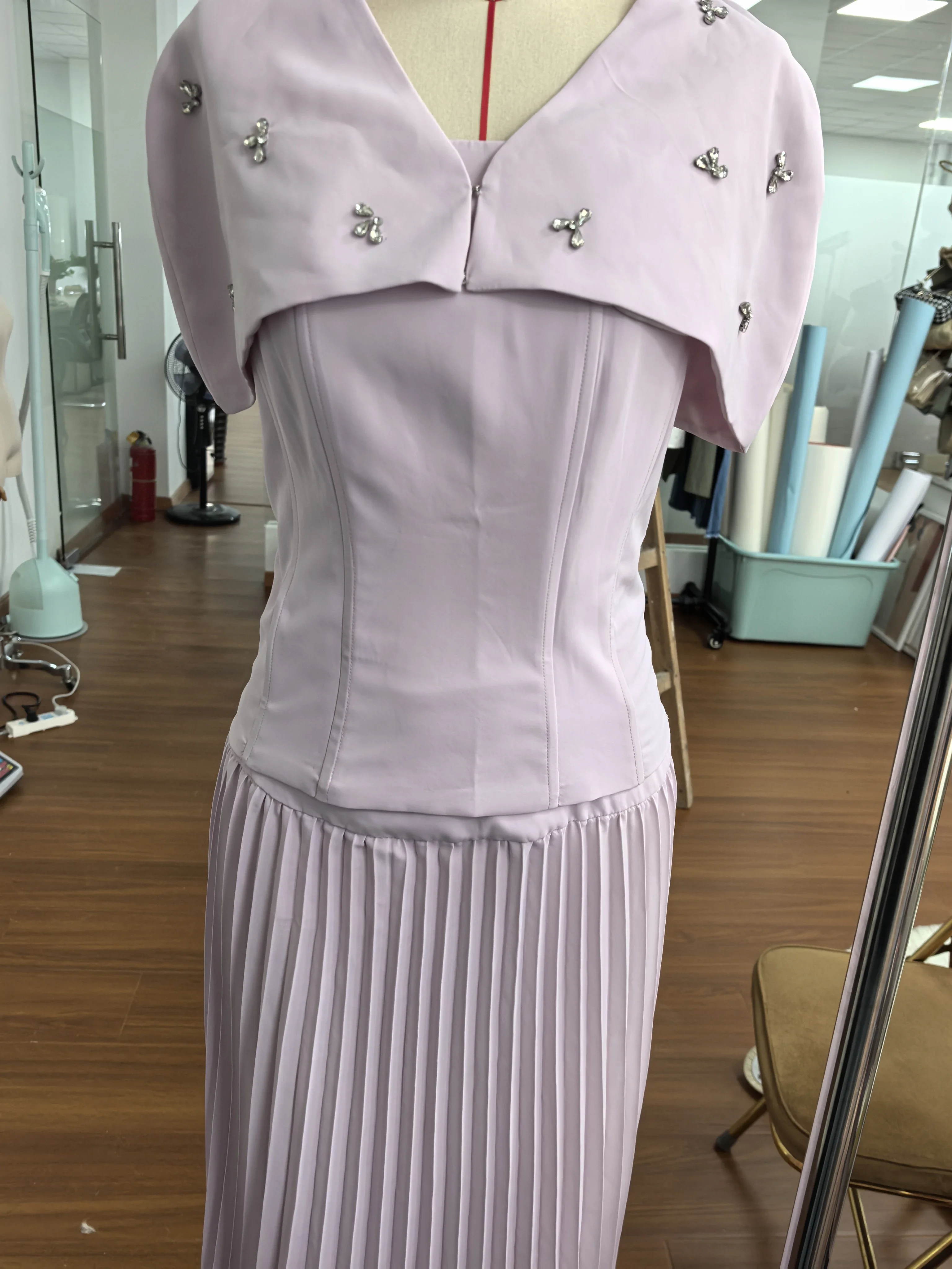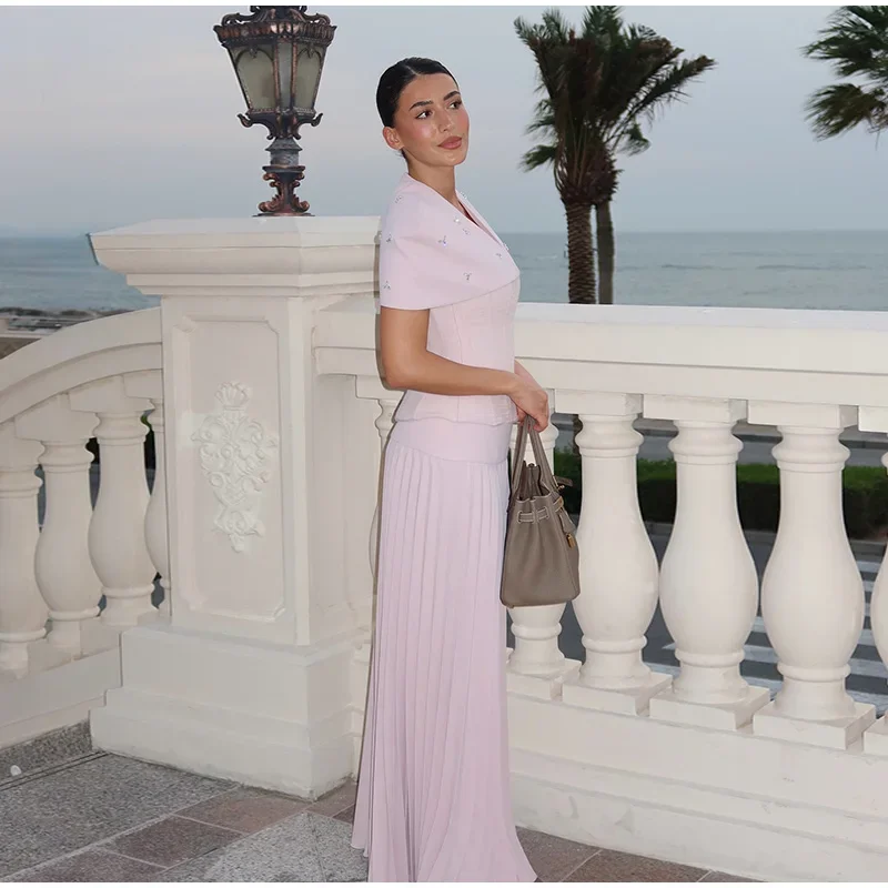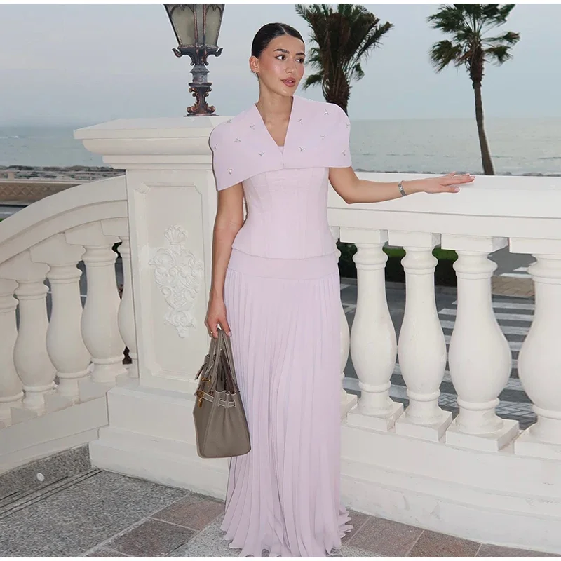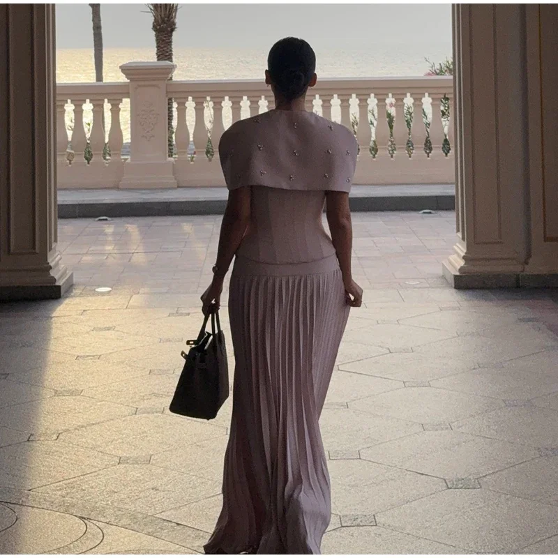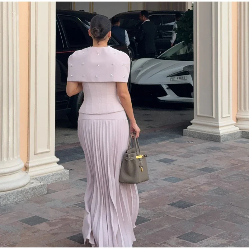 Elegant Shawl Slim Top Pleated Skirt Set Lady Retro Purple Sleeveless Tube High Waist Long Skirts Sets Women Chic Evening Summer
