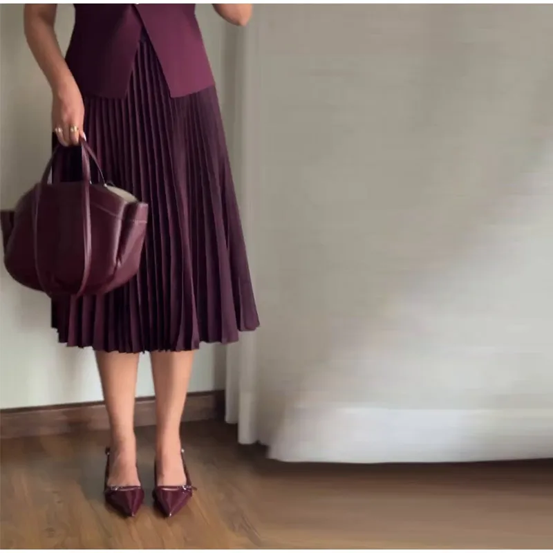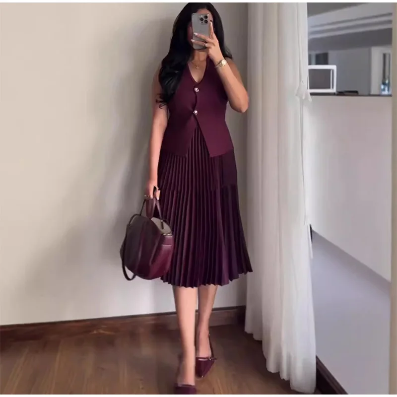Elegant Single Breasted Sleeveless Knitted Vest A Line Skirt Suits Fashion Pleated Skirt Set Women Spring Lady 2 Pcs Outfit
