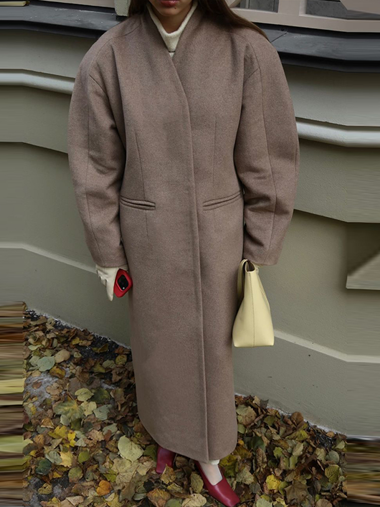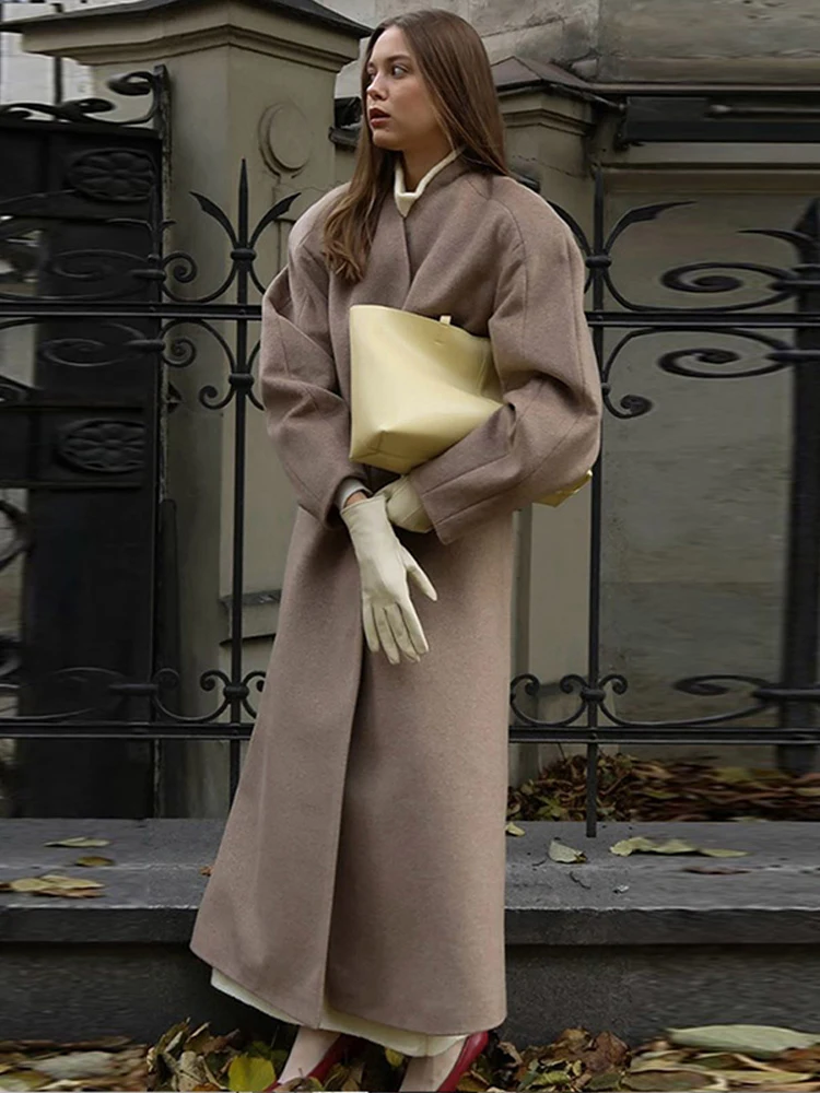 Elegant V-neck Woolen Long Coat Women Casual Full Sleeve Pocket Solid Loose Female Coats 2025 Autumn Winter Fashion Lady Outwear