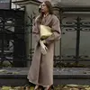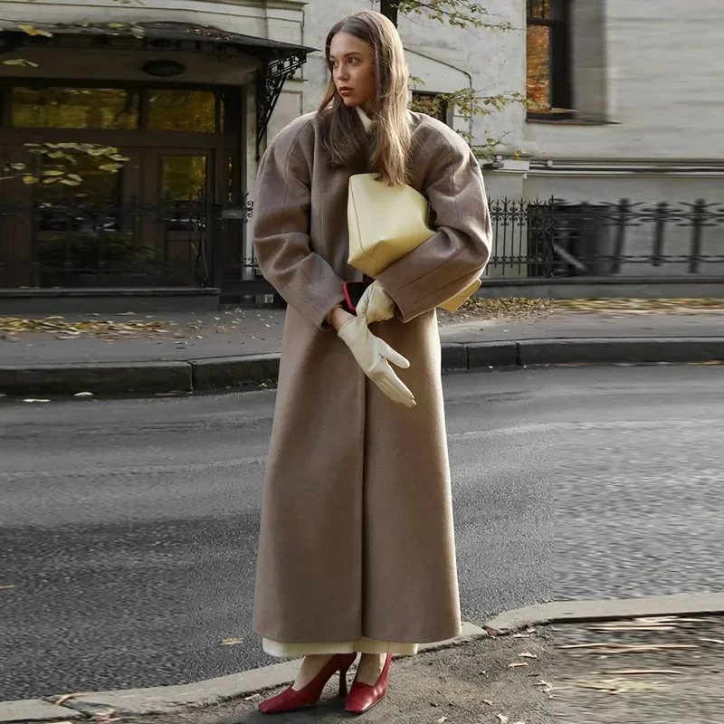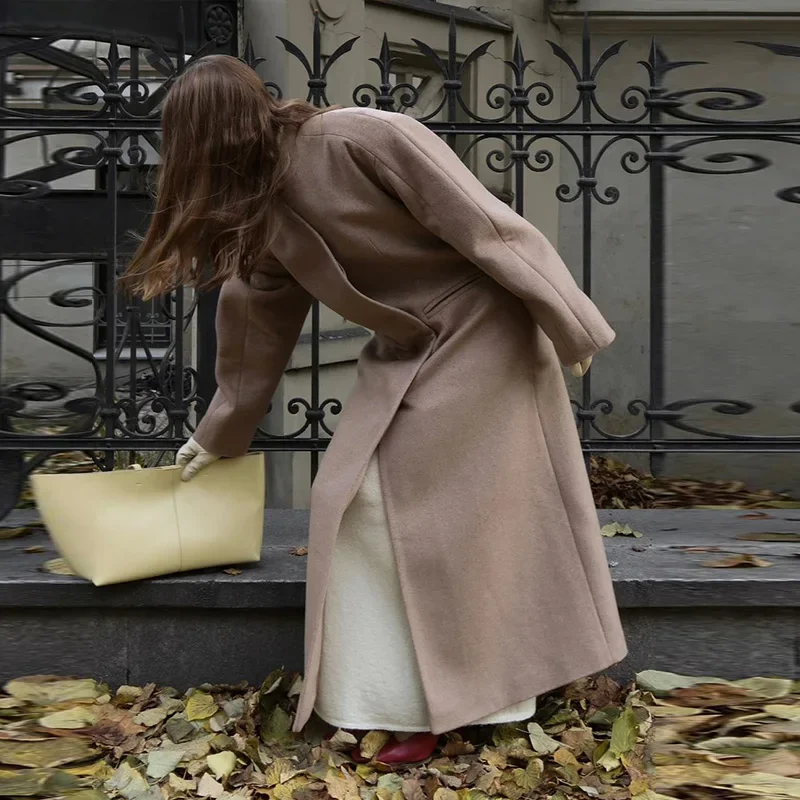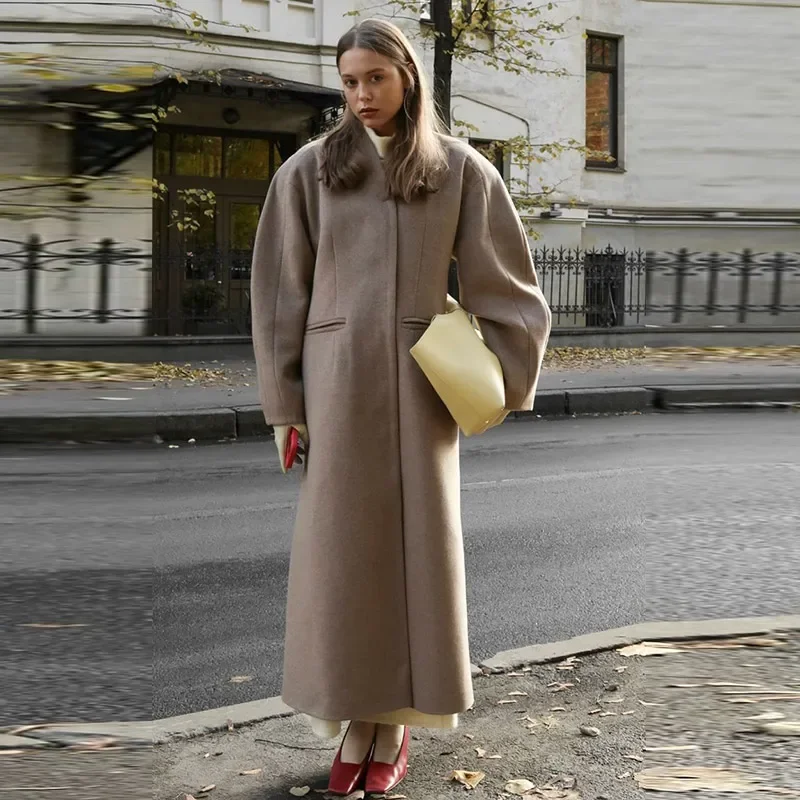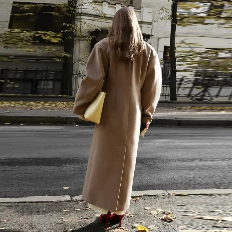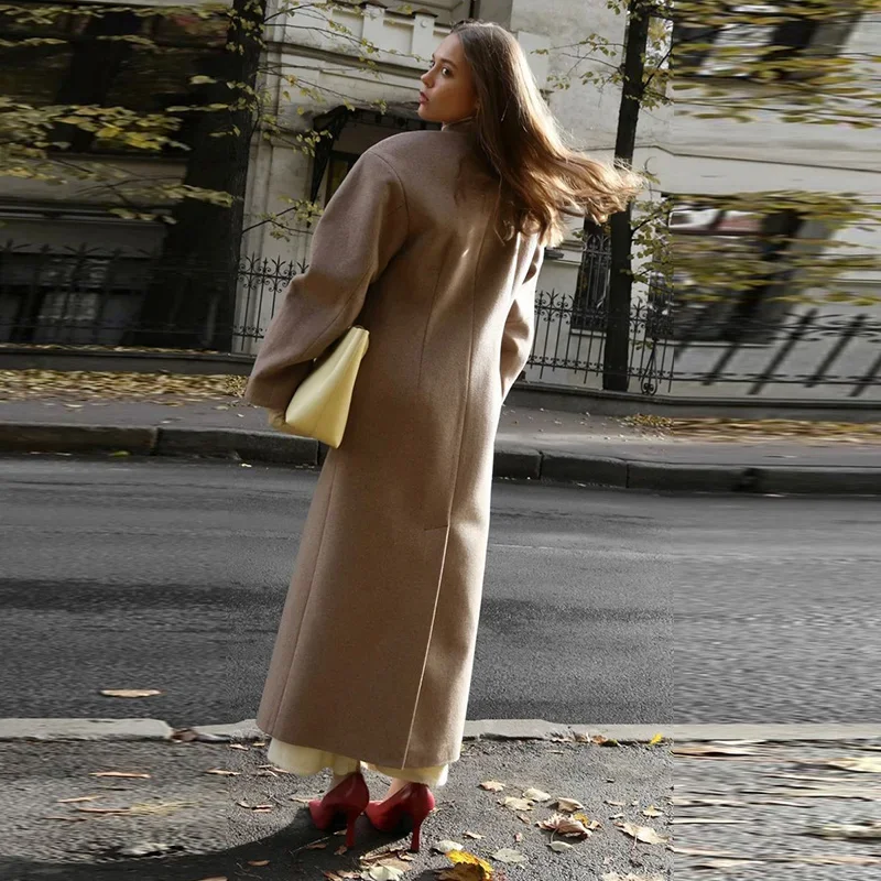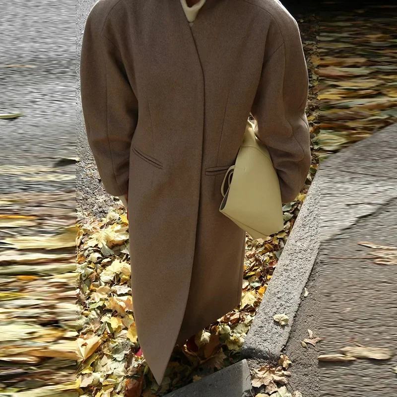 Elegant V-neck Woolen Long Coat Women Casual Full Sleeve Pocket Solid Loose Female Coats 2025 Autumn Winter Fashion Lady Outwear
