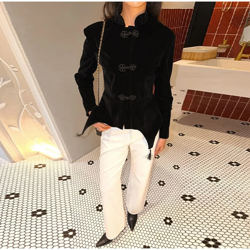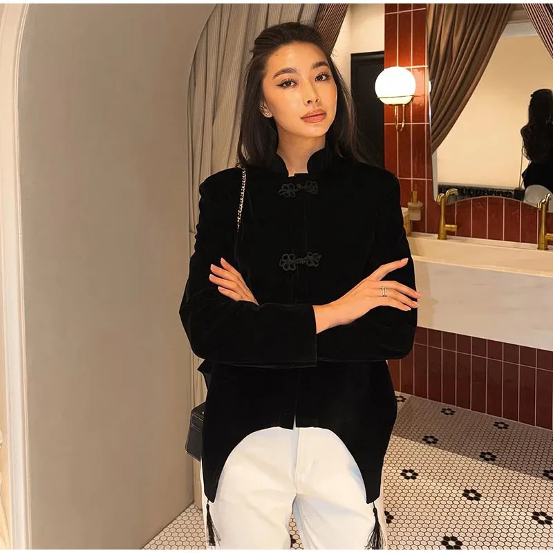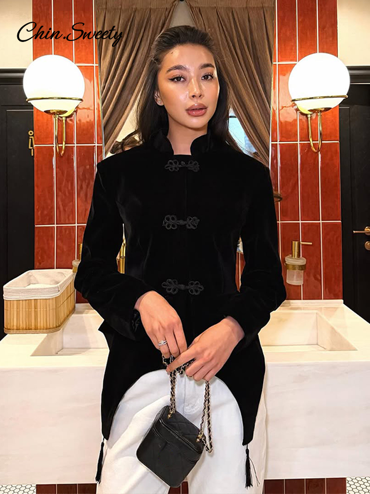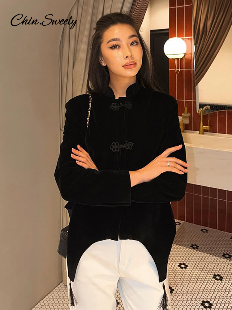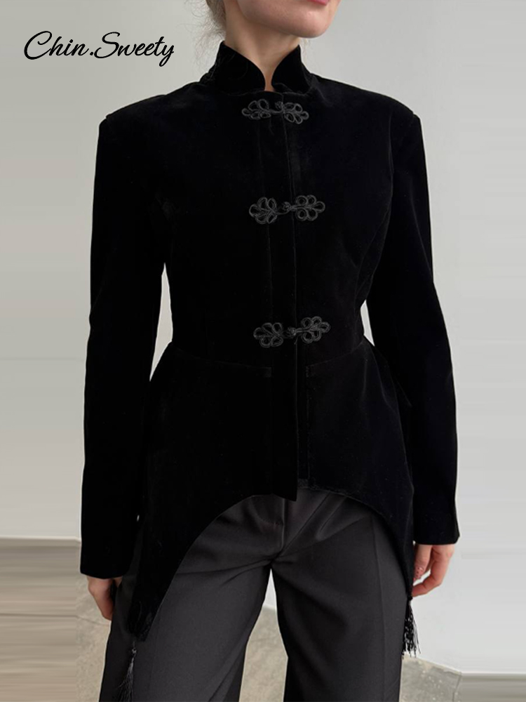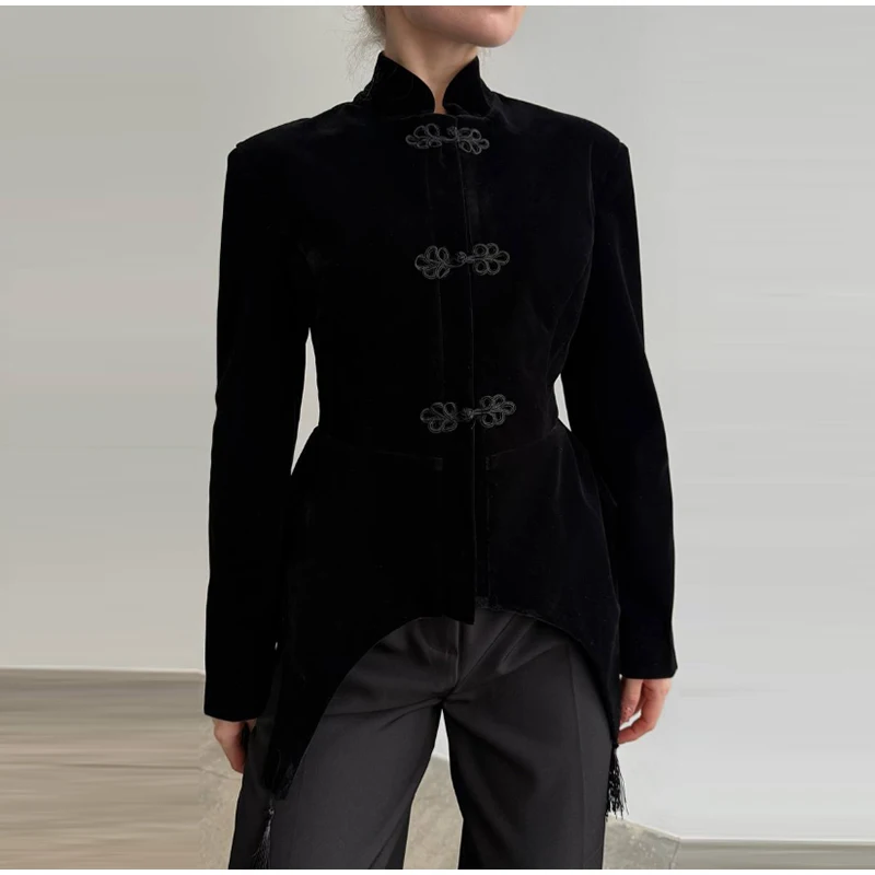 Elegant Velvet Tassel Jacket Women Black Stand Neck Frog Button Irregular Hem Blazer Jackets Lady New Vintage Office Outwear