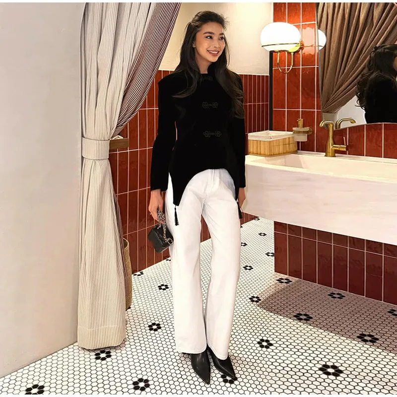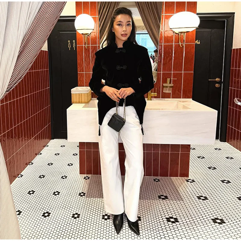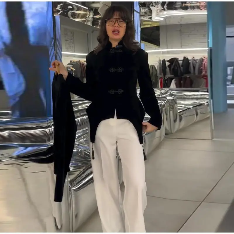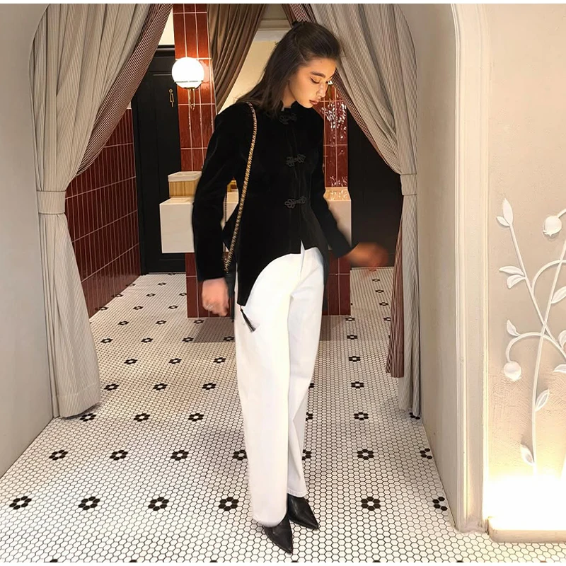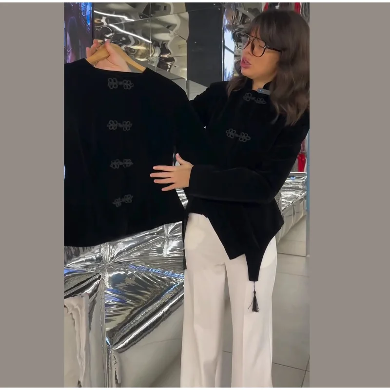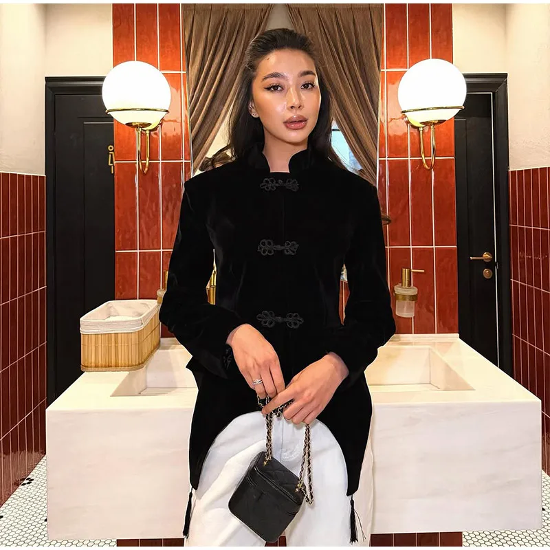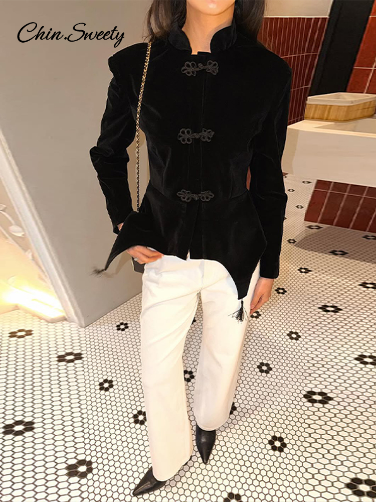 Elegant Velvet Tassel Jacket Women Black Stand Neck Frog Button Irregular Hem Blazer Jackets Lady New Vintage Office Outwear