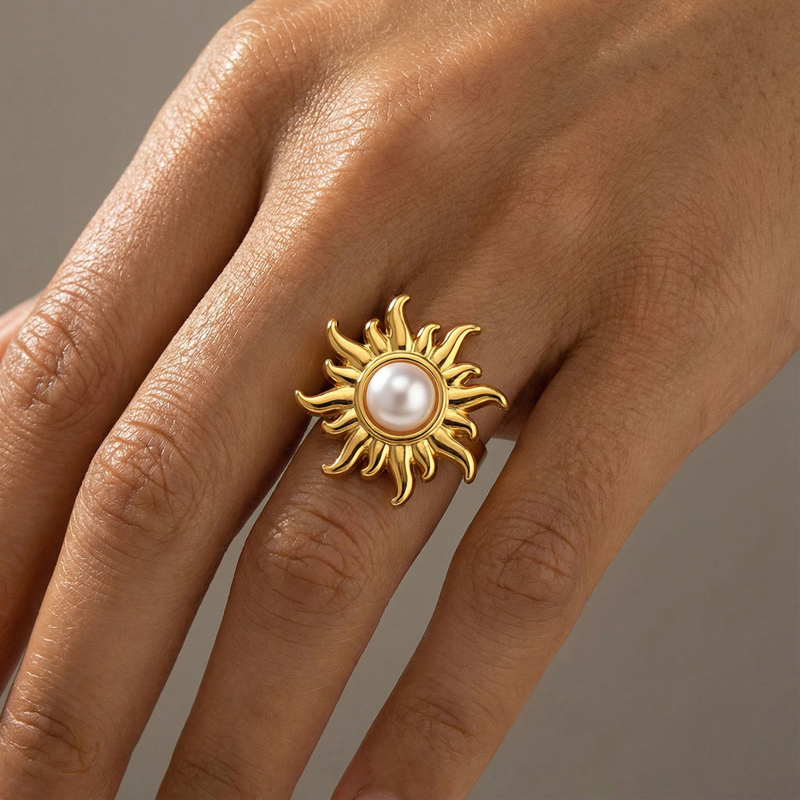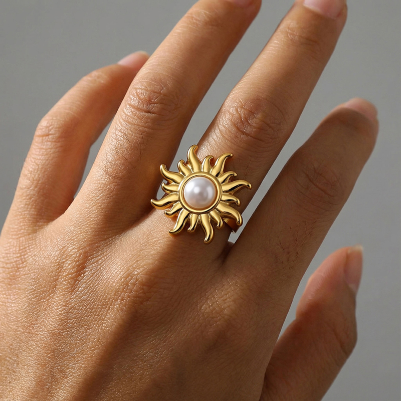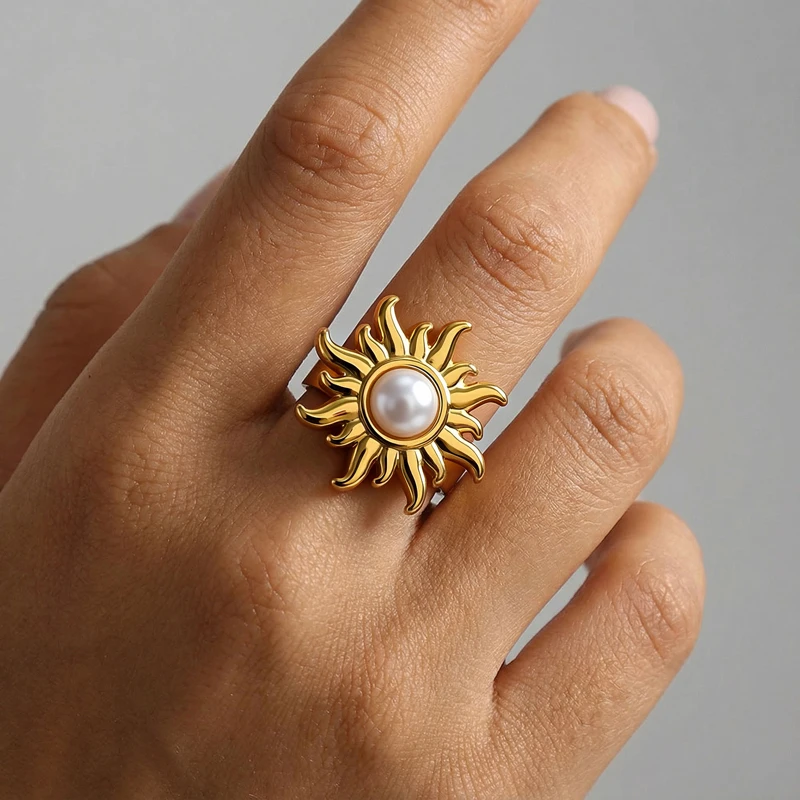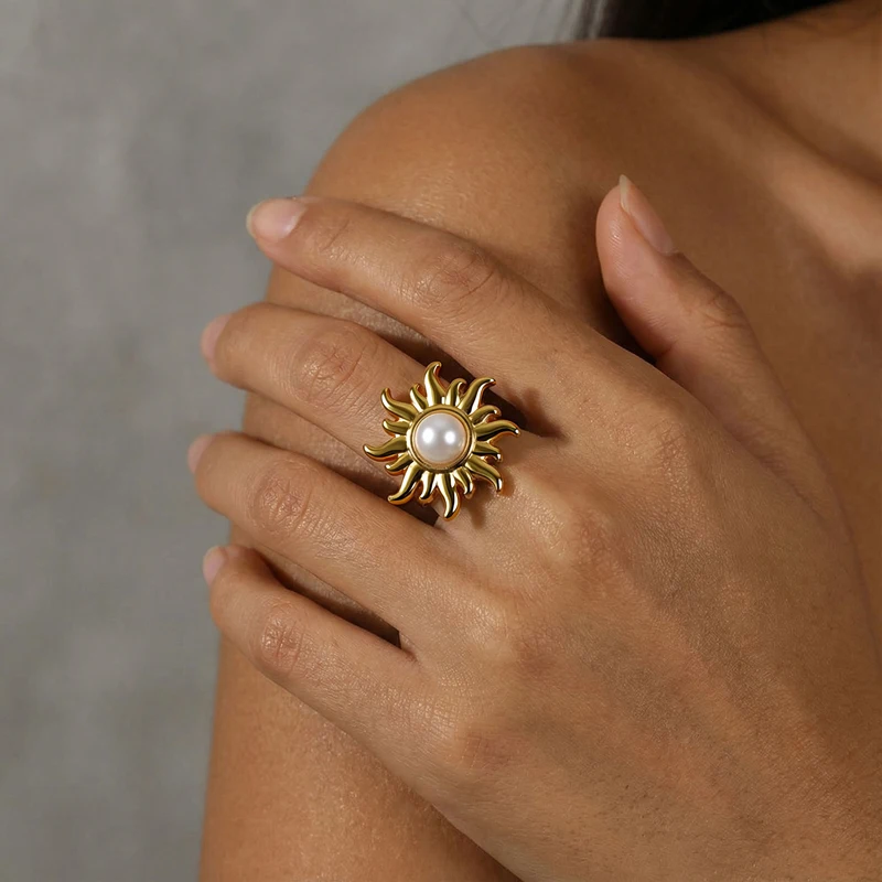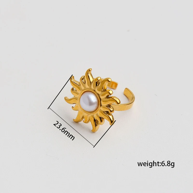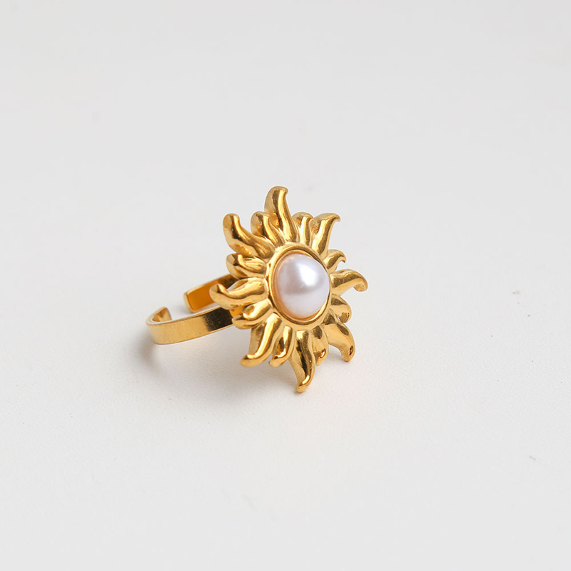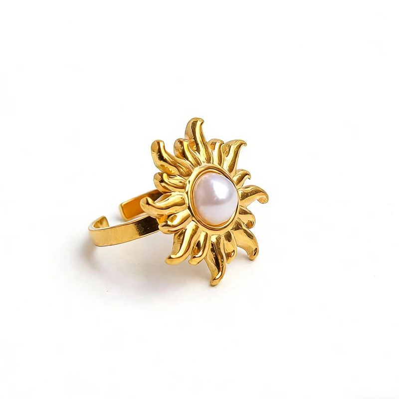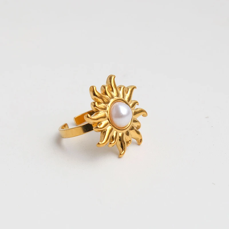 European and American Stainless Steel Sunflower Adjustable Ring for Women Fashion Inlaid Imitation Pearl Ring Non Fading Jewelry