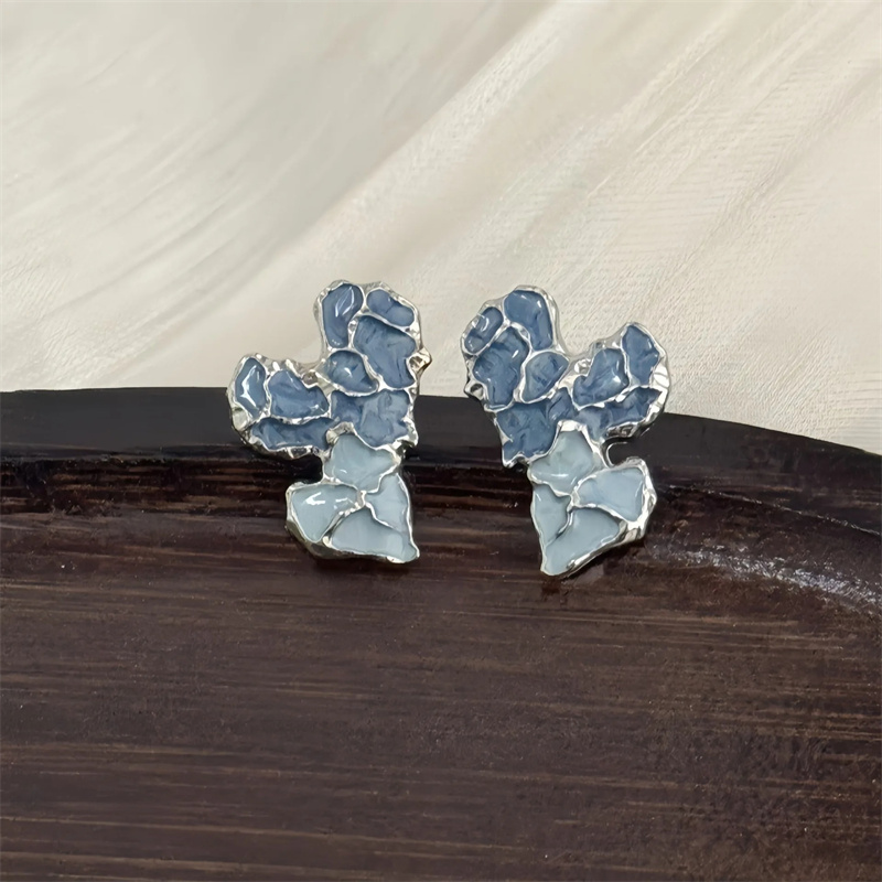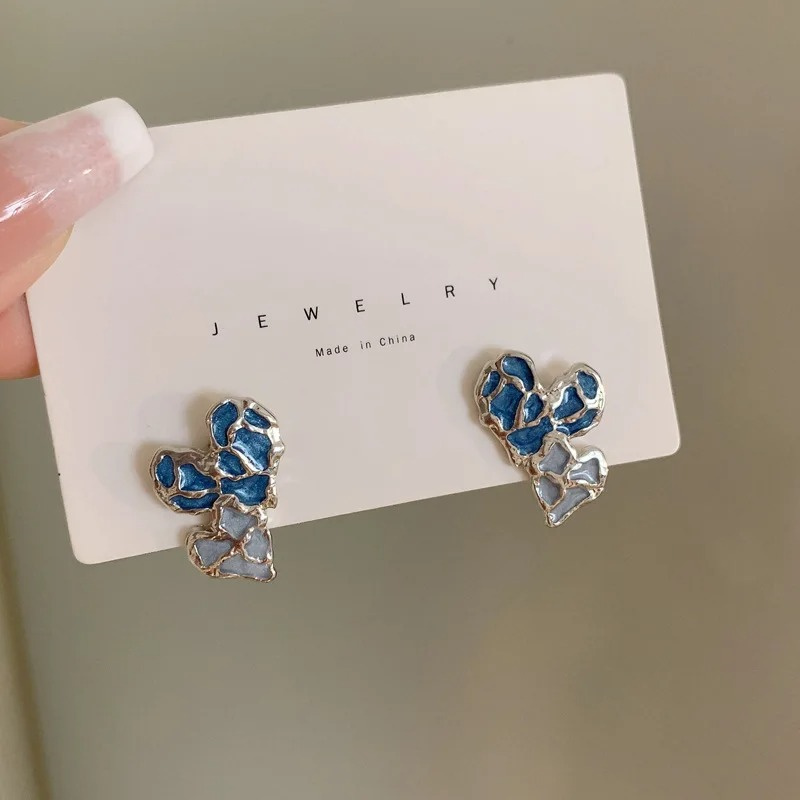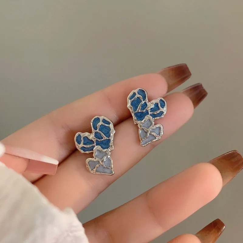Exquisite Blue Irregular Heart Contrast Color Stud Earrings for Women New Fashion Personality Ear Jewelry Gift Girl