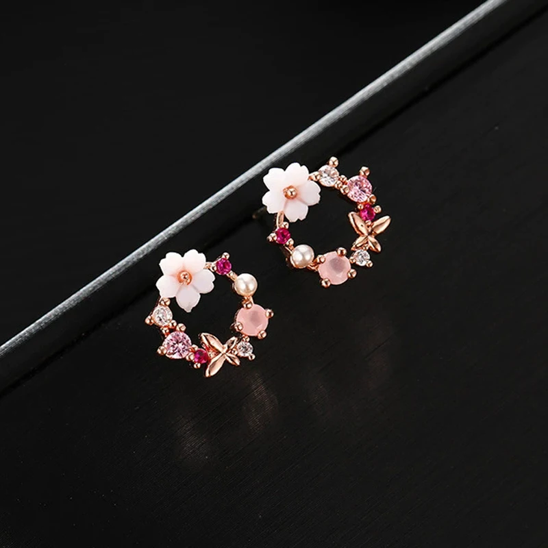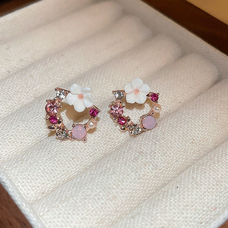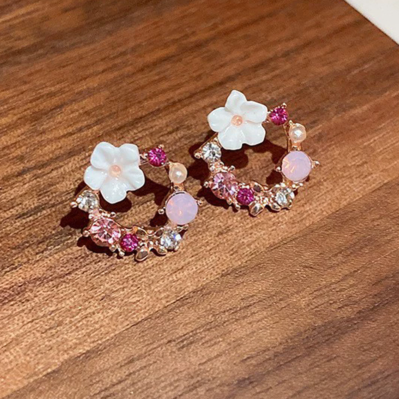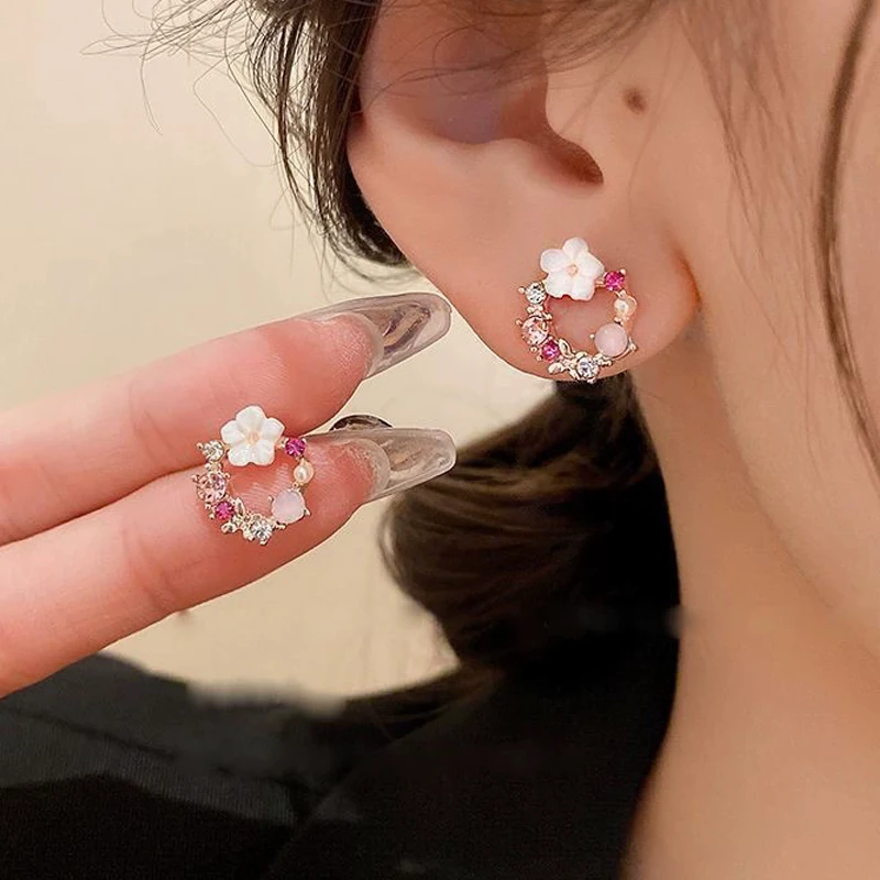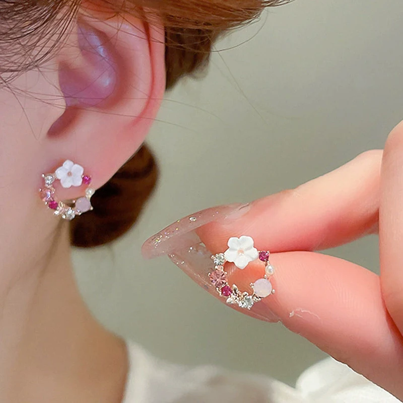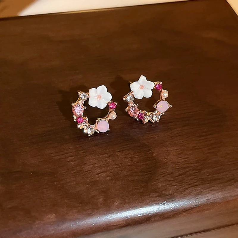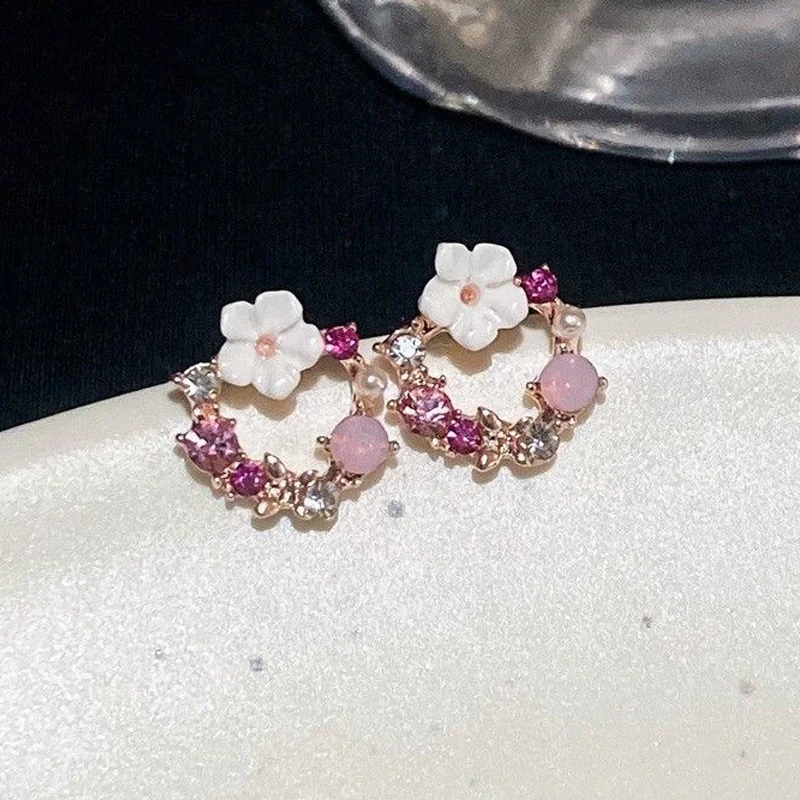 Exquisite Round Circle Stud Earrings for Women Temperament Acrylic Small Flower Rhinestones Earrings Party Trendy Sweet Jewelry