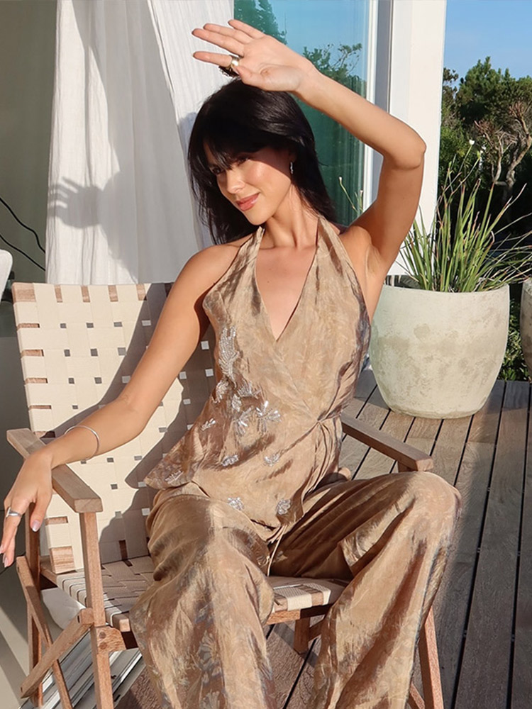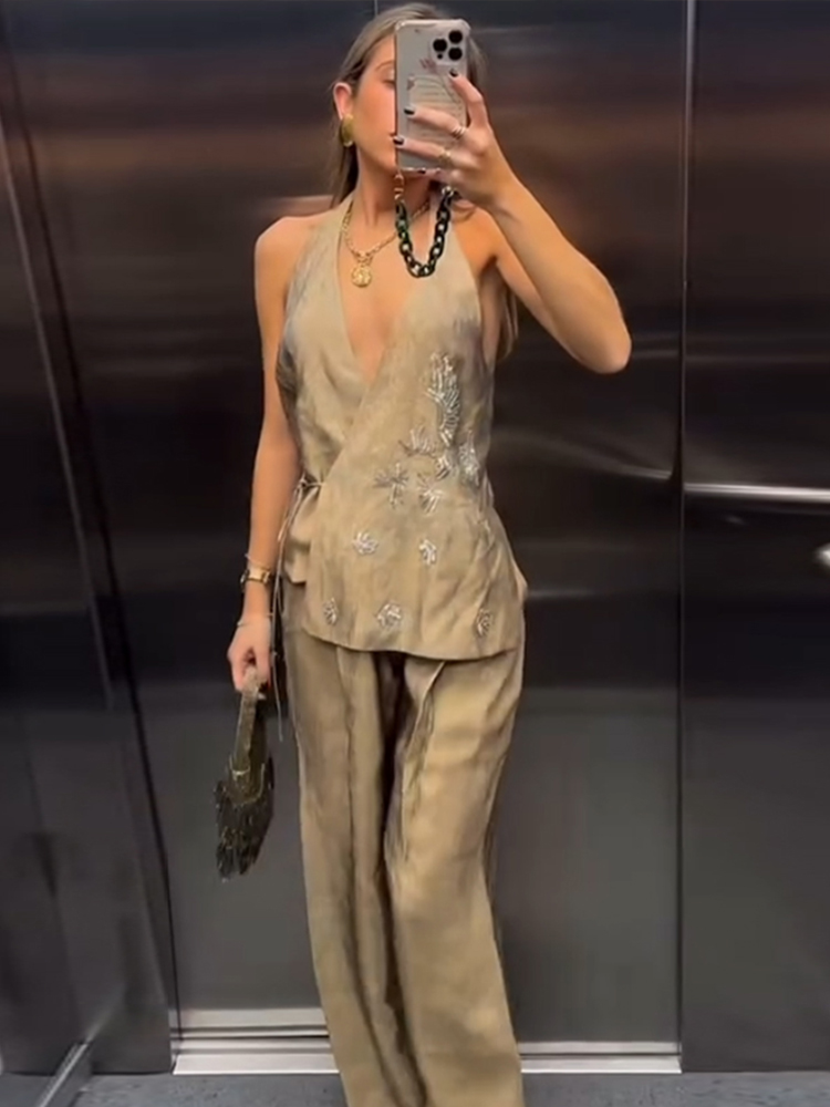 Fashion Beading Lace Up Vest Pants Sets Women V-neck Sleeveless Halter Top Loose Straight Trousers 2025 Summer Lady Outfits
