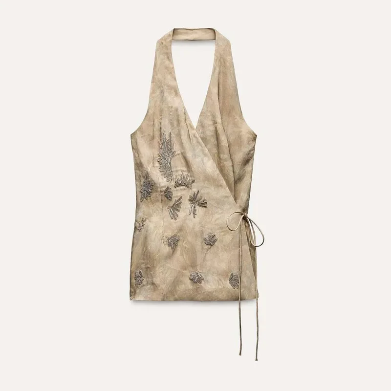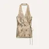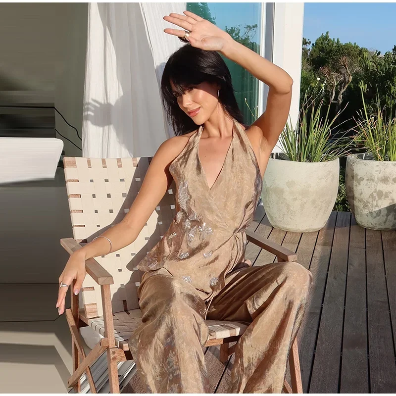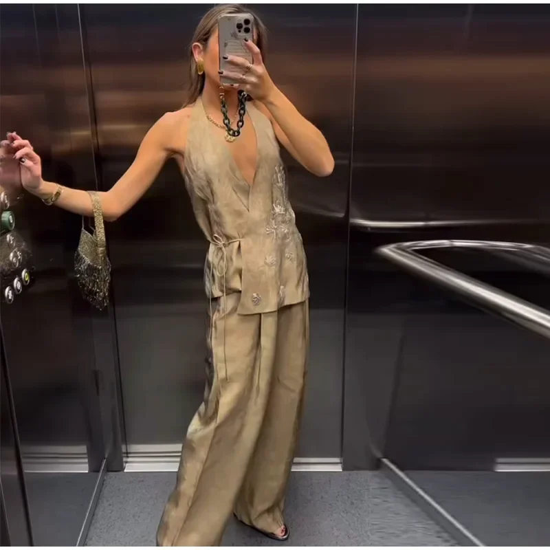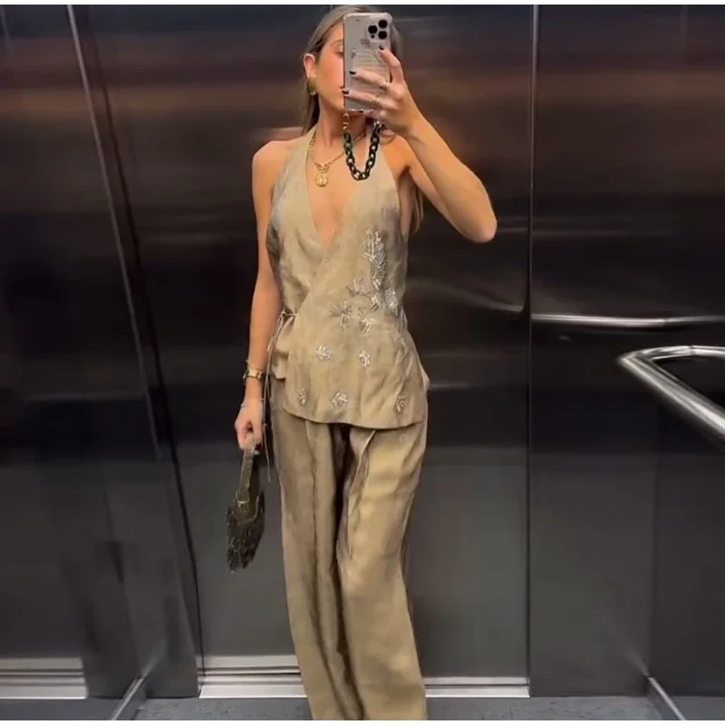 Fashion Beading Lace Up Vest Pants Sets Women V-neck Sleeveless Halter Top Loose Straight Trousers 2025 Summer Lady Outfits