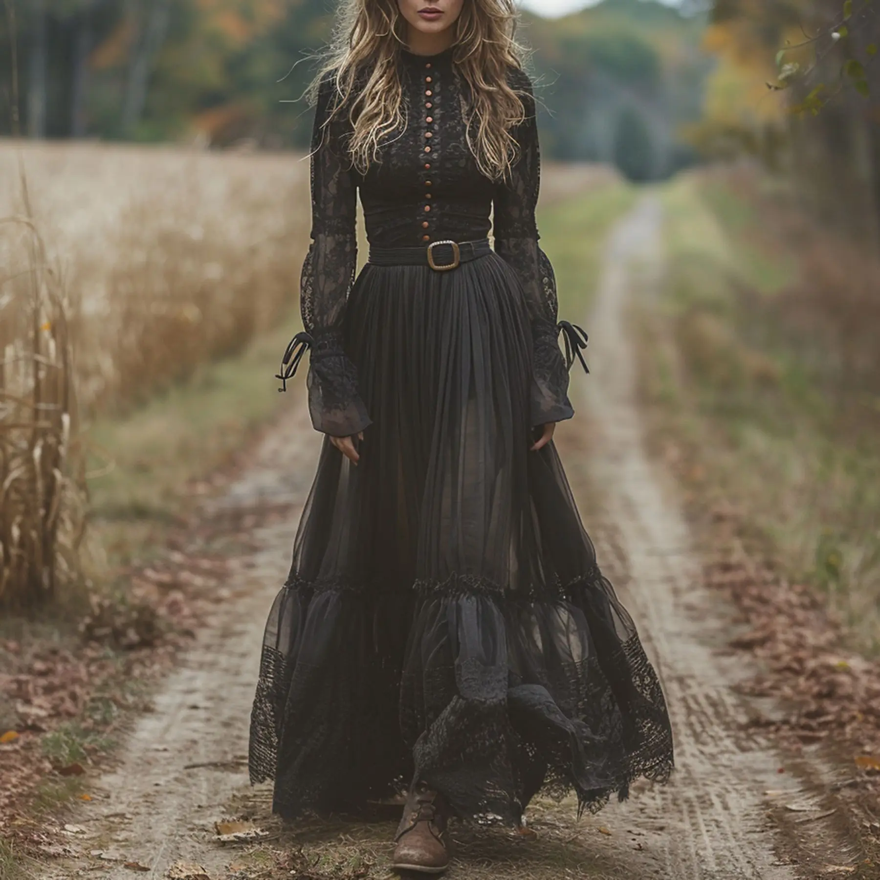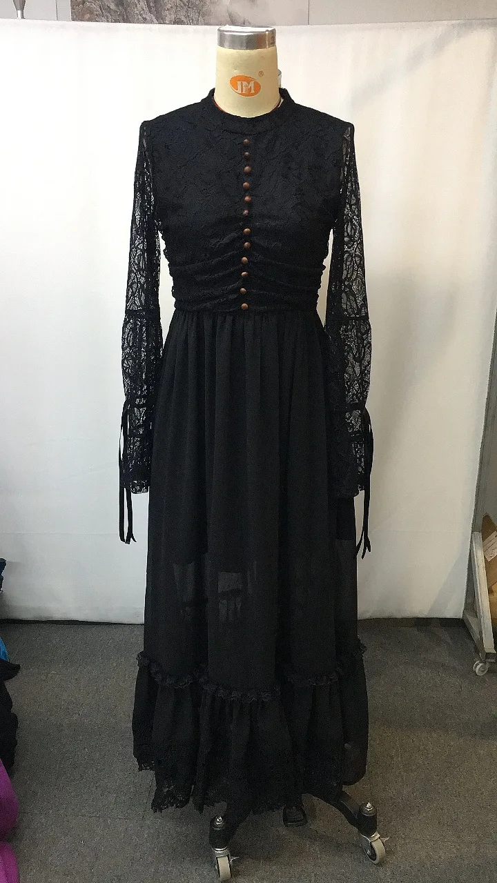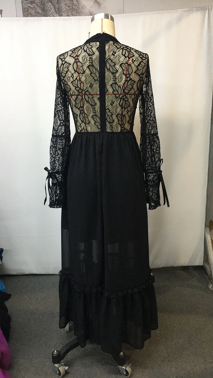 Fashion Designer Hollow Out Lace Patchwork Maxi Long Party Dresses Autumn Women Clothing Turtleneck Lantern Sleeve Buttons Robe