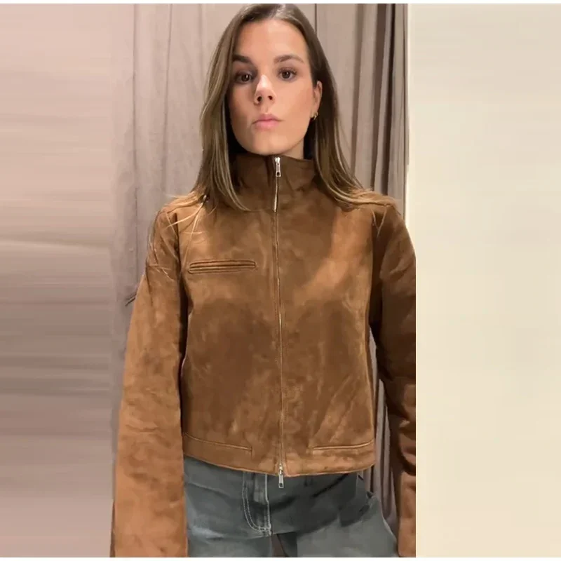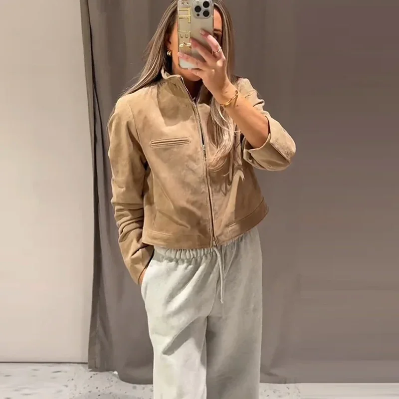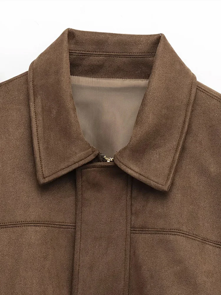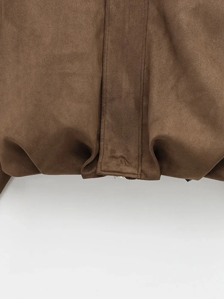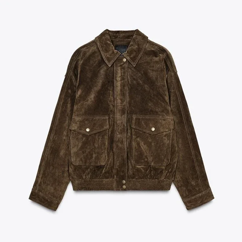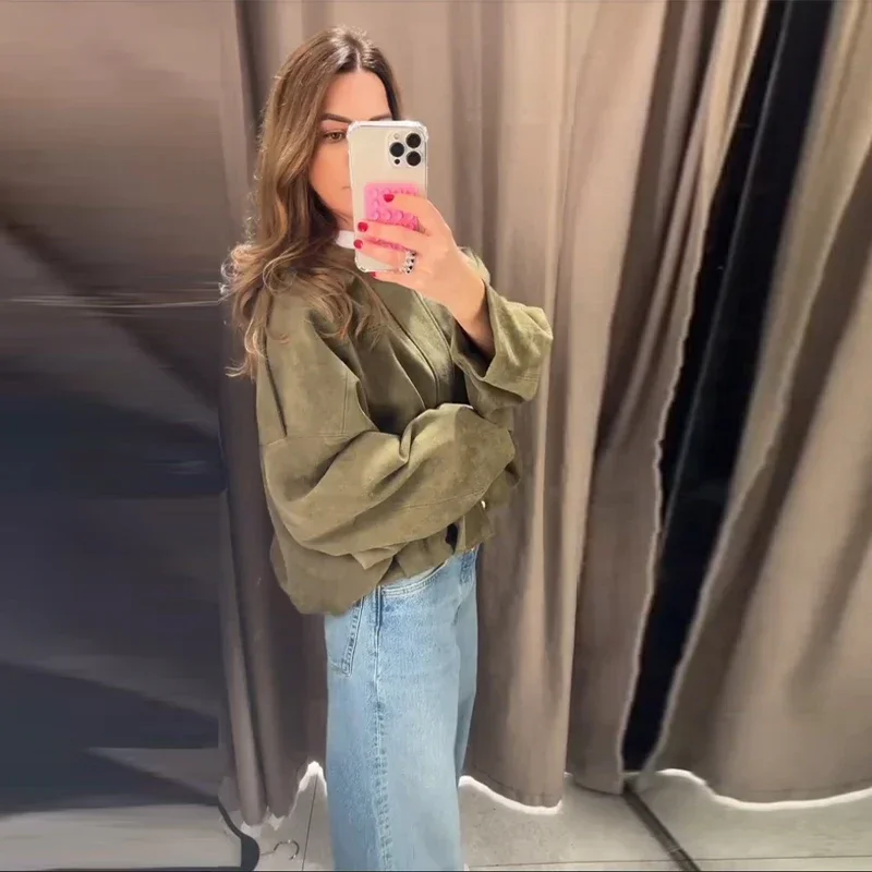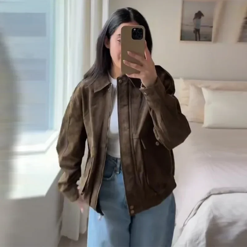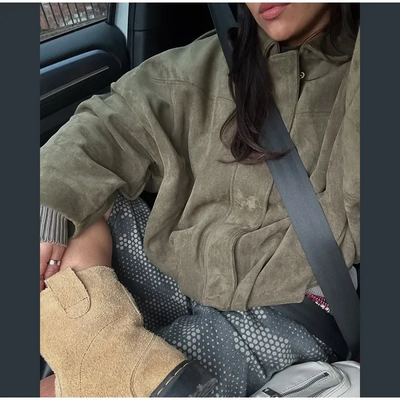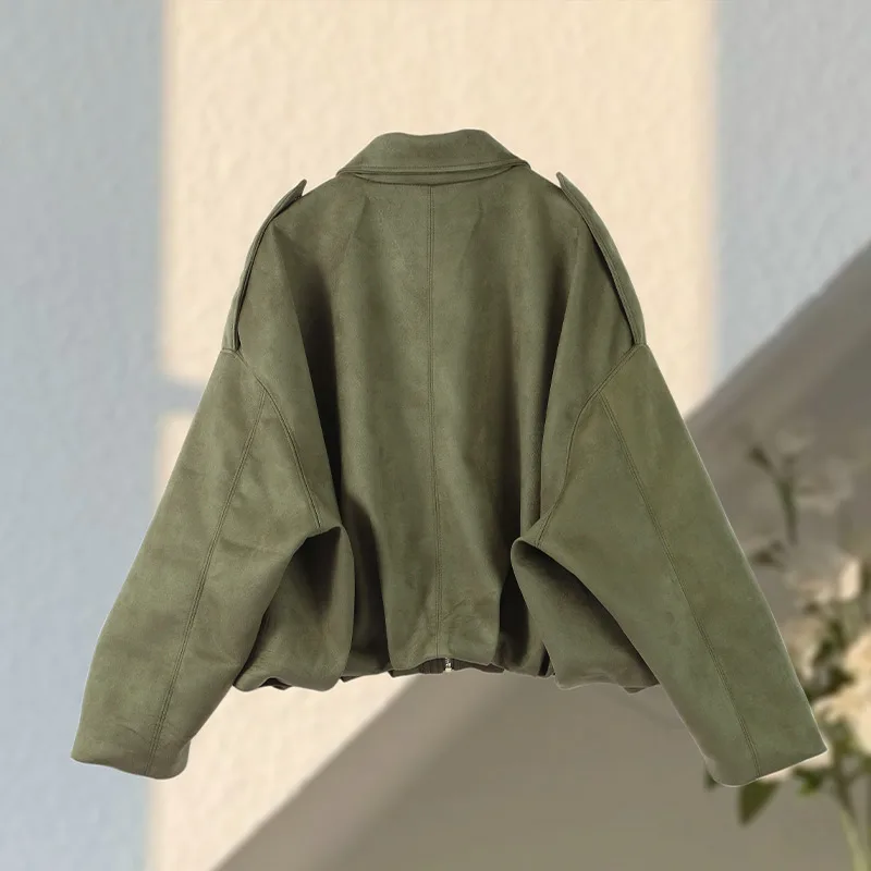 Fashion Green Suede Jacket Women Loose Lapel Zipper Long Sleeve Pockets Bomber Coat 2025 Autumn Lady Motorcycle Outwears
