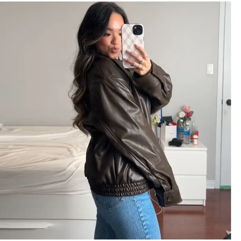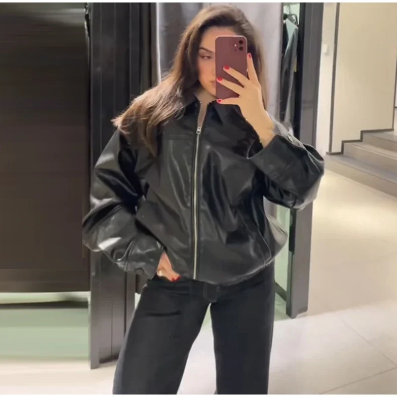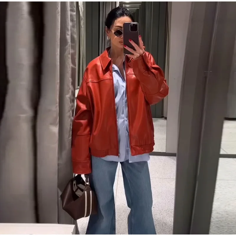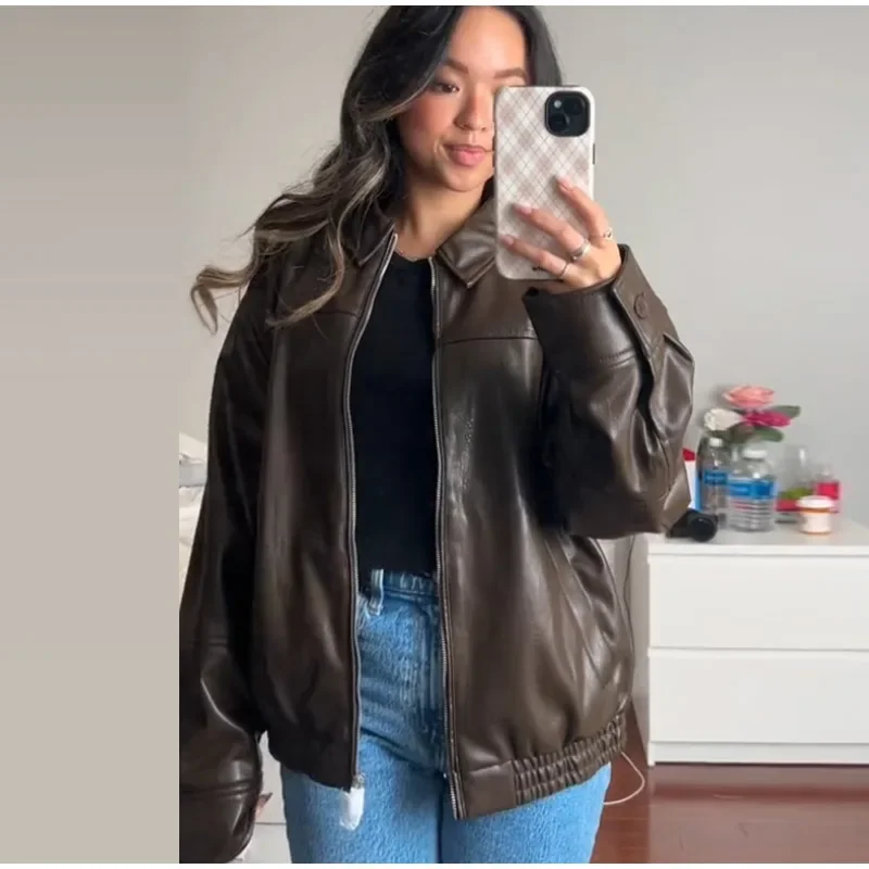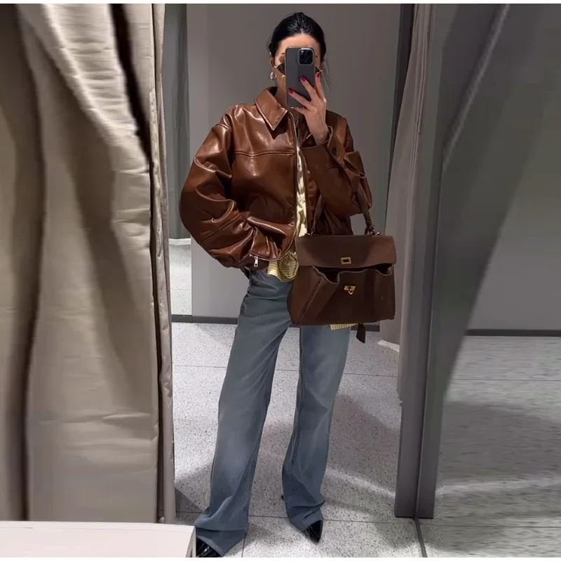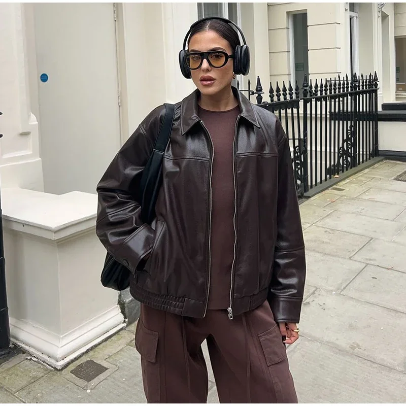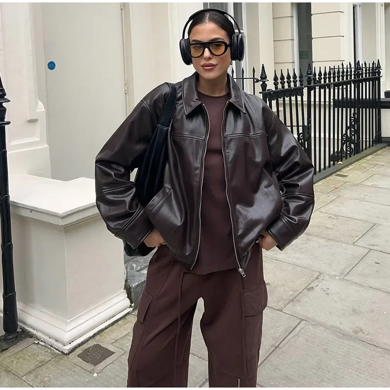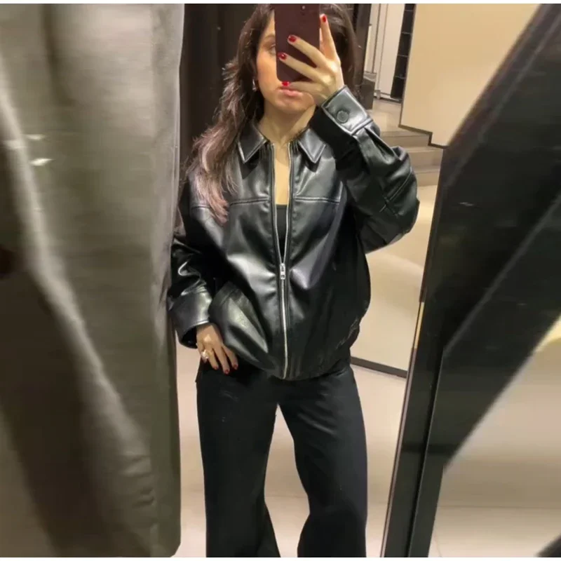 Fashion Leather Coat Women Casual Loose Lapel Zippers Pocket Long Sleeve Female Jacket 2025 Spring High Street Lady Outwear
