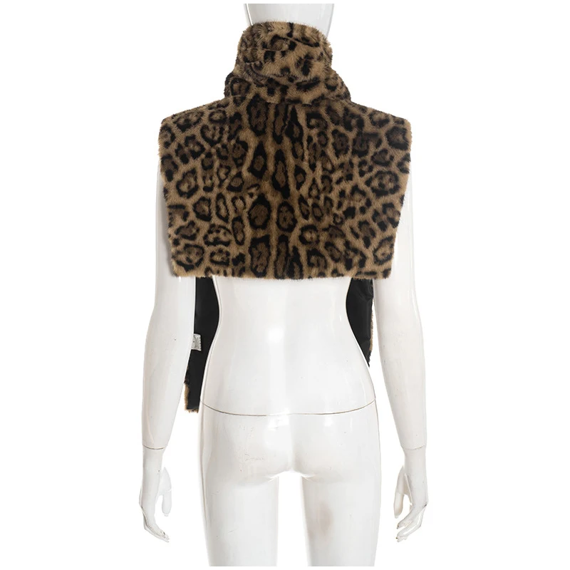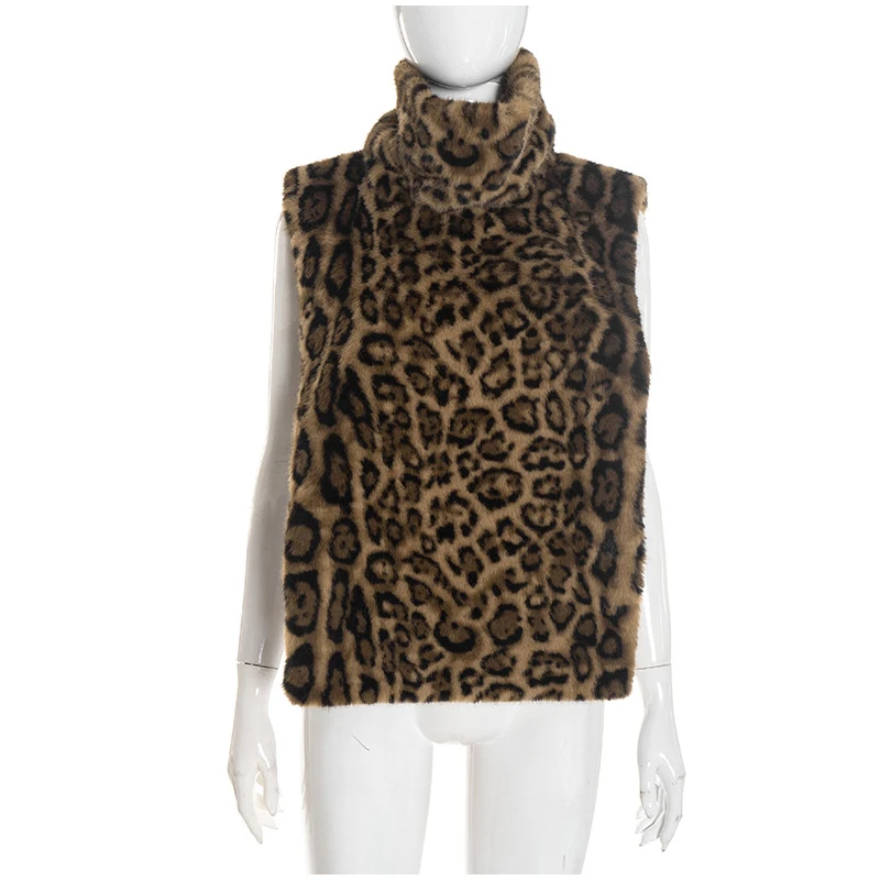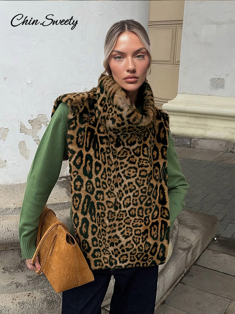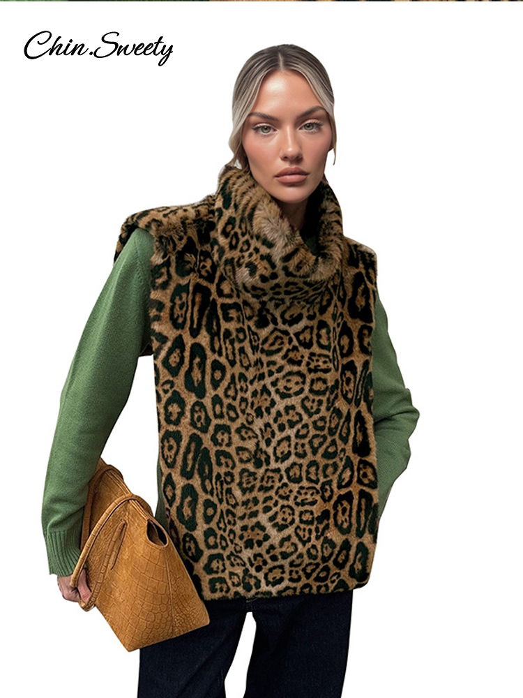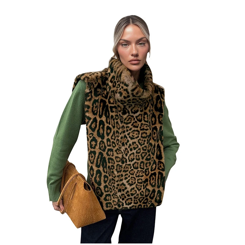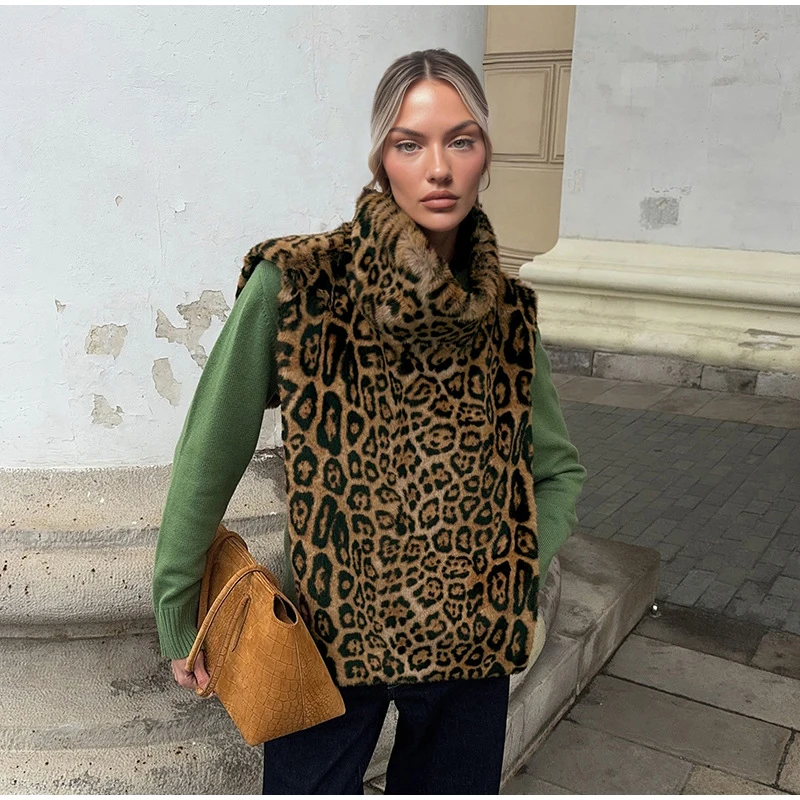Fashion Leopard Print Faux Fur Vests Women High Neck Sleeveless Shawl Plush Tops Lady New Street Vintage Daily Waistcoat 2026