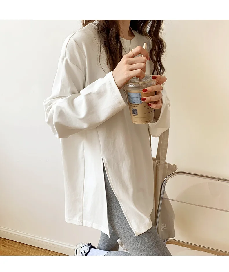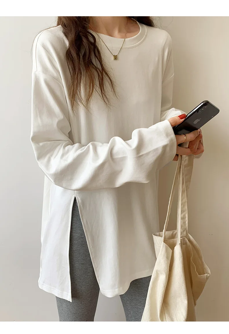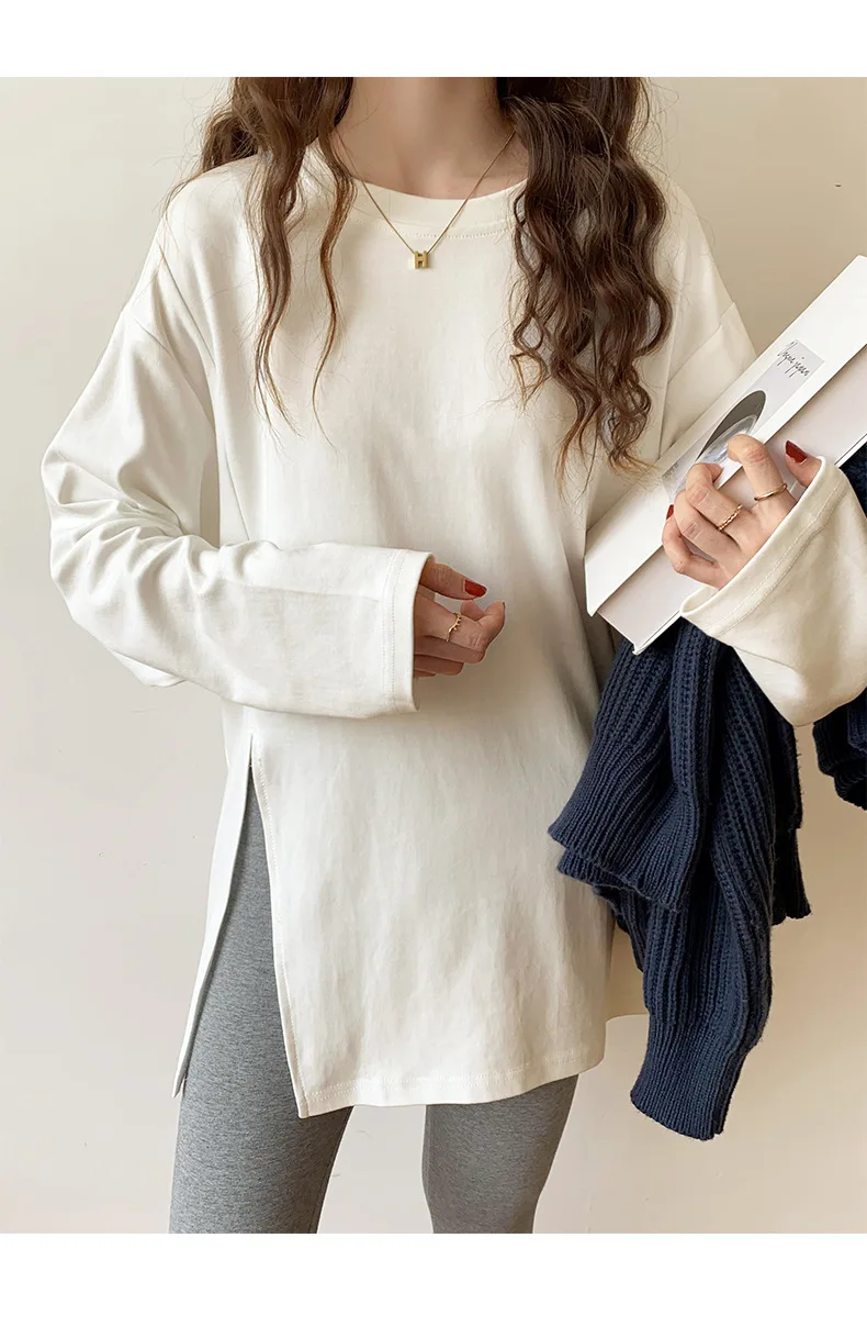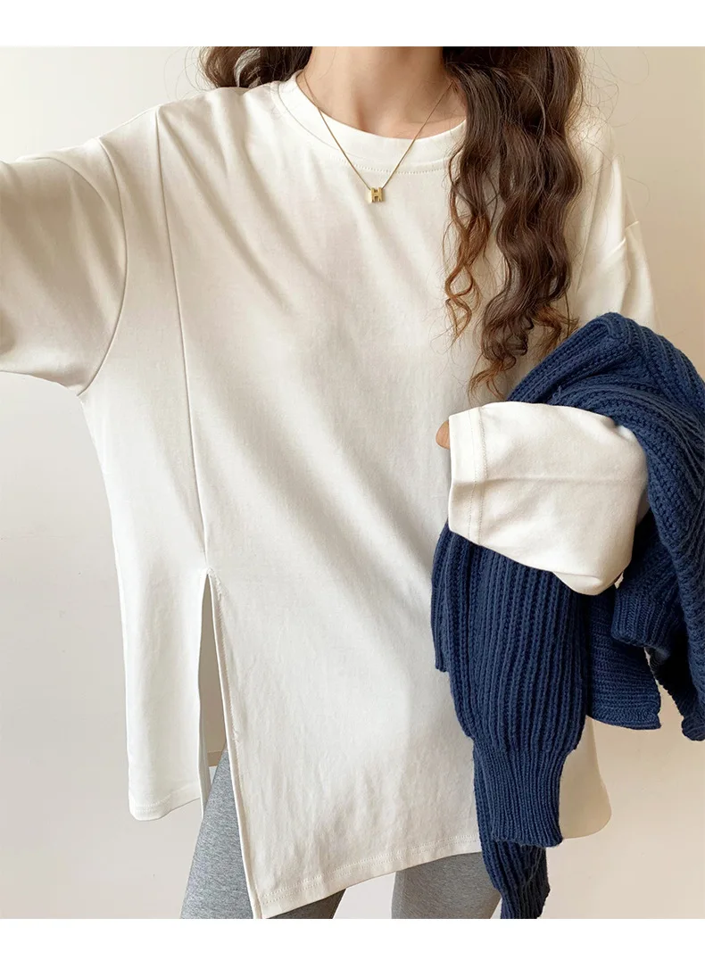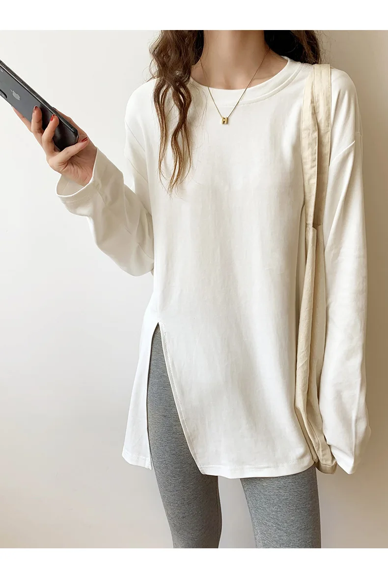 Fashion Long Sleeve T-shirts Women Split Side Loose Cotton Basic Shirt Spring Autumn 2025 White Knit Tops Korean Woman Tshirts