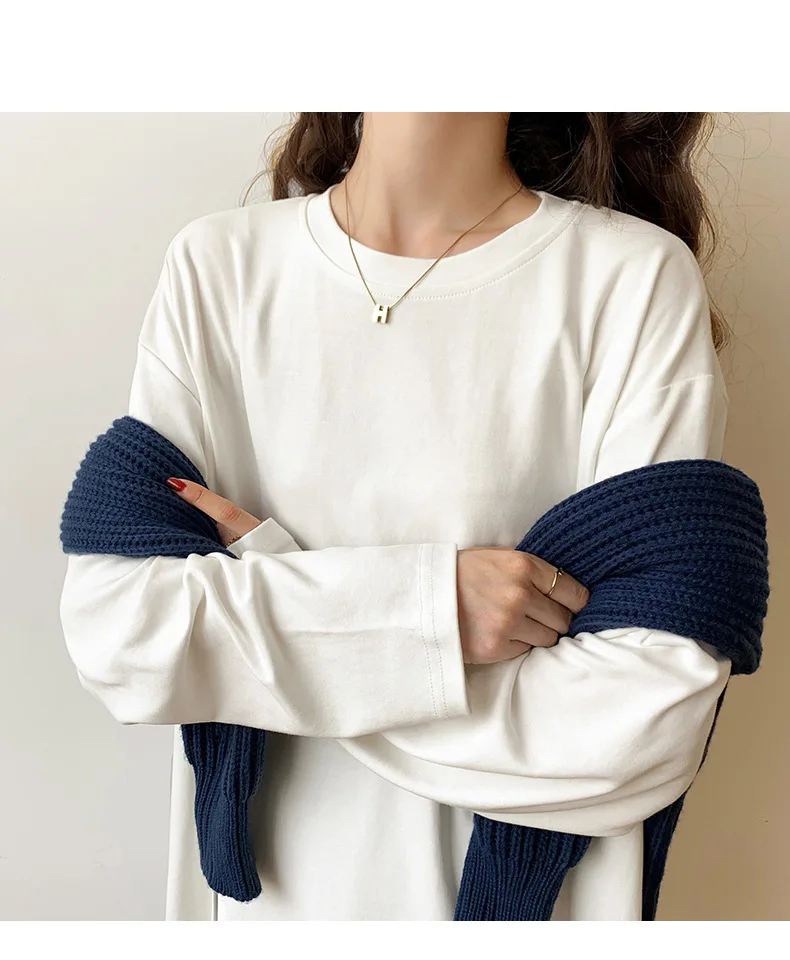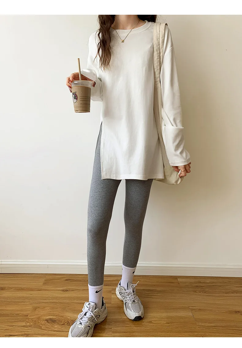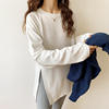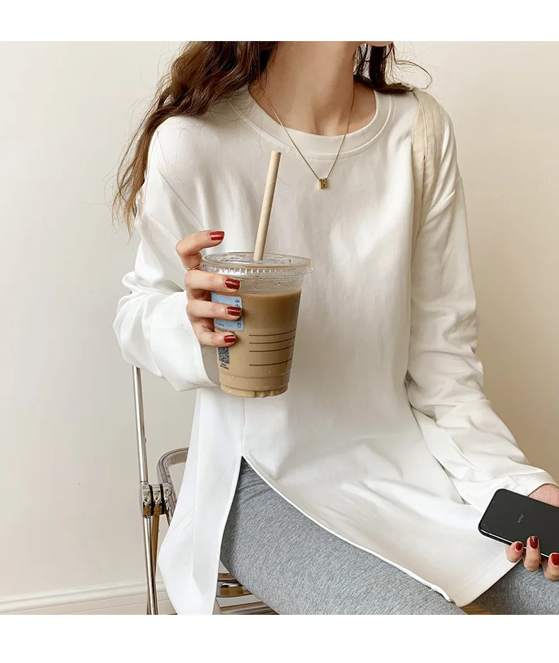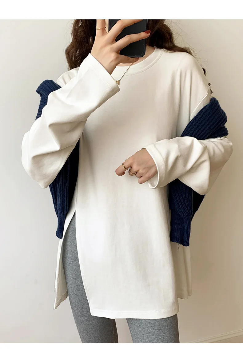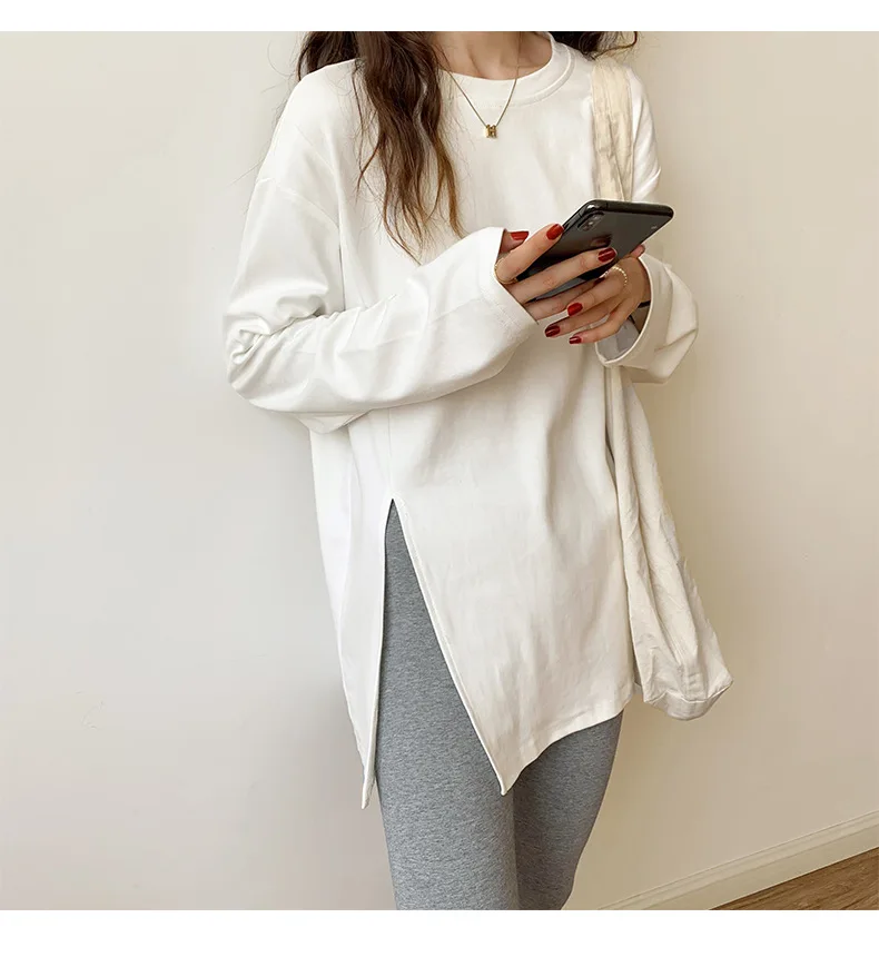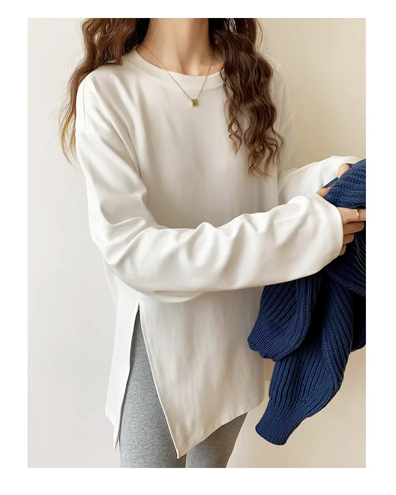 Fashion Long Sleeve T-shirts Women Split Side Loose Cotton Basic Shirt Spring Autumn 2025 White Knit Tops Korean Woman Tshirts