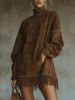 Fashion Retro Suede Tassel Mini Dress High Neck Long Sleeve Pockets Fringe Hem Dress Army Green Brown Autumn Party Dress