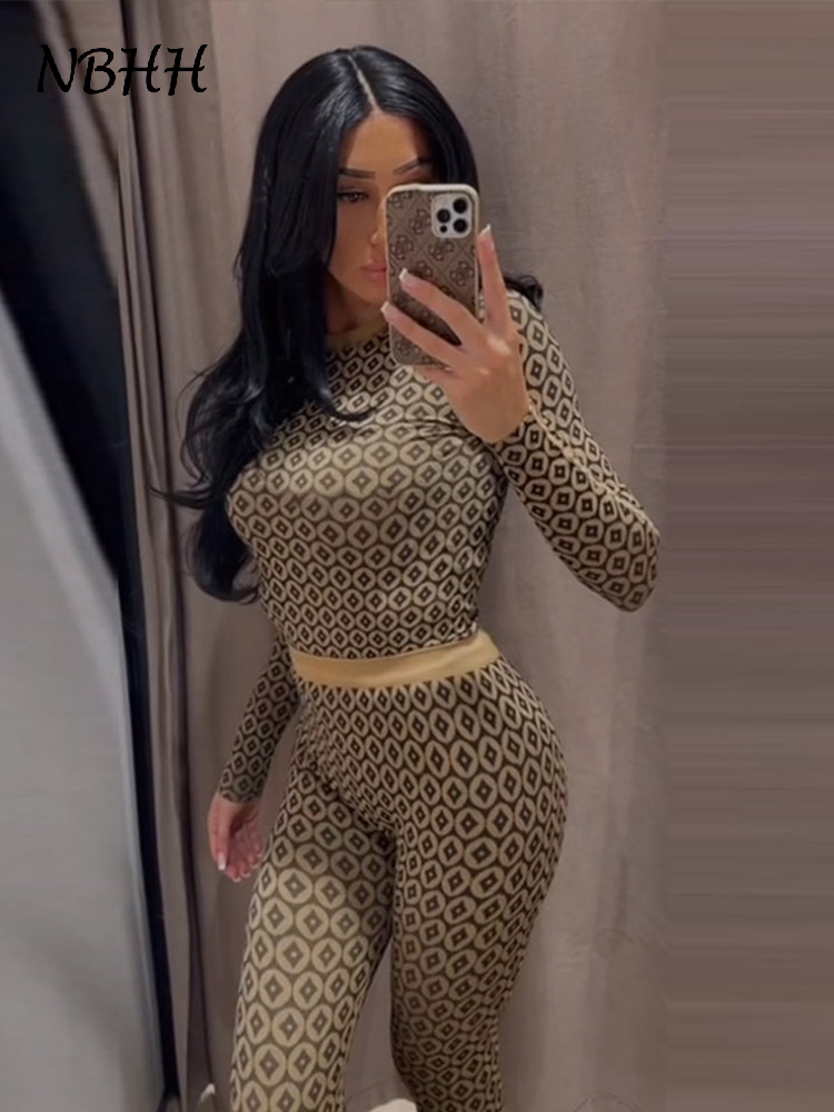 Fashion Slim Print Pants Sets Women Y2K O-neck Long Sleeve Top Stretch Hip Package Pencil Trousers 2025 Spring Sexy Lady Suits