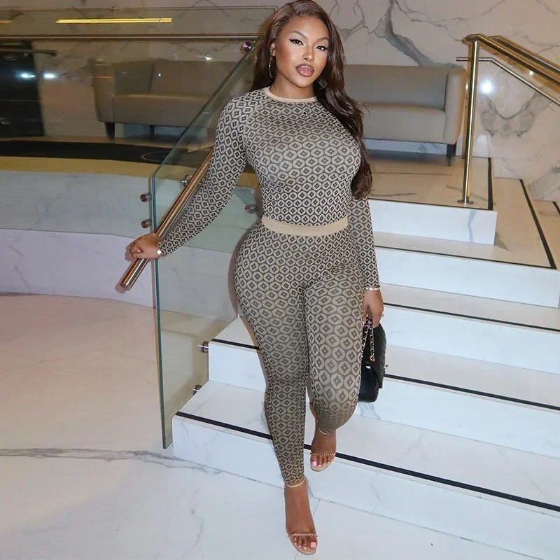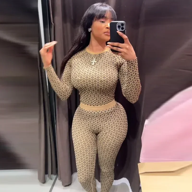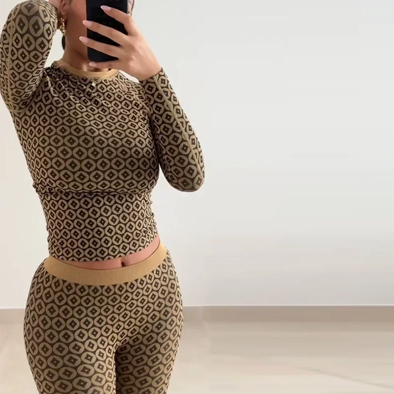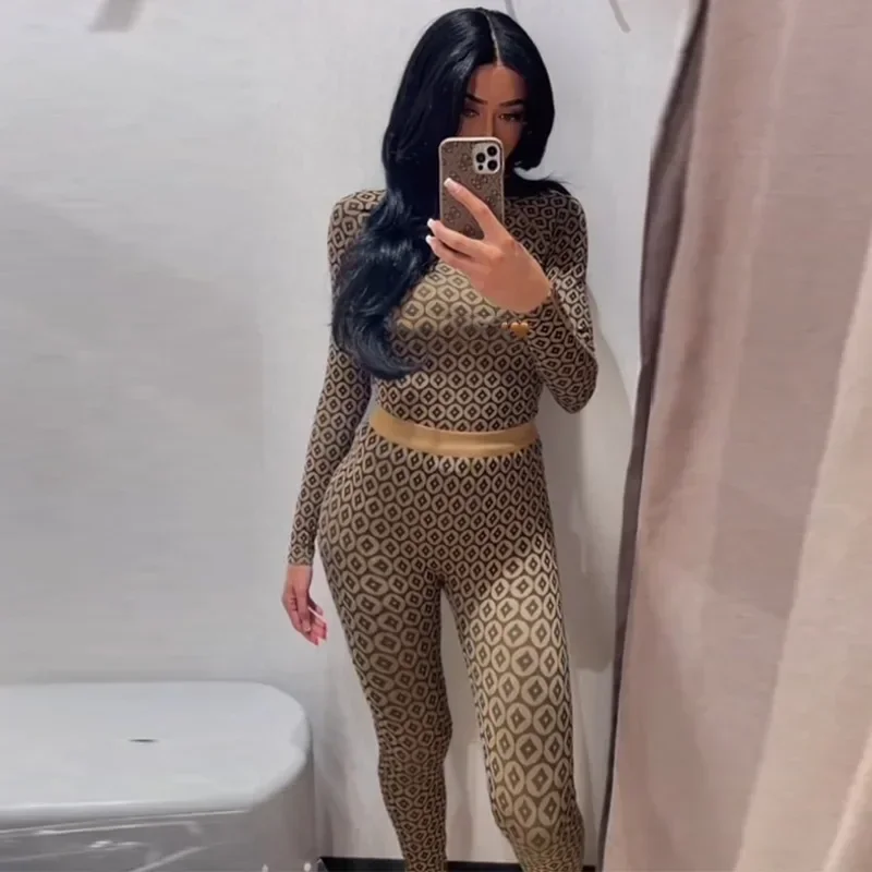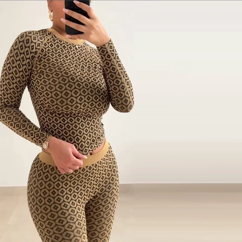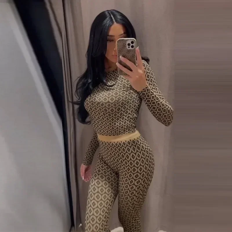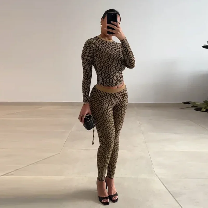 Fashion Slim Print Pants Sets Women Y2K O-neck Long Sleeve Top Stretch Hip Package Pencil Trousers 2025 Spring Sexy Lady Suits