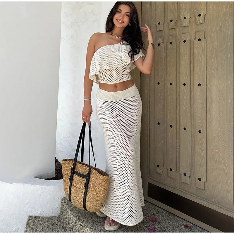 Fashion Solid Knitted Beach Skirt Suit Women Diagonal Collar Hollow Out 2 Pieces Sets Lady New Casual Summer Holiday Outfit 2026
