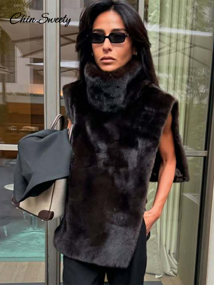 Fashion Turtleneck Furry Waistcoats Women Sleeveless Thick Warm Female Cape Vests 2025 Spring Lady High Street New in Outwears