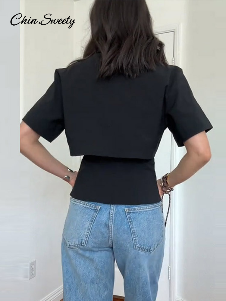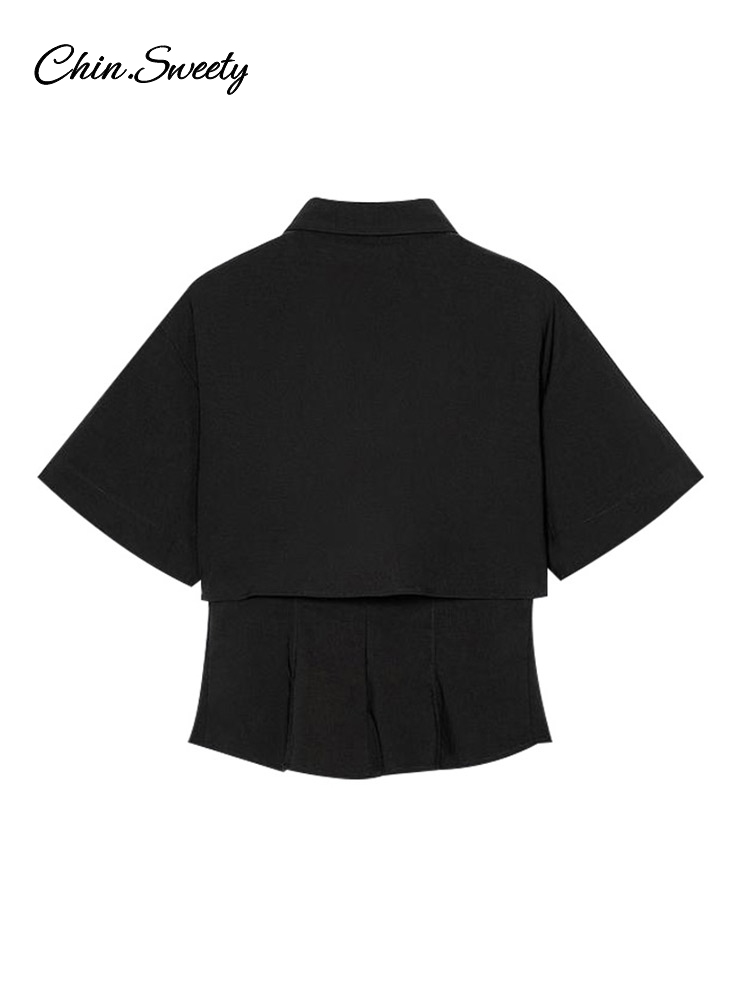 Fashion Women’s Black Shirt Slim Patchwork Lapel Single Breasted Short Sleeve Blouses 2025 Spring Summer All-matching Tops New