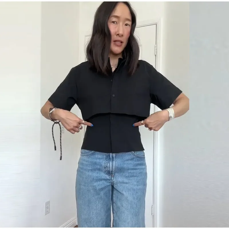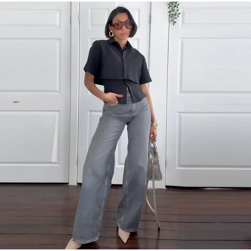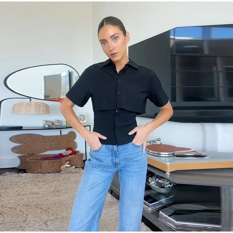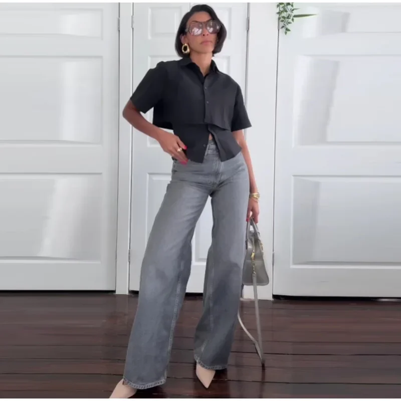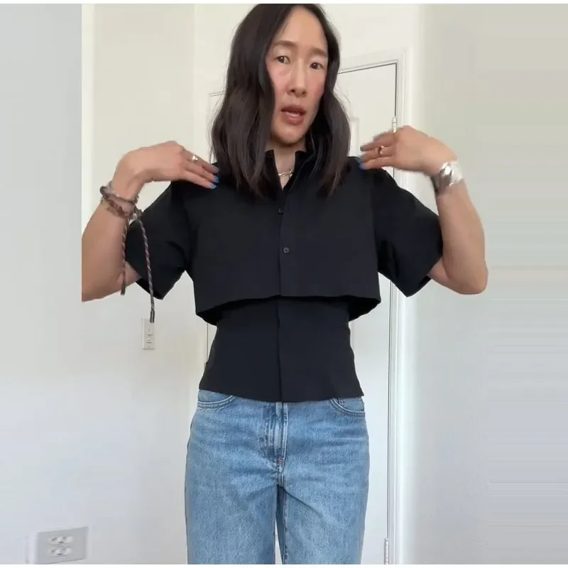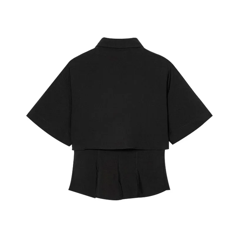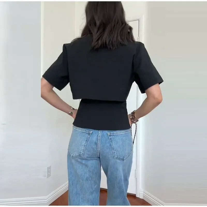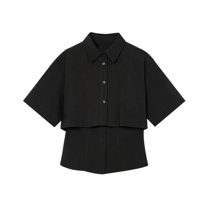 Fashion Women’s Black Shirt Slim Patchwork Lapel Single Breasted Short Sleeve Blouses 2025 Spring Summer All-matching Tops New