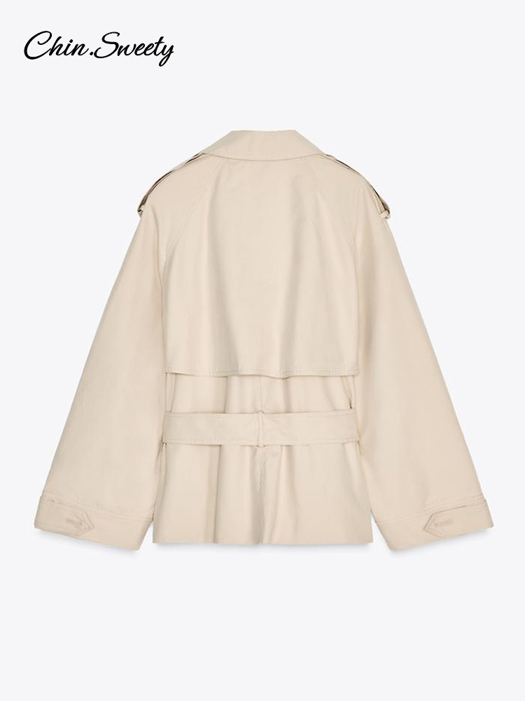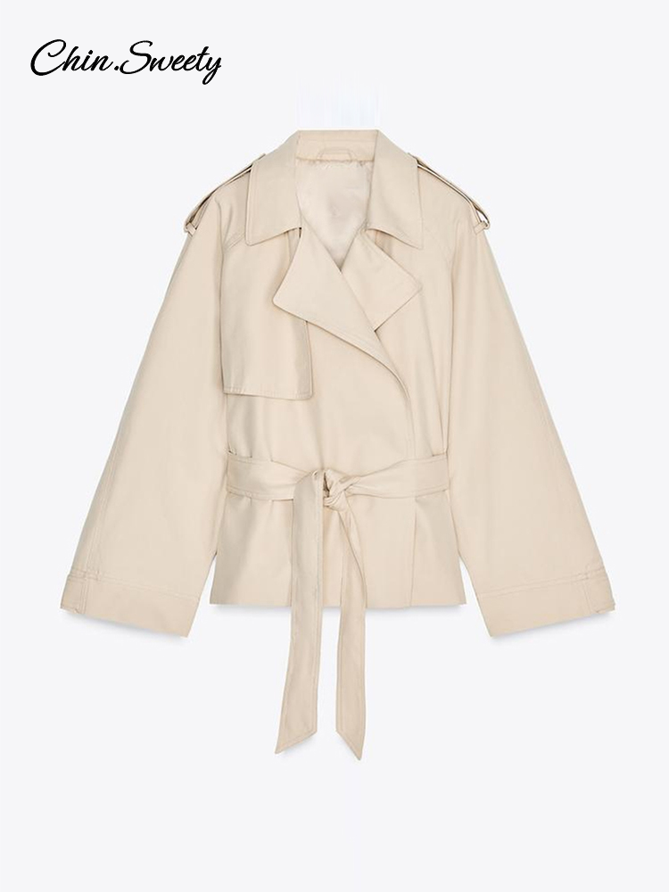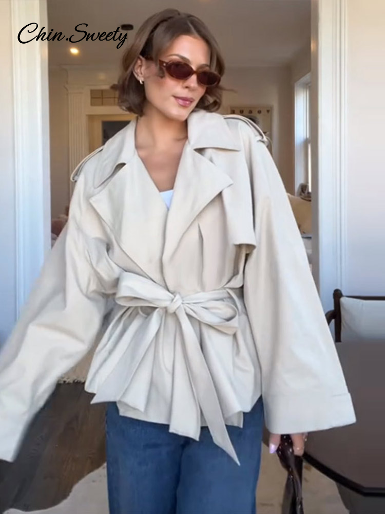 Fashion Women’s Cropped Trench Coat Lace Up Solid Notched Neck Full Sleeves Loose Female Jackets 2025 Spring Lady New Outfits