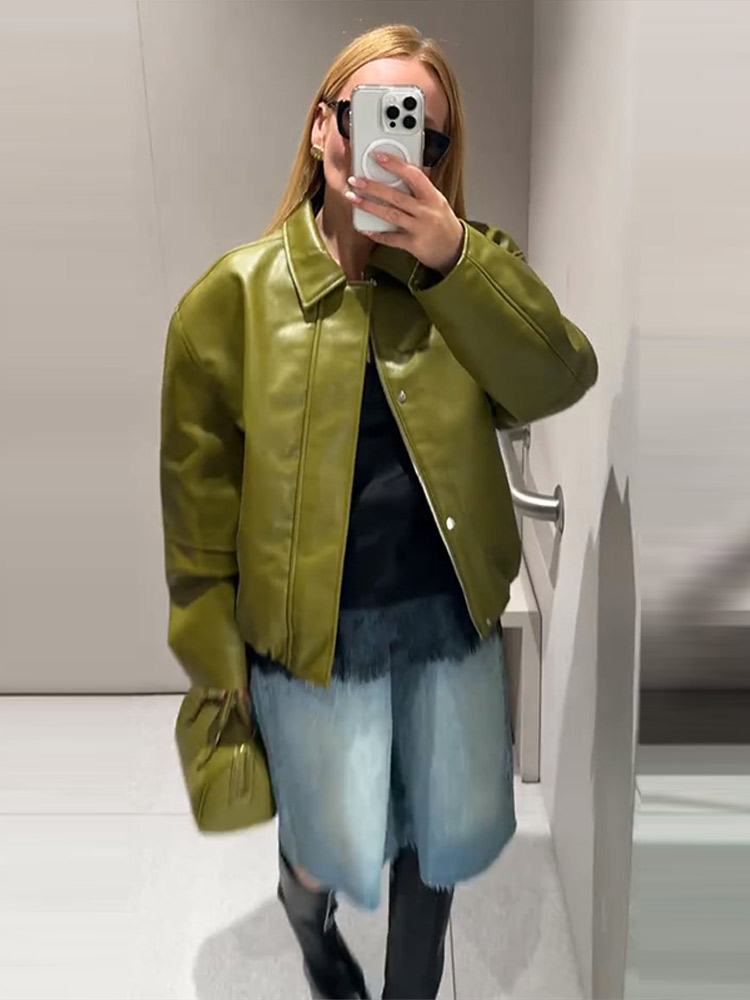 Fashion Women’s Green Leather Jacket Lapel Long Sleeve Zipper Pockets Female Coats 2025 Autumn Winter New Lady Street Outwear