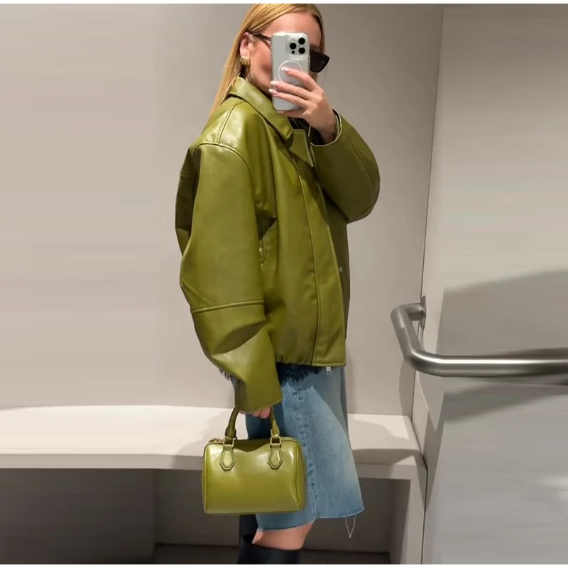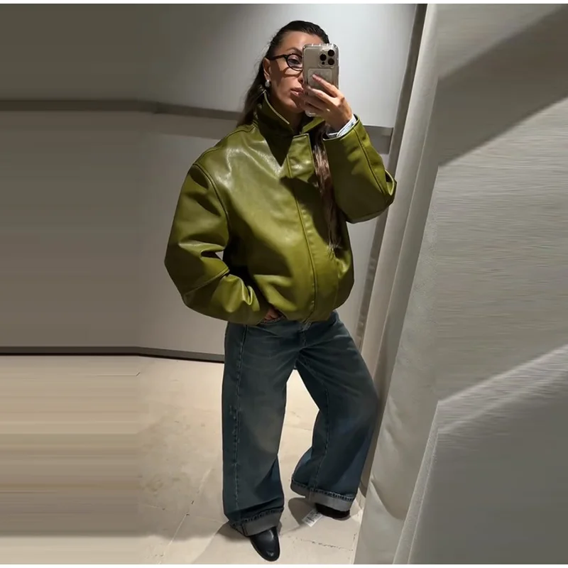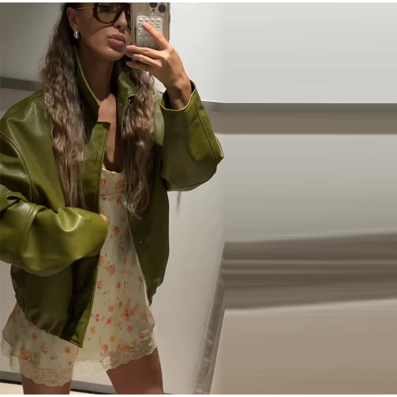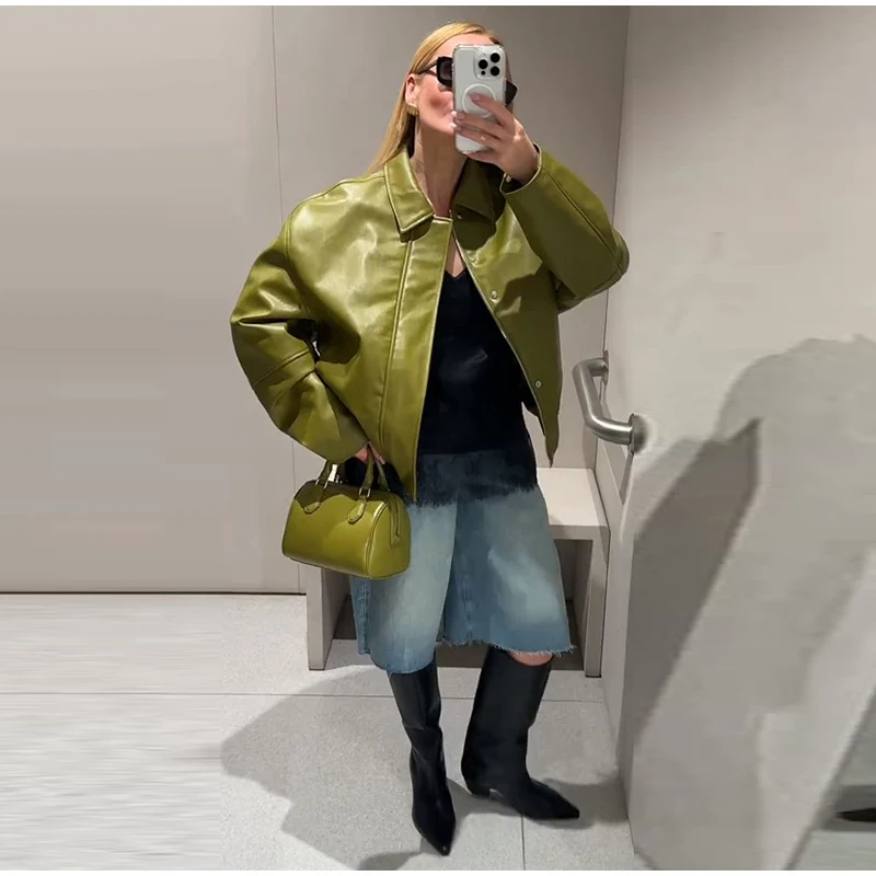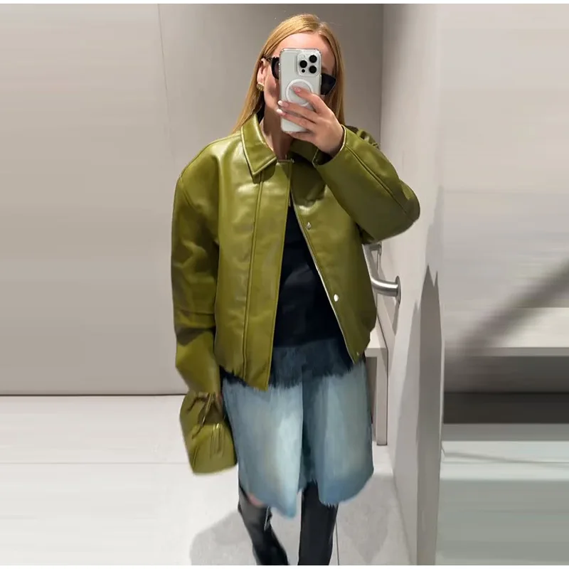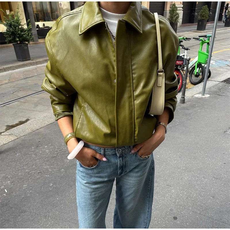 Fashion Women’s Green Leather Jacket Lapel Long Sleeve Zipper Pockets Female Coats 2025 Autumn Winter New Lady Street Outwear