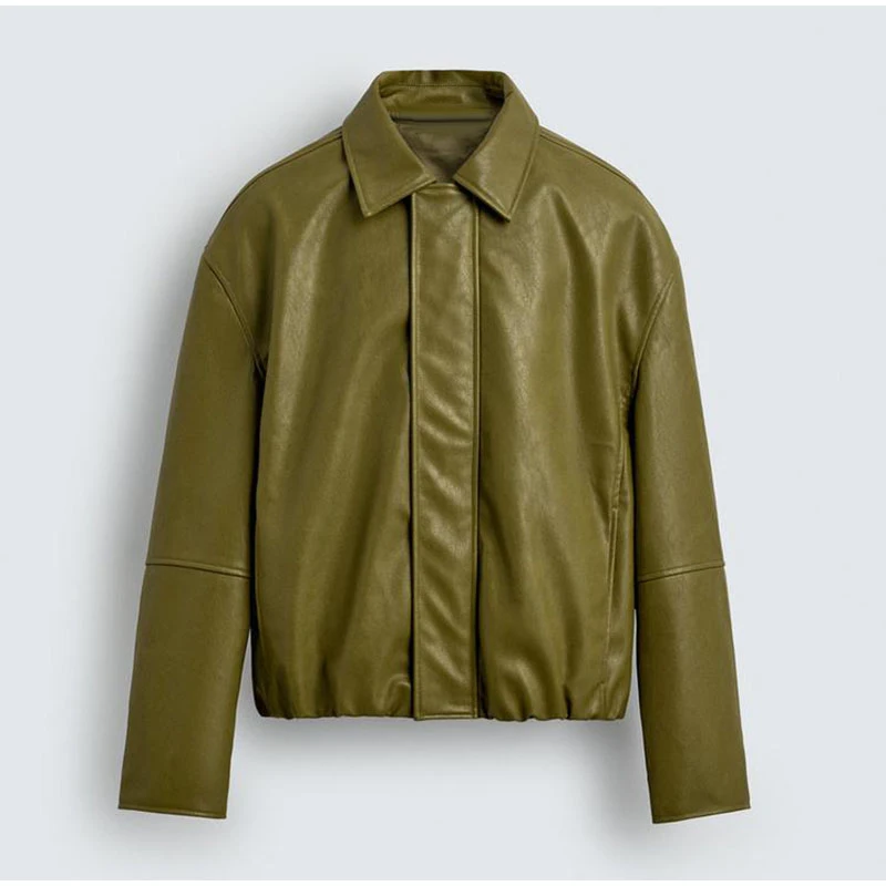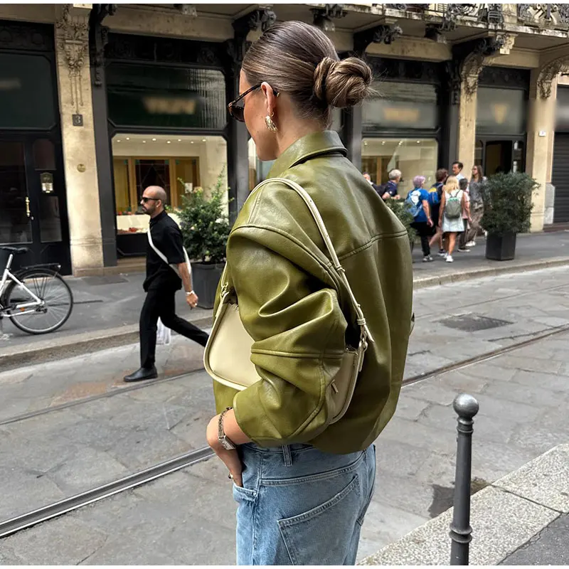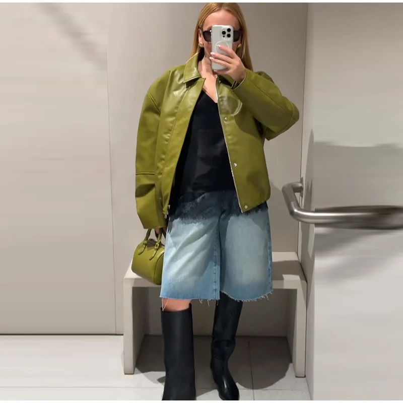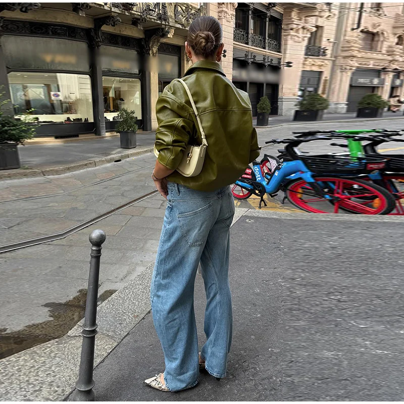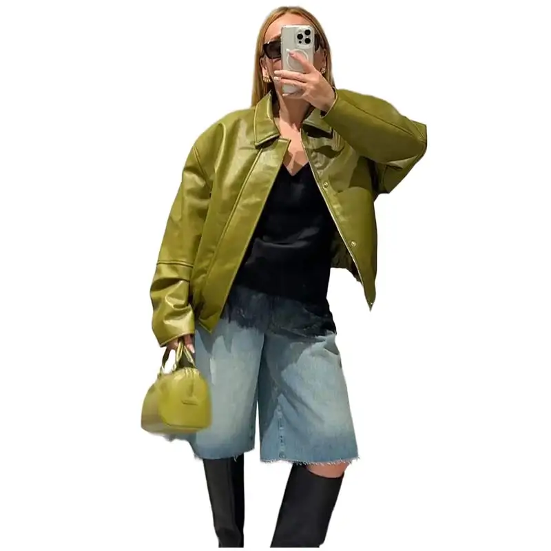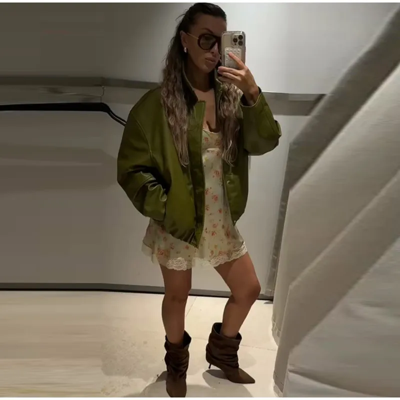 Fashion Women’s Green Leather Jacket Lapel Long Sleeve Zipper Pockets Female Coats 2025 Autumn Winter New Lady Street Outwear