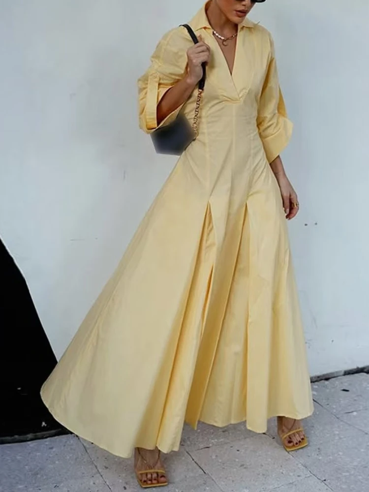 Fashion Women’s Pleated Dress Long Sleeve Turn-Down Collar V Neck Lady A-Line Dresses 2025 Spring Autumn Casual Female Vestdios