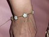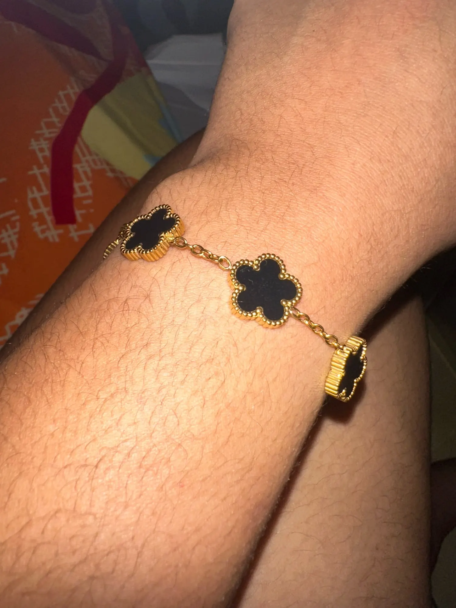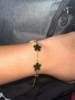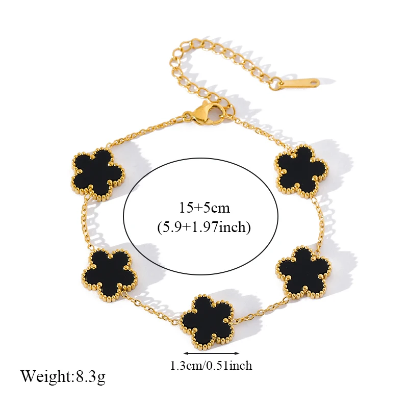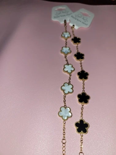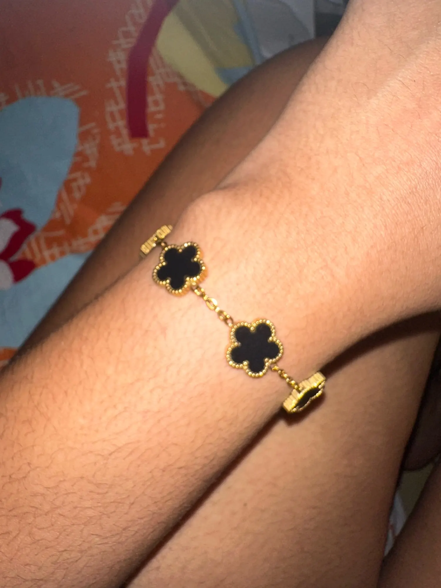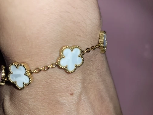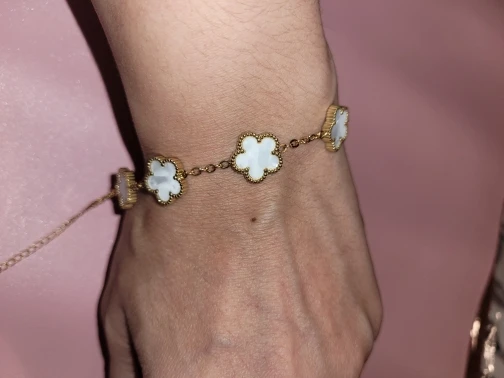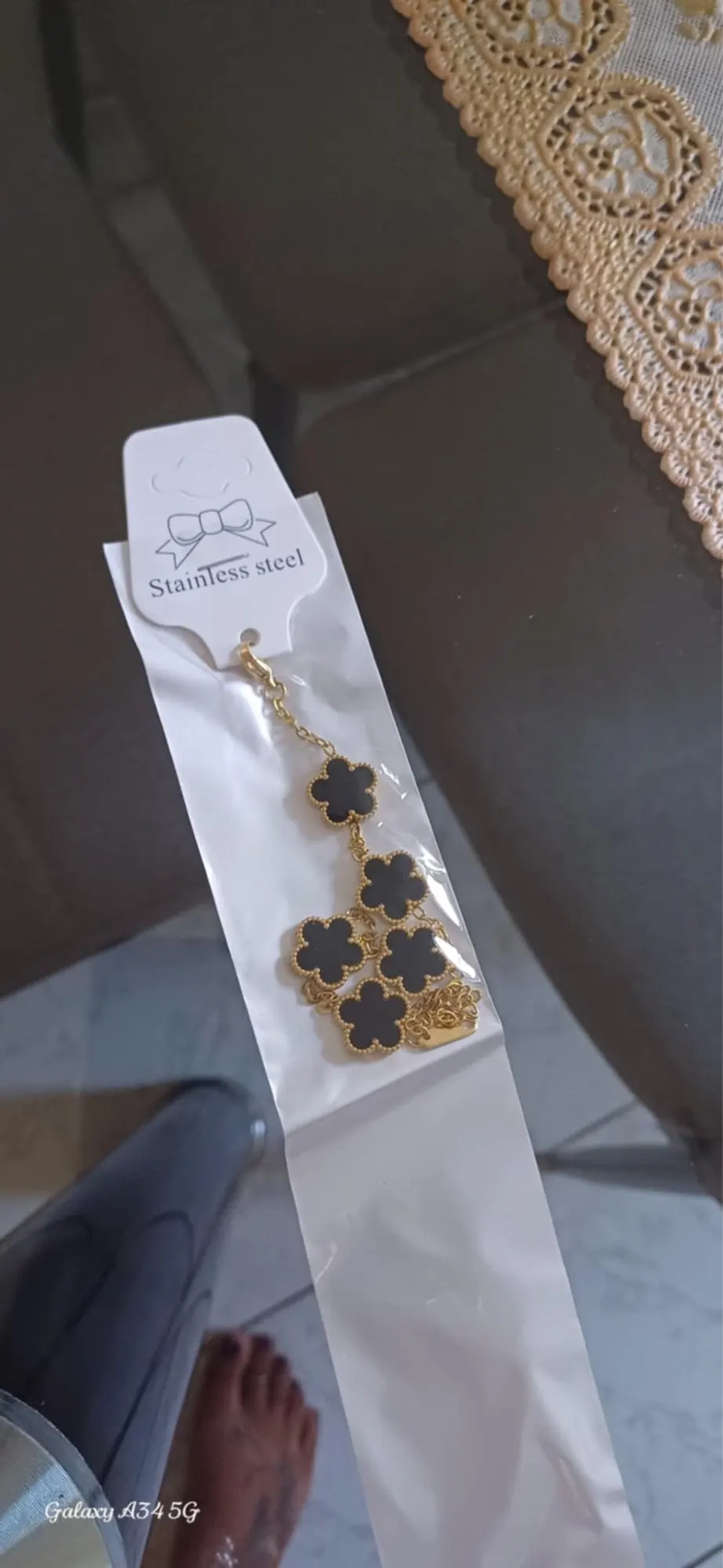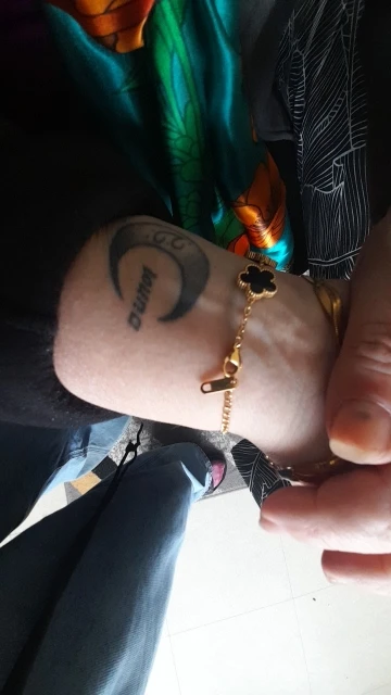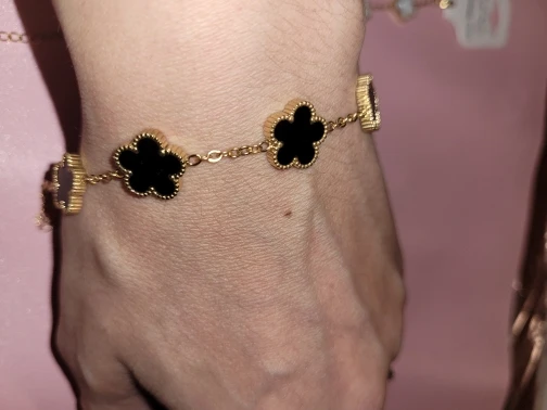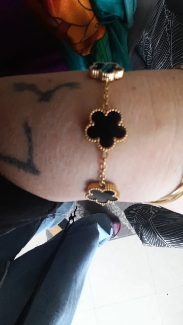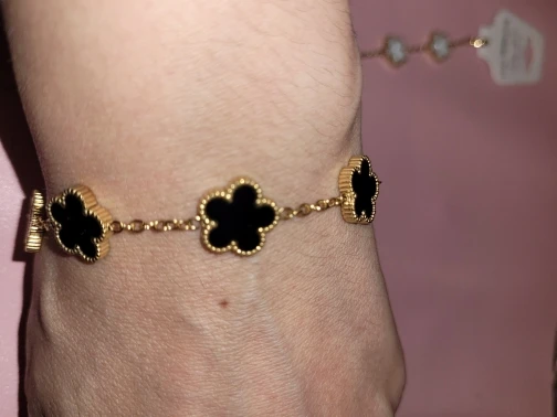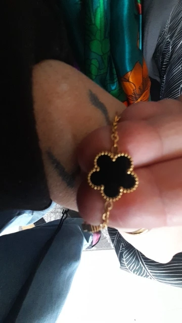 Received today well packaged. The bracelet is very pretty, the finishes are correct, the links are a bit too yellow but well, the black in the flowers is great, smooth and shiny. I recommend the product. We'll have to wait and see if it doesn't turn green over time.