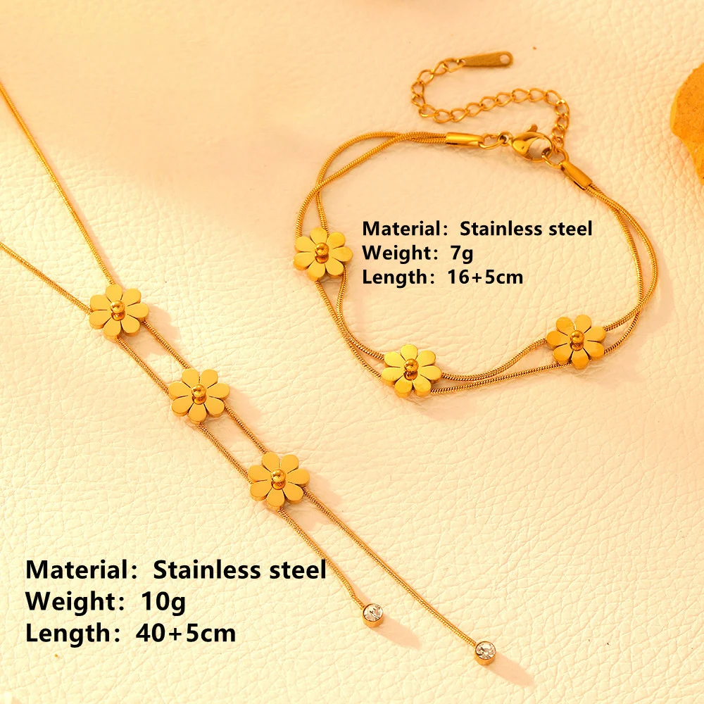 GANEMLY 316L Stainless Steel Metal Flower Pendant Necklace Bracelet Set For Women Trendy Gold Color Waterproof Jewelry Lady Gift