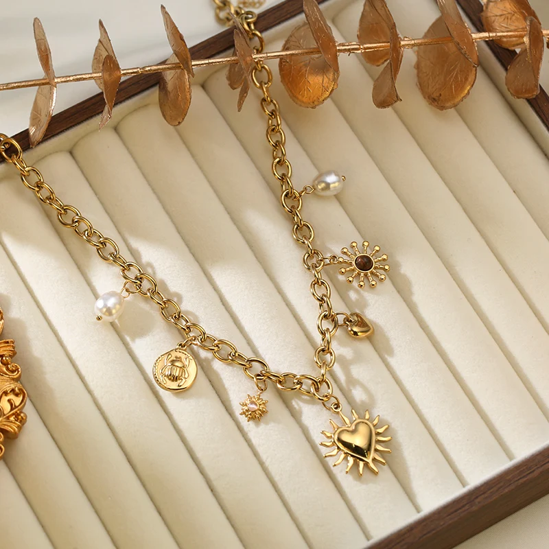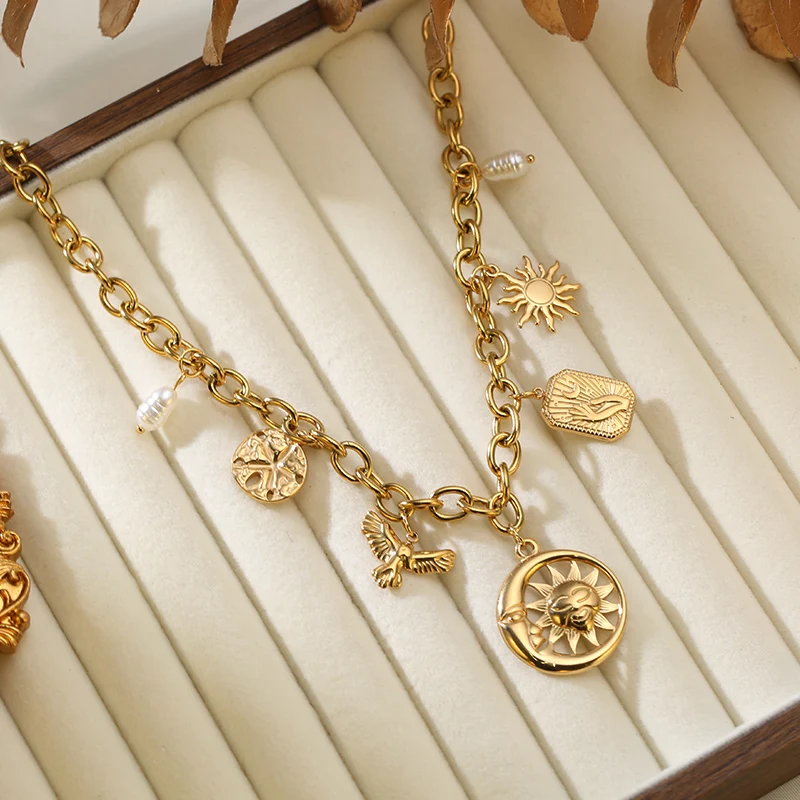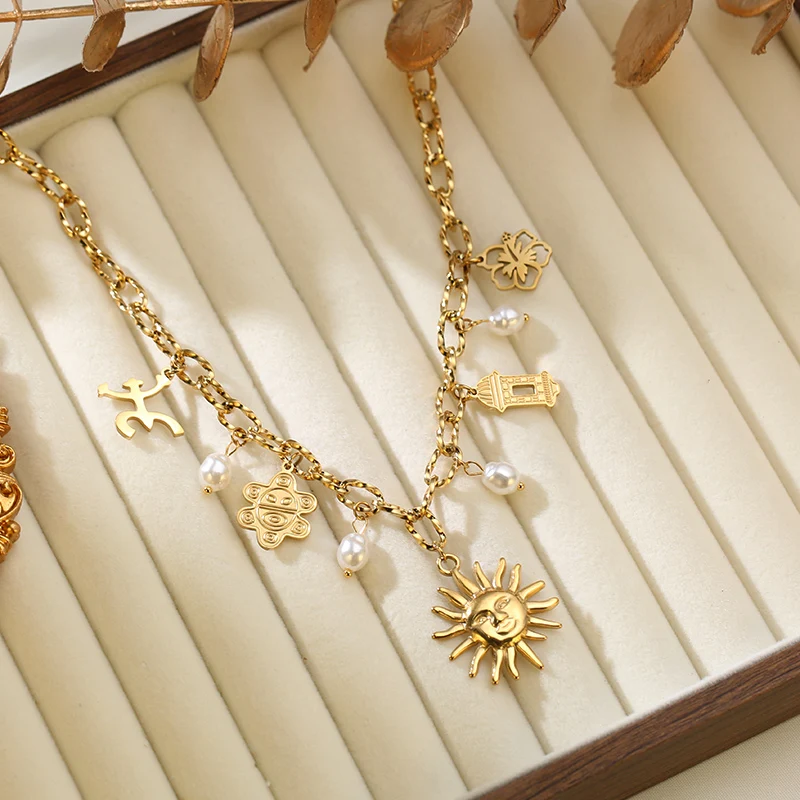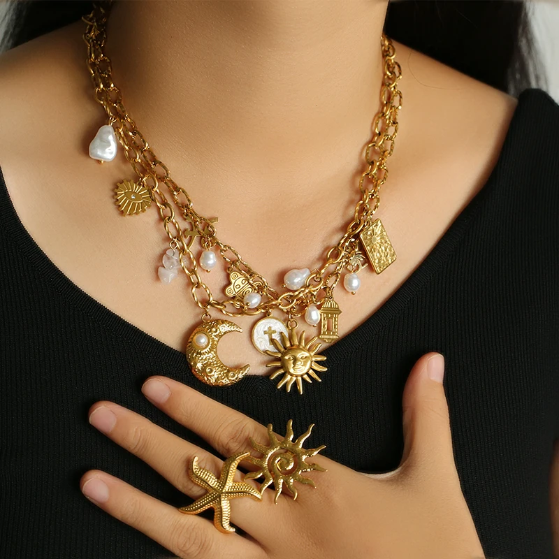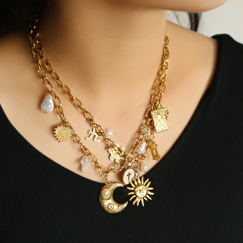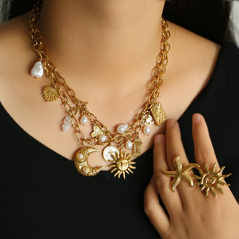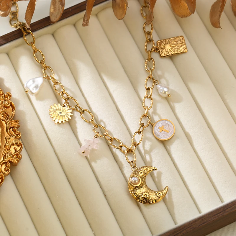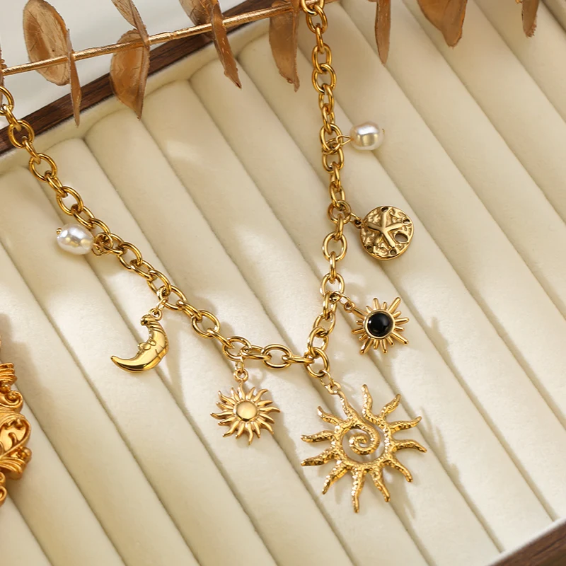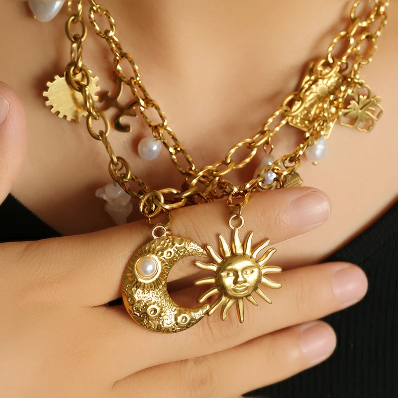GANEMLY 316L Stainless Steel Moon Sun Pendant Necklace for Women Bohemian Style Handmade Neck Chain Waterproof Jewelry Gift